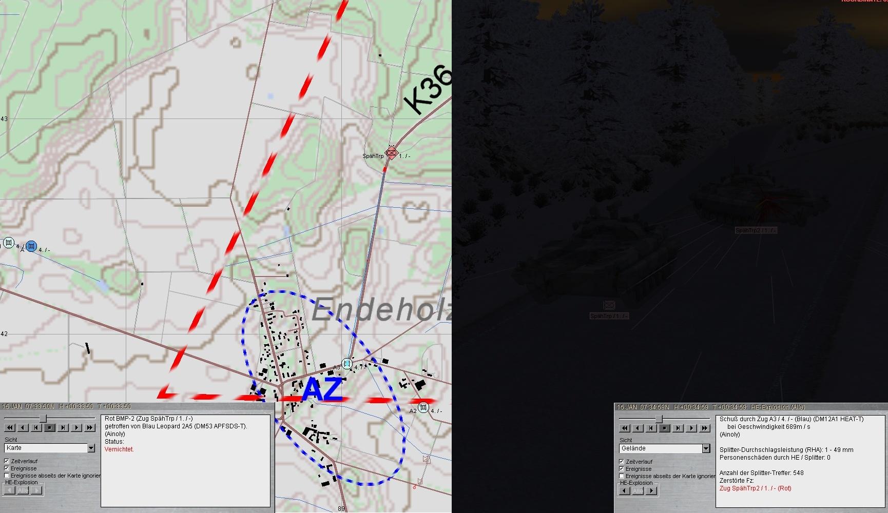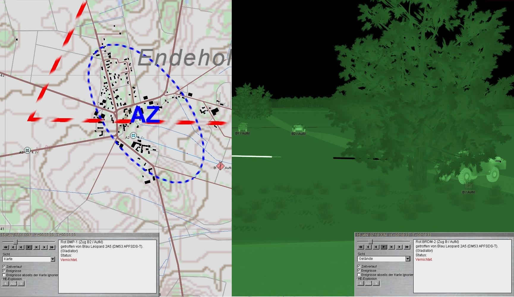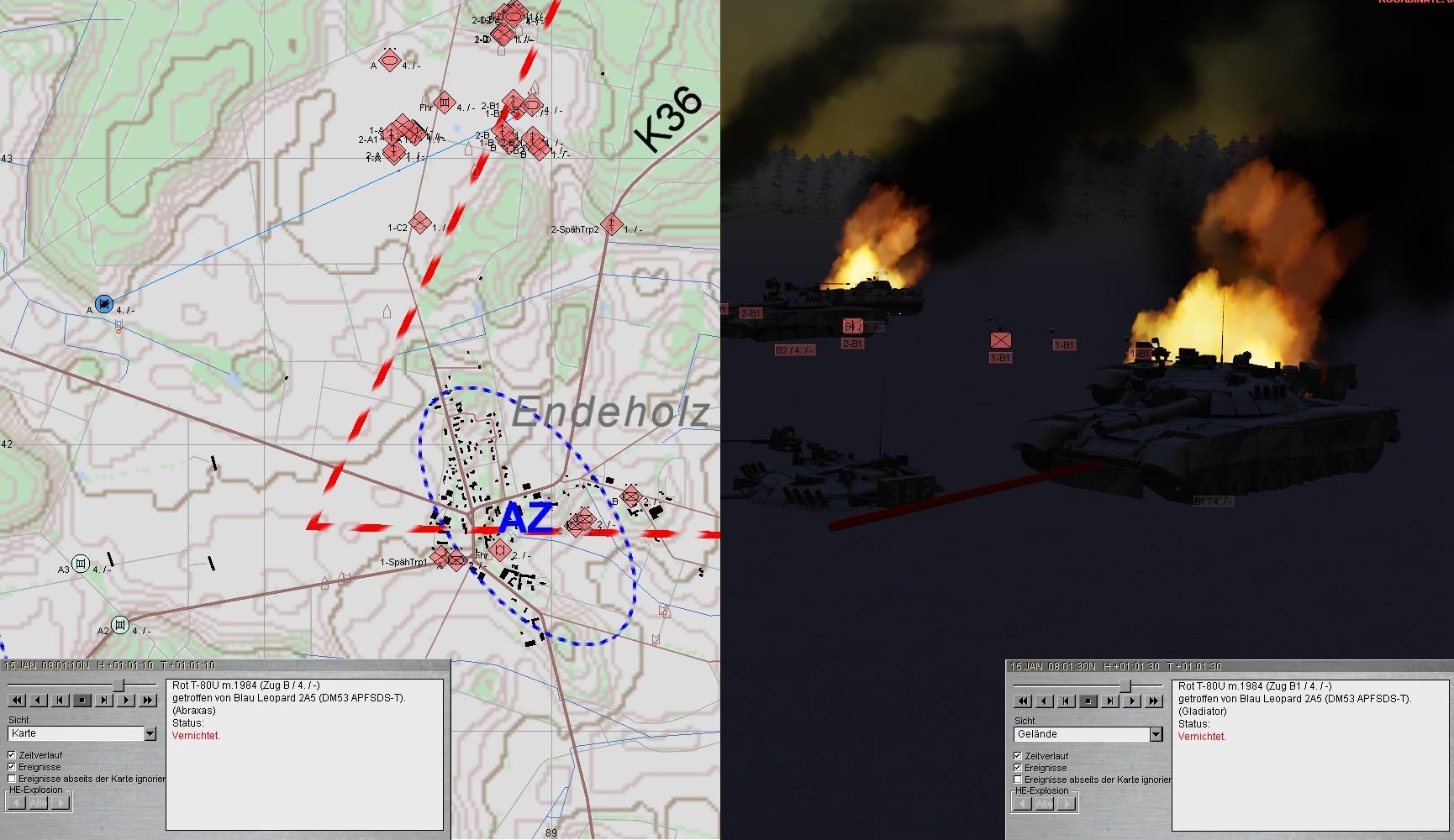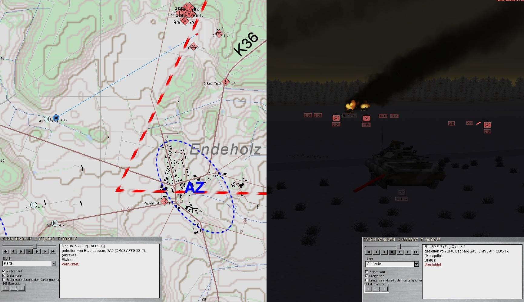 A entschied daher, dass der PzZg bei nächstem Feind ausweicht. Kaum war dies befohlen und die Leos nachmunitioniert, meldete A2 "Feindpanzer", T-80! Eine weitere BMP-Kp griff südlich ENDEHOLZ zudem an.