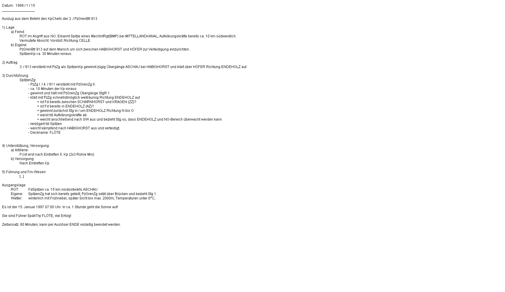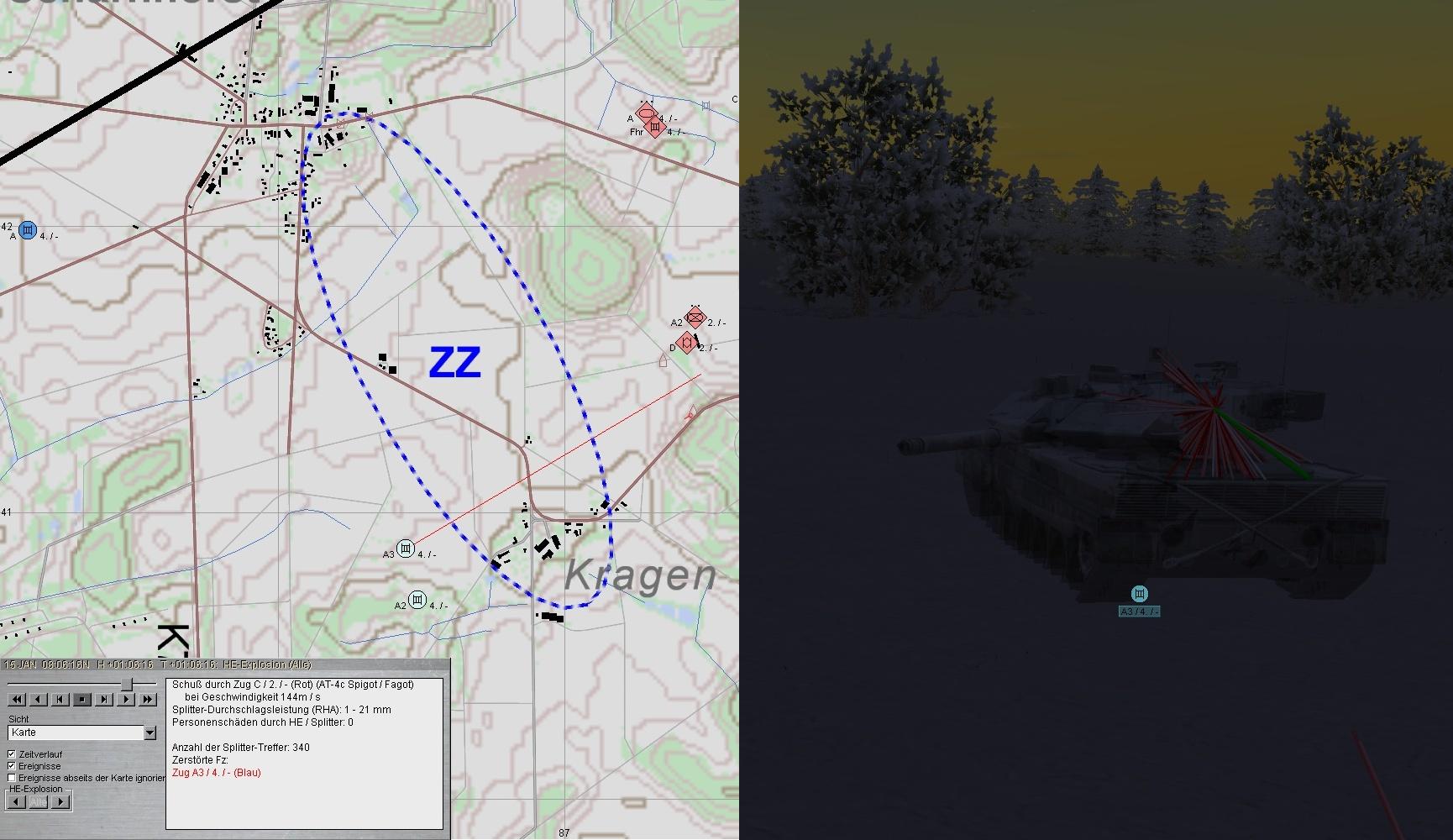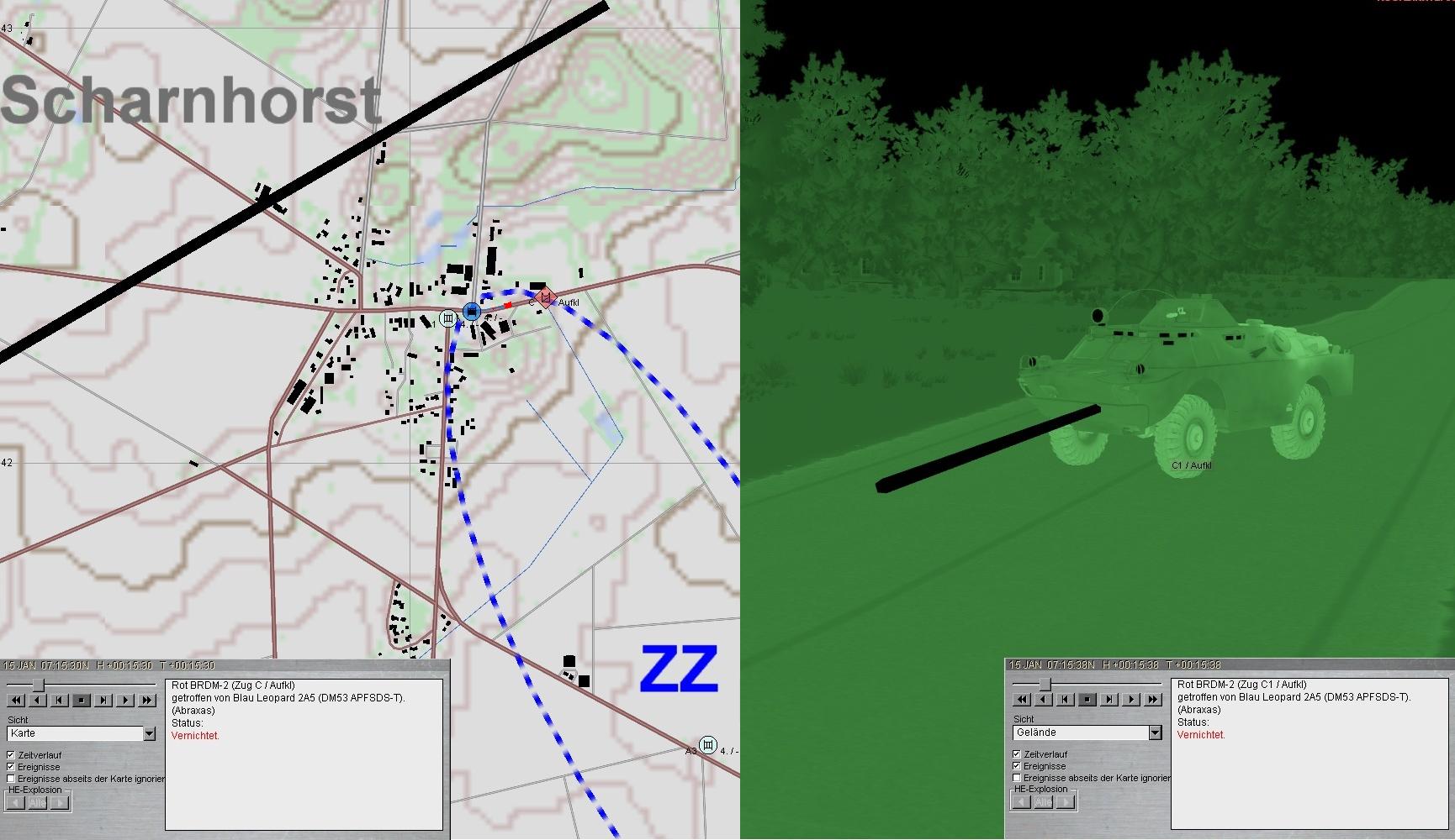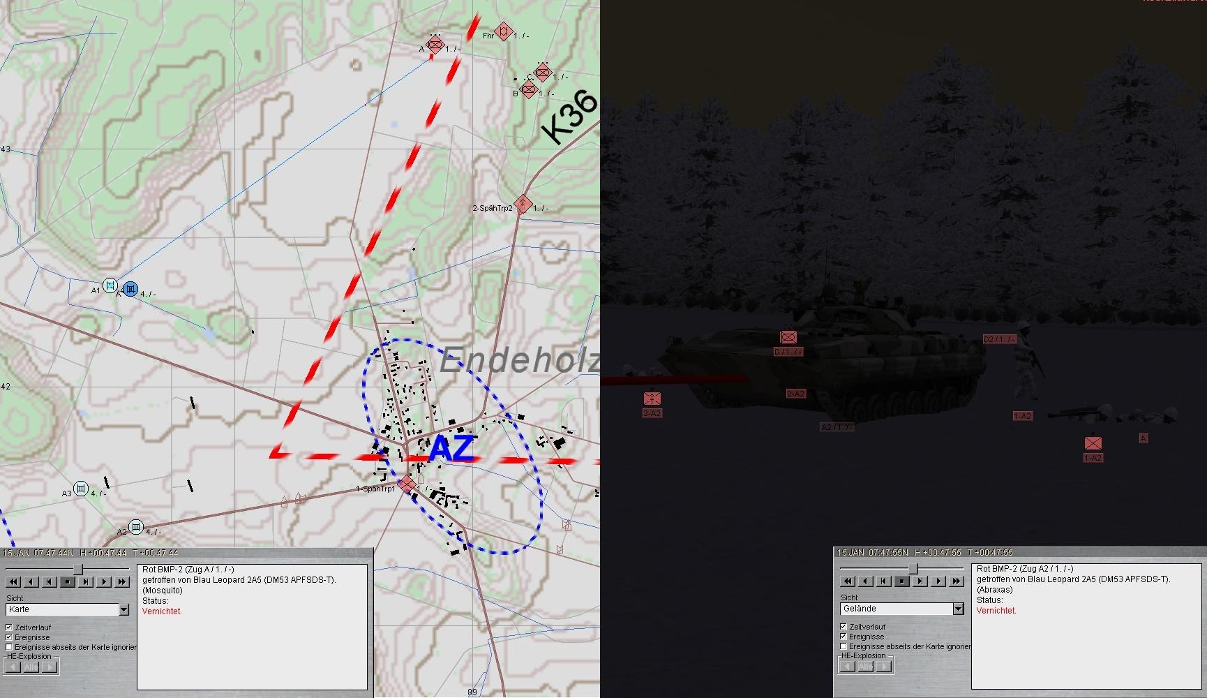 A entschied daher, dass der PzZg bei nächstem Feind ausweicht. Kaum war dies befohlen und die Leos nachmunitioniert, meldete A2 "Feindpanzer", T-80! Eine weitere BMP-Kp griff südlich ENDEHOLZ zudem an.
