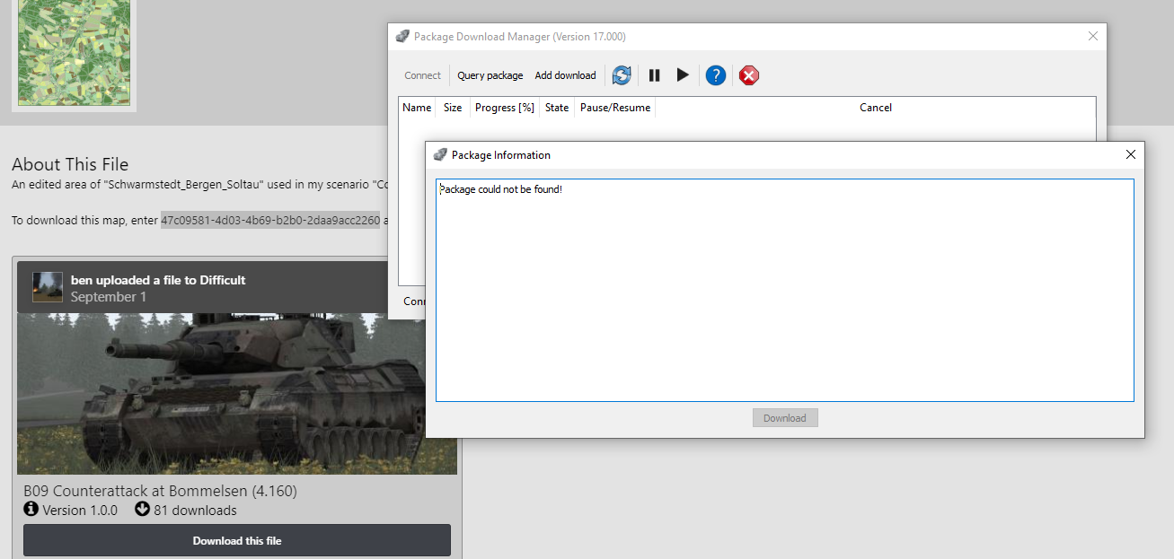 Ich wollte ein Szenario von SB.com ausprobieren. Dazu benötige ich eine neue Karte, die via SB Maps Downloader verfügbar sein soll. (Link: https://www.steelbeasts.com/fi…unterattack-at-bommelsen/) Wenn ich nun aber den UID in den Map-Downloader einfüge, erhalte ich die Meldung: "Package not found".