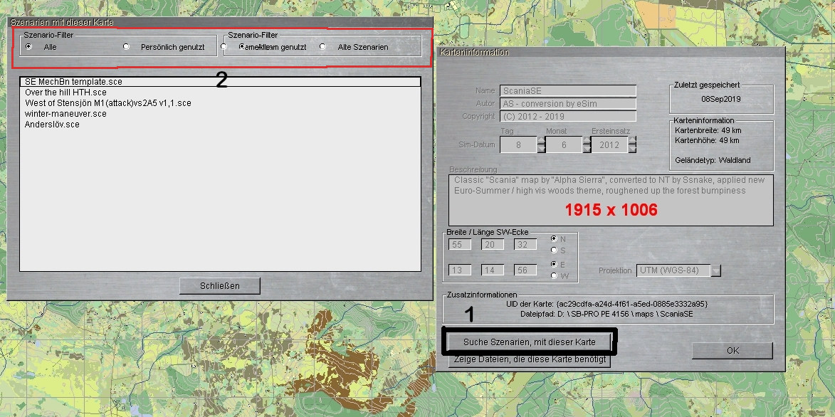 Nachdem ich die ScaniaSE Karte heruntergeladen hatte, wollte ich (mit der Taste 1 im Bild) wissen, in welchen Szenarien diese gebraucht wird. Es öffnete sich das 2. Fenster. Aber mit diesem Bereich kann ich nun dar nichts