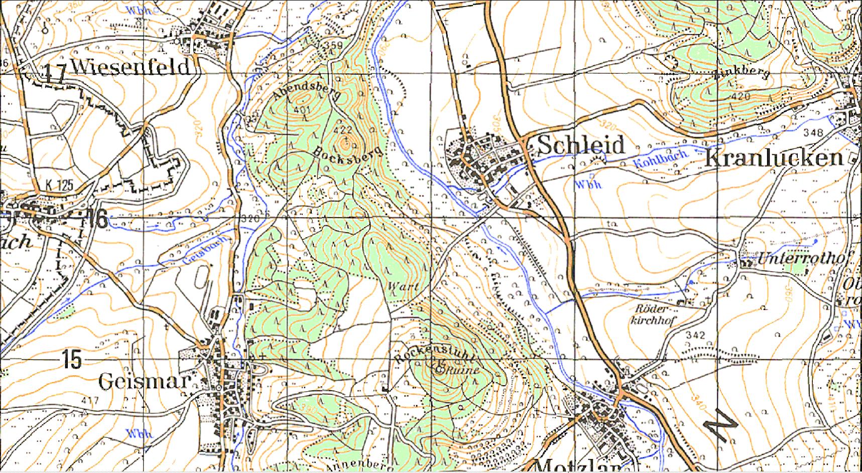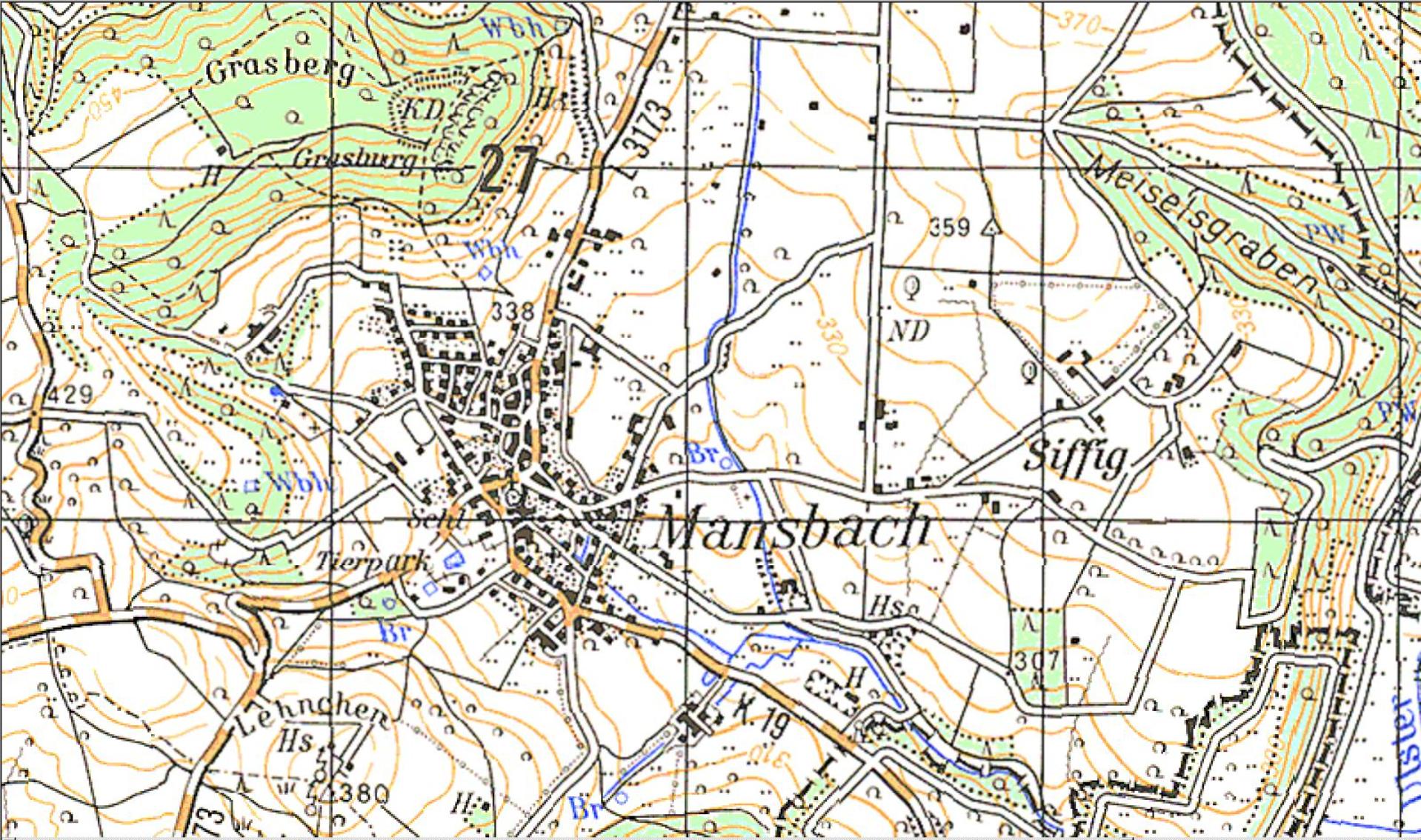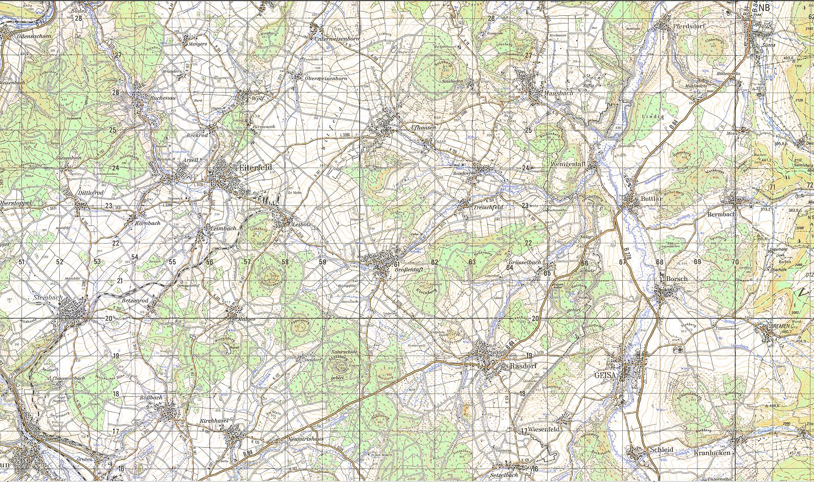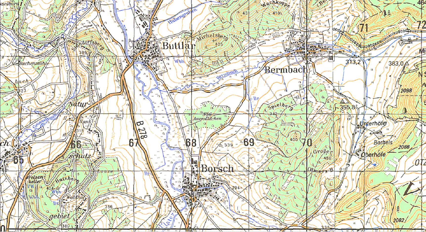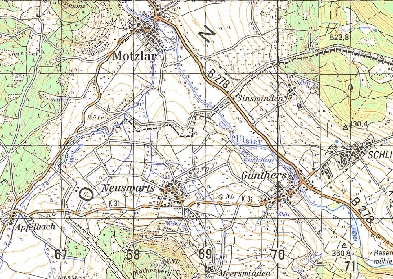 Interessant ist die UTM-Karte an der ich mich bzgl. Bebauung um 1990 orientiere: im Westen die Bw-Karte und im Osten die NVA-Karte!