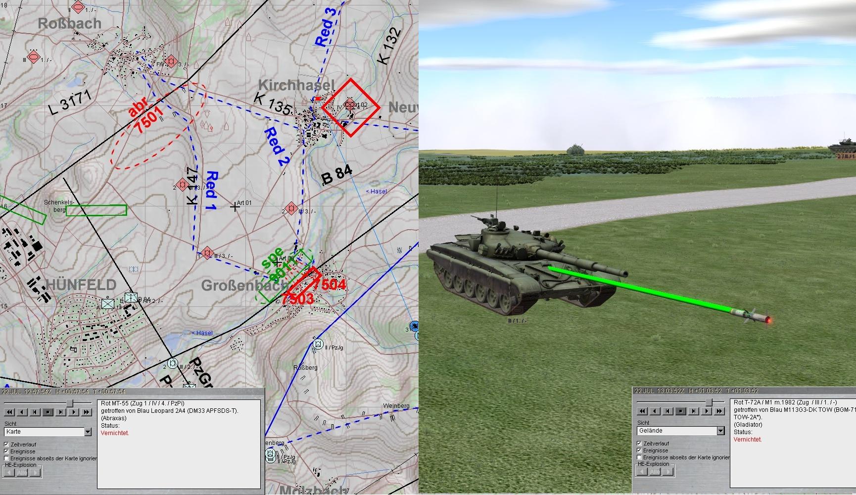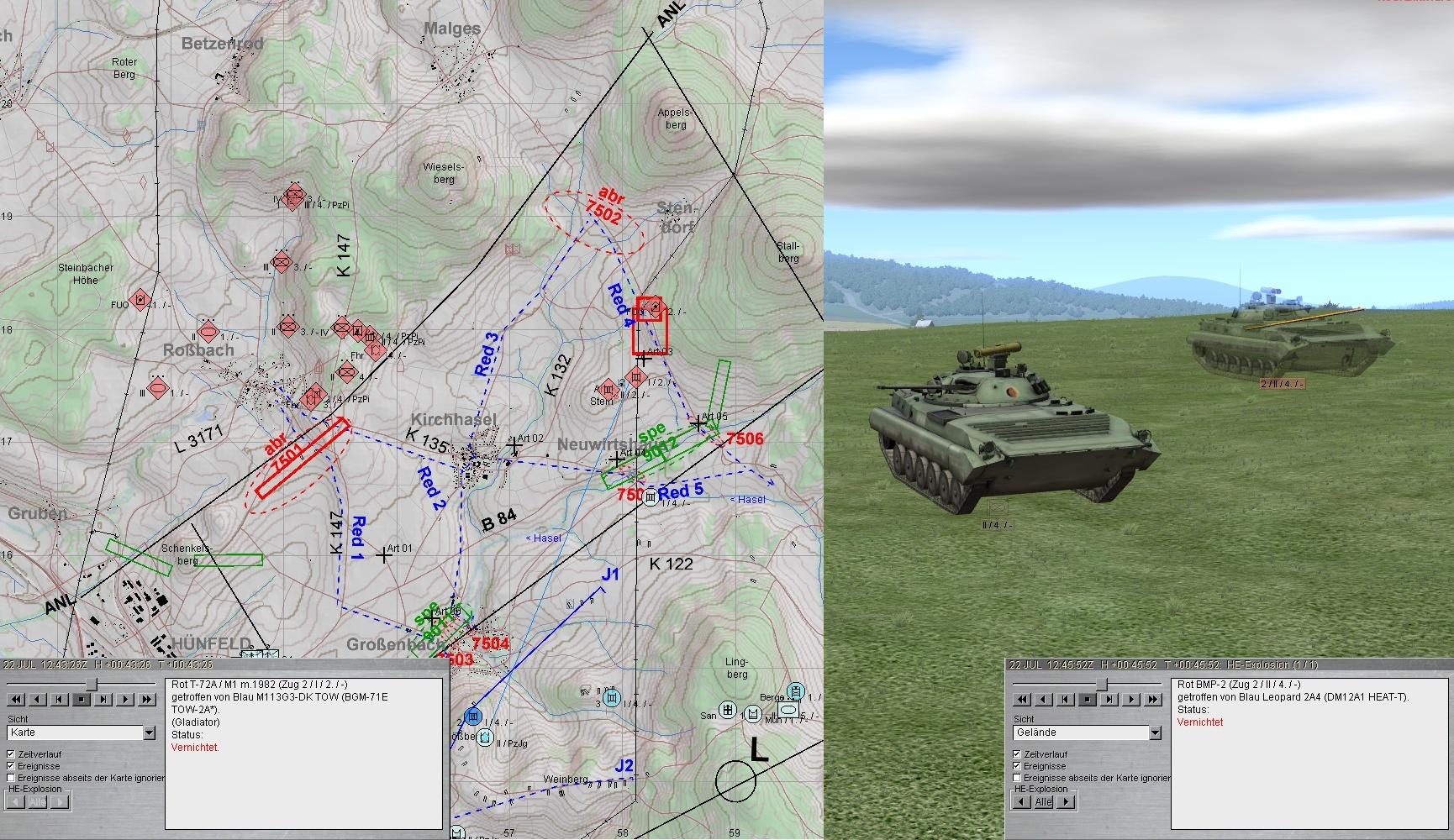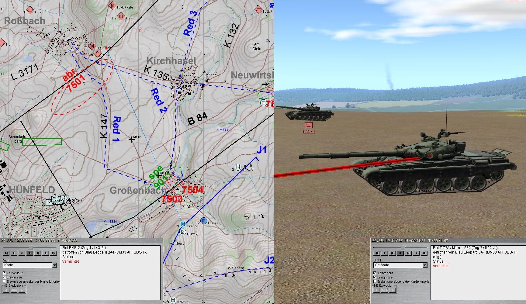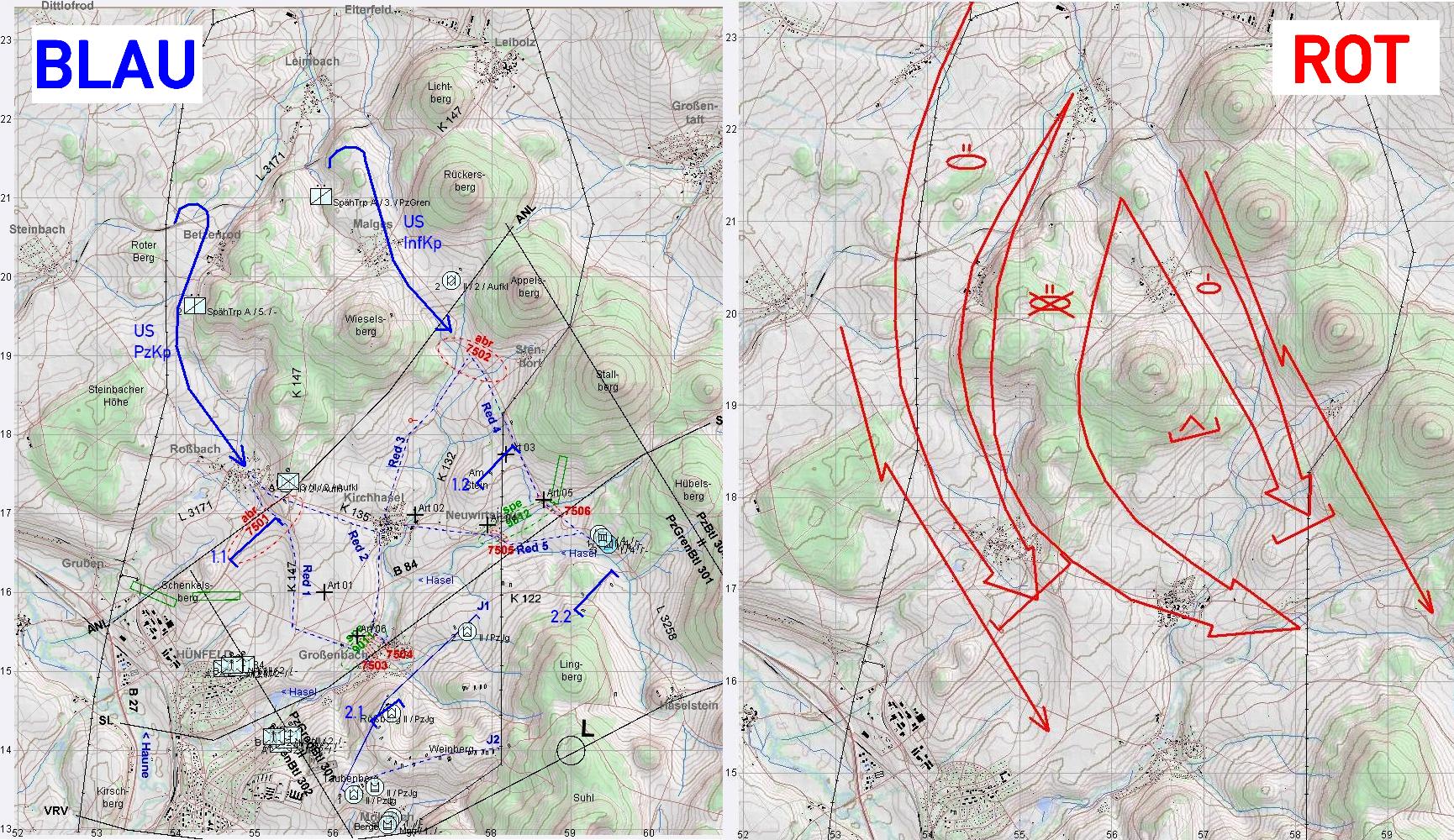 US-Kräfte wichen unter starkem Feinddruck aus. Dabei verlor die US-PzKp 2 Abrams. A2, links eingesetzt, stand im Feuerkampf mit T-72 und BMP, während zunächst A fdl Aufklärung vernichtete und anschließend im Feuerkampf mit fdl PzJgZg stand.