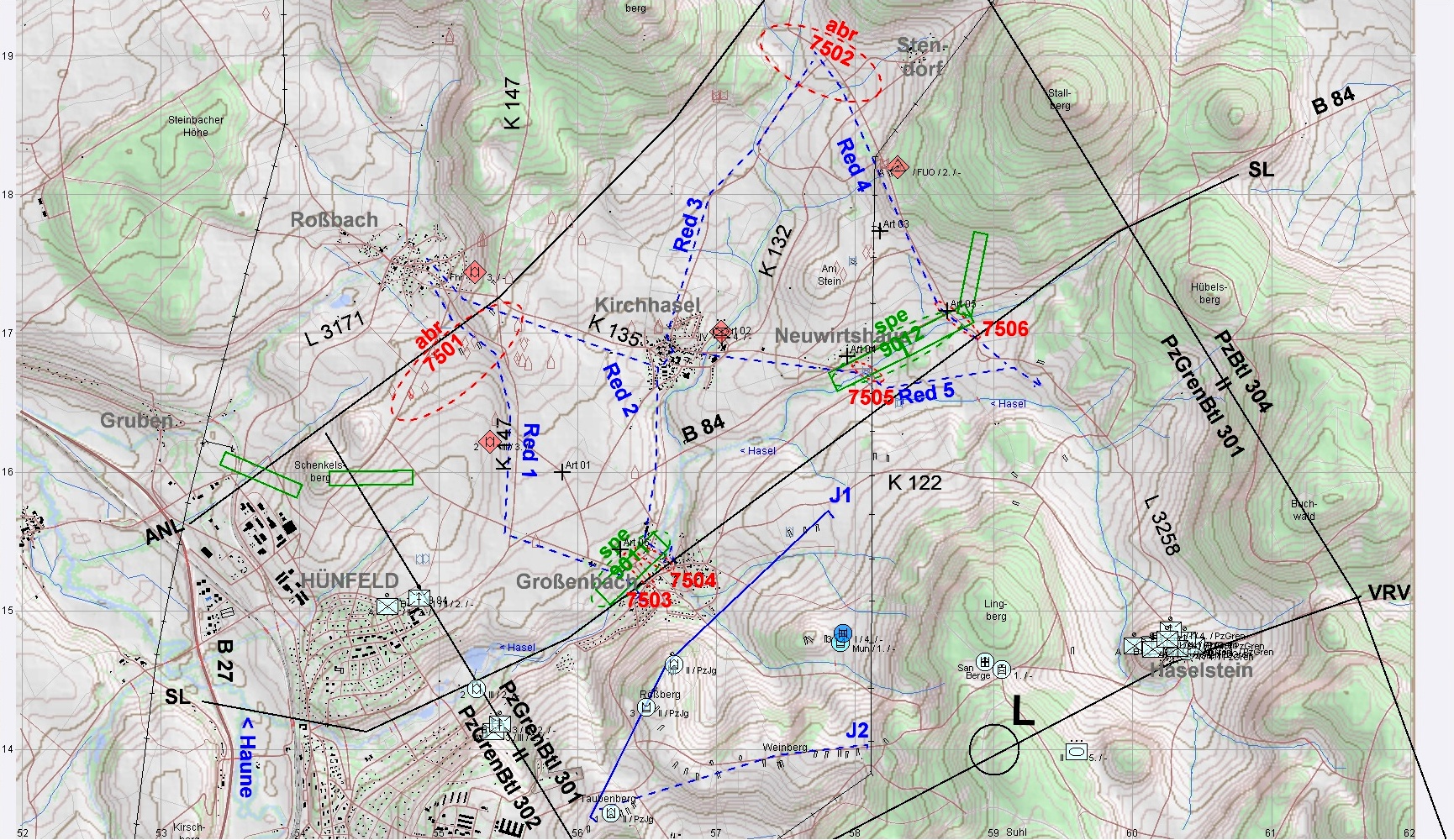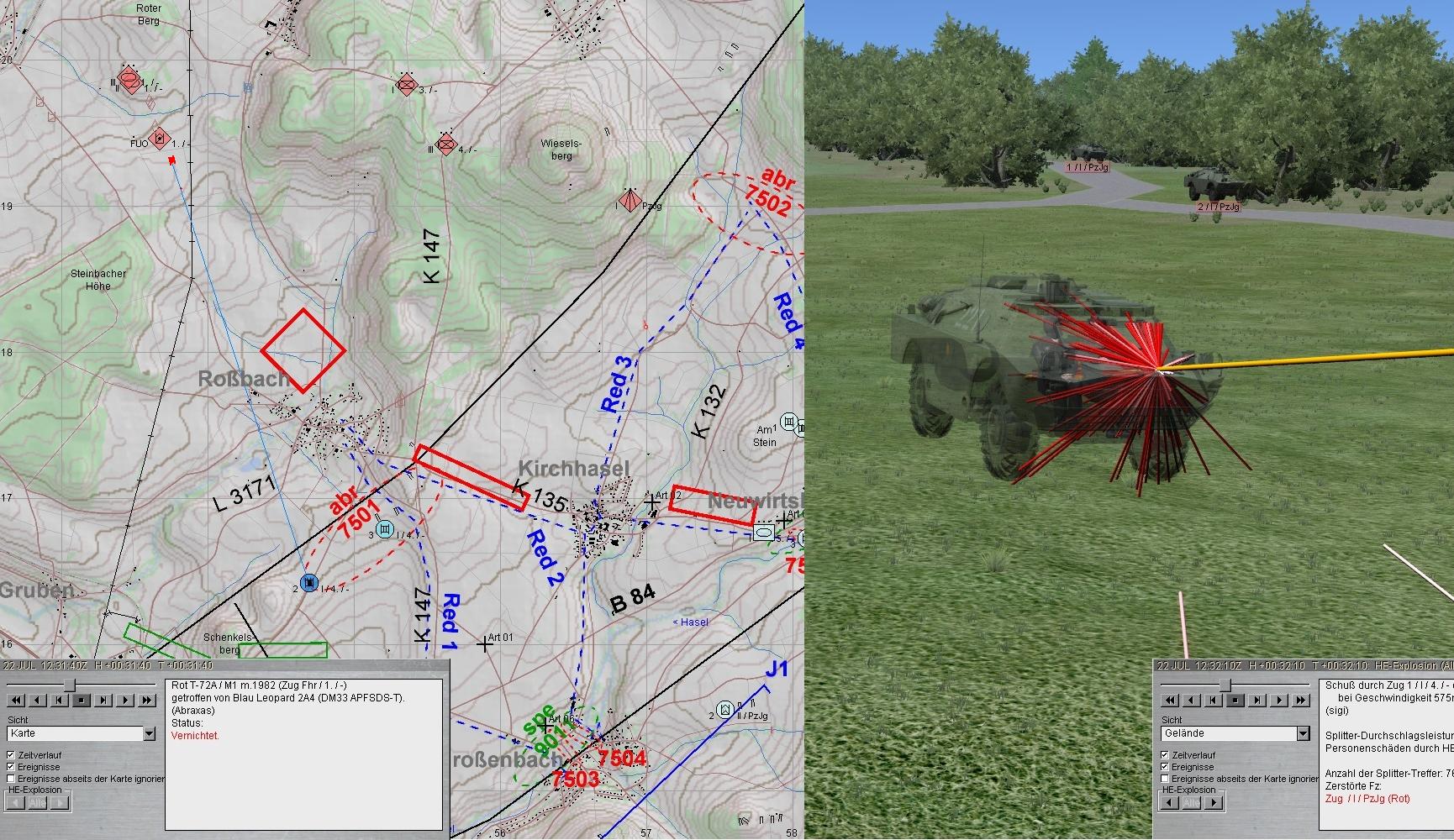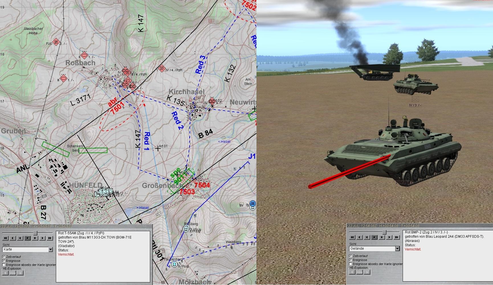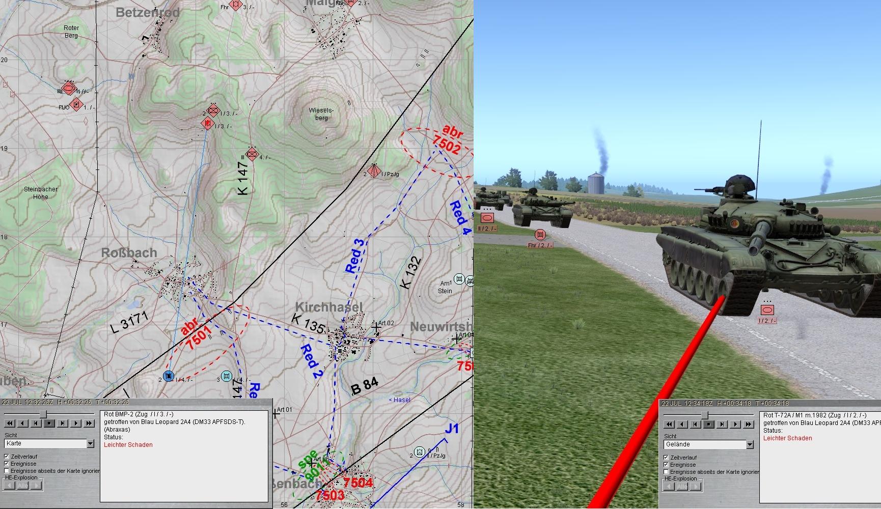 US-Kräfte wichen unter starkem Feinddruck aus. Dabei verlor die US-PzKp 2 Abrams. A2, links eingesetzt, stand im Feuerkampf mit T-72 und BMP, während zunächst A fdl Aufklärung vernichtete und anschließend im Feuerkampf mit fdl PzJgZg stand.