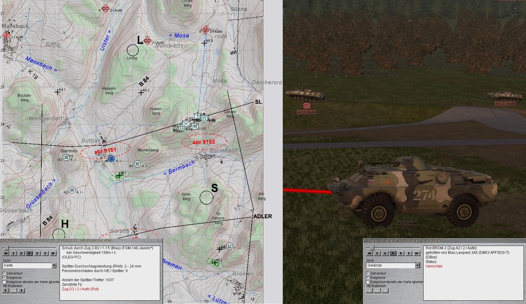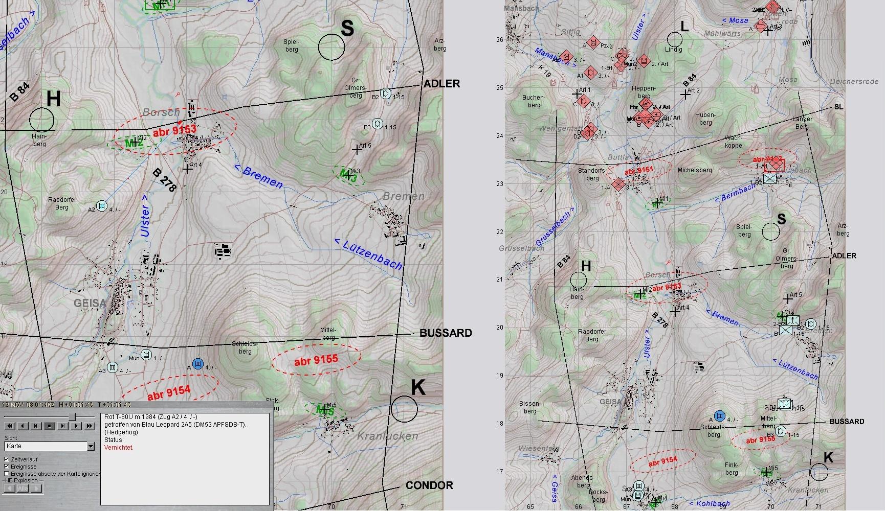 Nun rollte eine driite BMP-Kp mit PzJg westlich der ULSTER heran und ostwärts der ULSTER wurde eine T-80 Kp erkannt. ROT setzte massiv Artillerie ein, so dass BLAU ausweichen musste. Zudem musste teilweise Munition ergänzt werden.