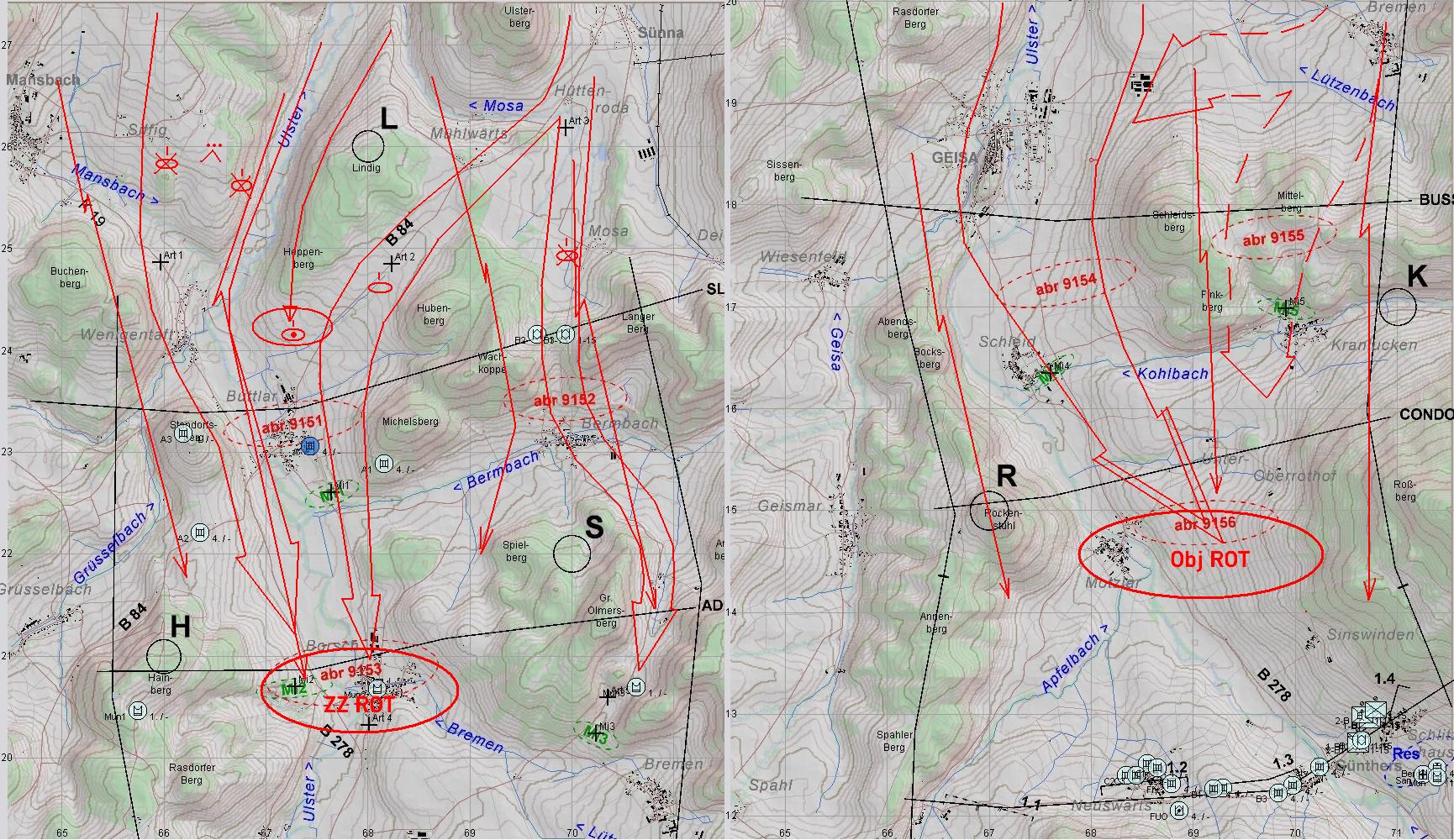 BLAU hatte mit einer verstärkten PzKp (DE+US) ihren Einsatzraum erreicht. Der vstk Spitzenzug soll für mindestens 60 Minuten im Zuge SL sichern und verzögern.