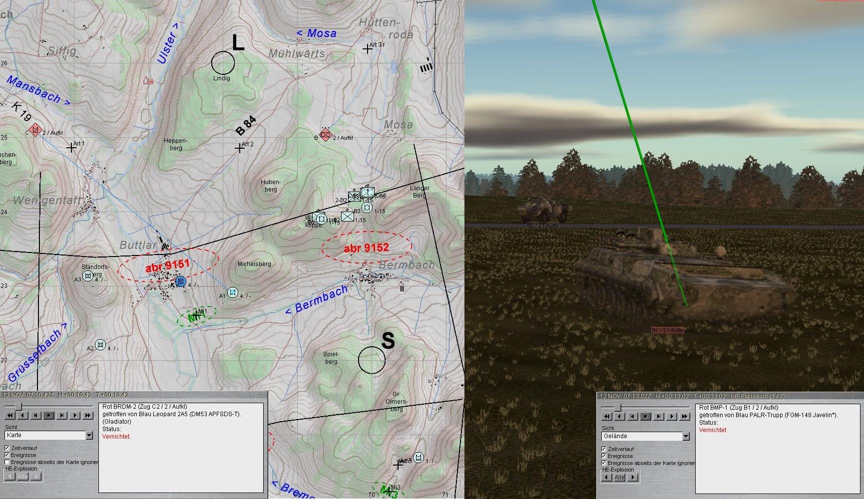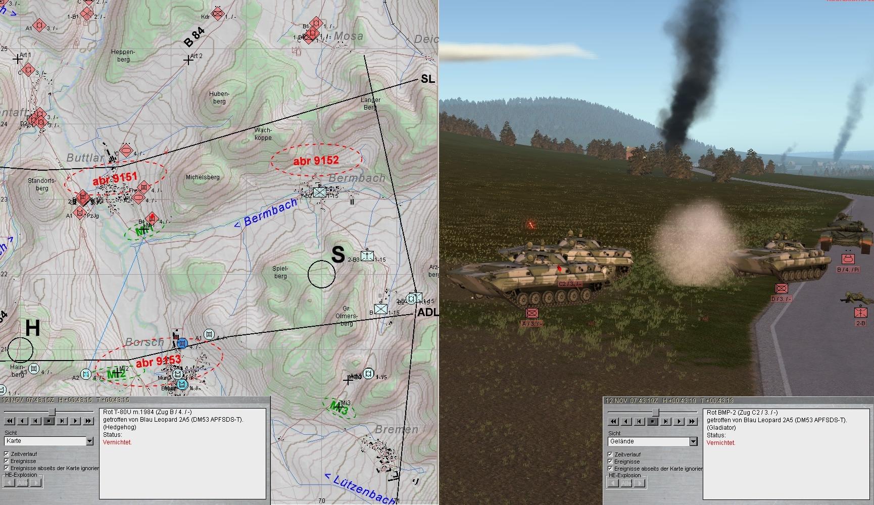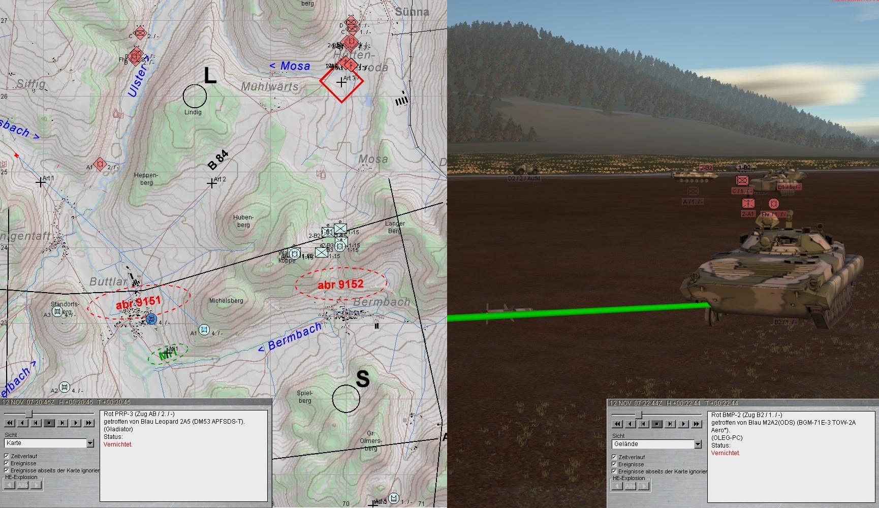 Nun rollte eine driite BMP-Kp mit PzJg westlich der ULSTER heran und ostwärts der ULSTER wurde eine T-80 Kp erkannt. ROT setzte massiv Artillerie ein, so dass BLAU ausweichen musste. Zudem musste teilweise Munition ergänzt werden.