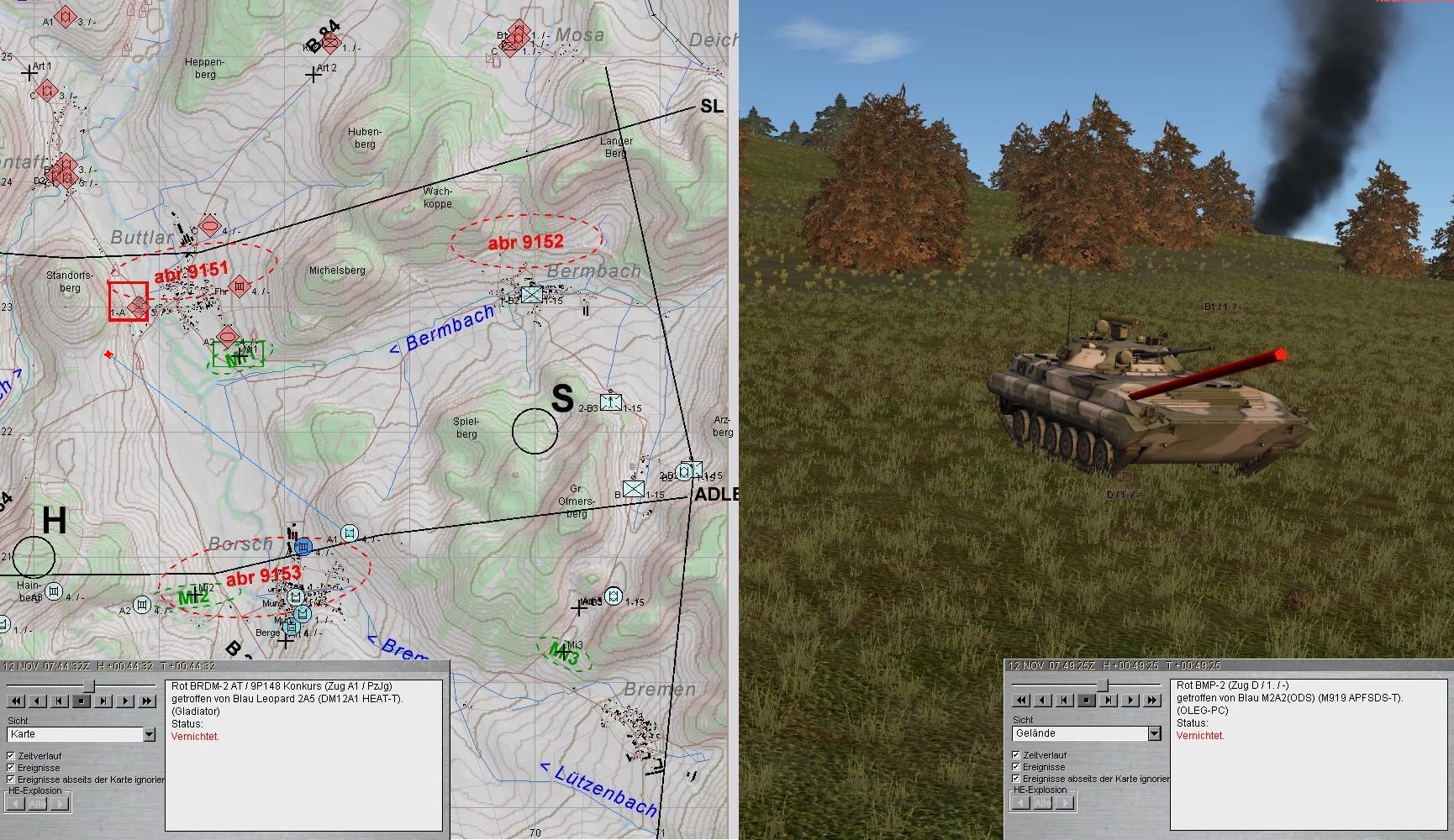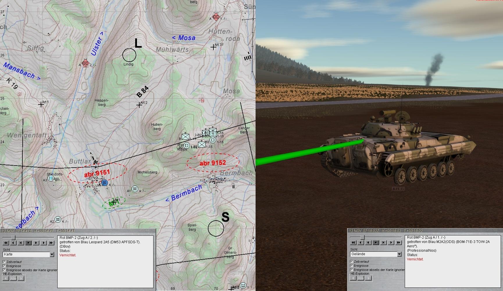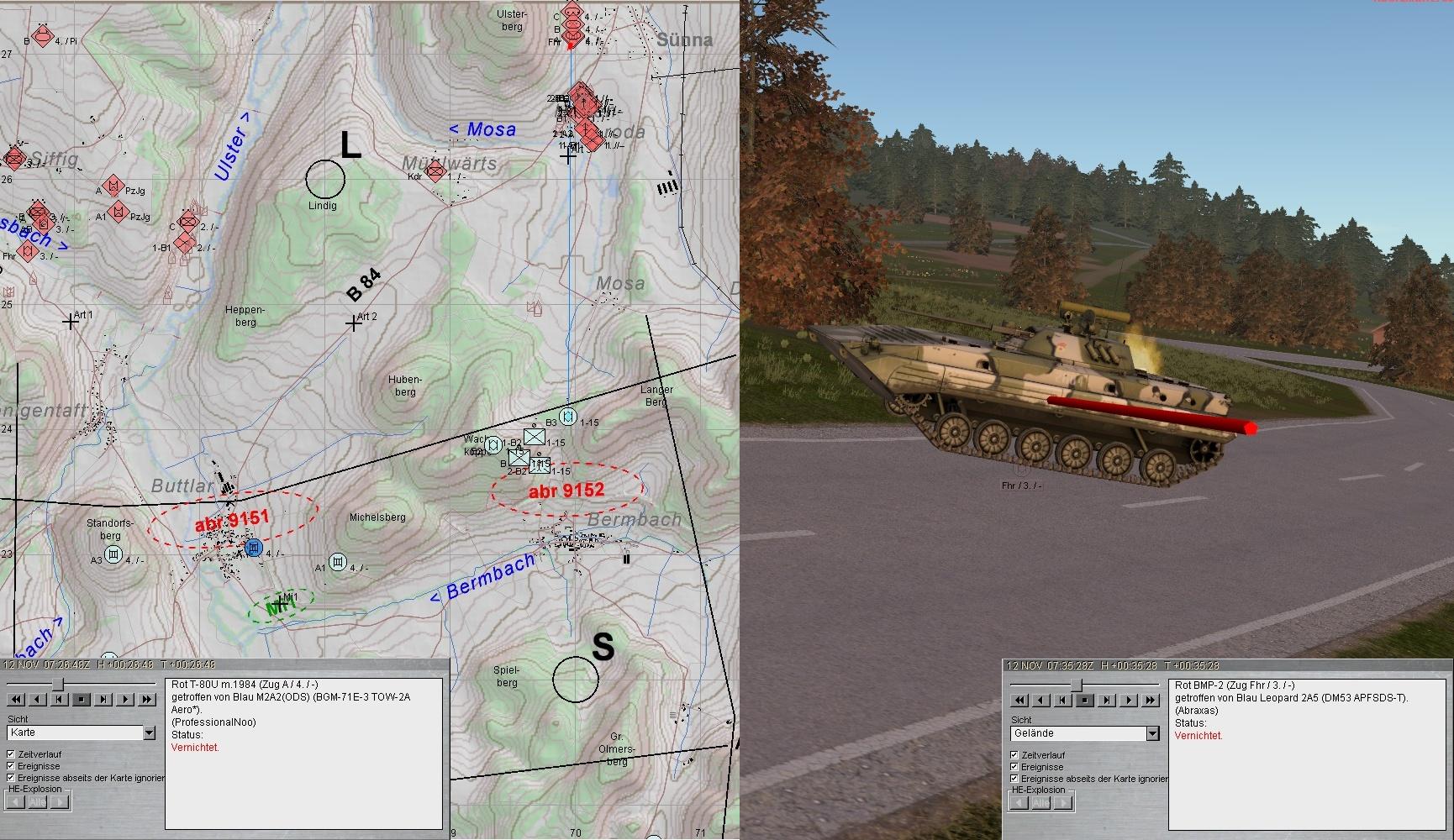 Nun rollte eine driite BMP-Kp mit PzJg westlich der ULSTER heran und ostwärts der ULSTER wurde eine T-80 Kp erkannt. ROT setzte massiv Artillerie ein, so dass BLAU ausweichen musste. Zudem musste teilweise Munition ergänzt werden.