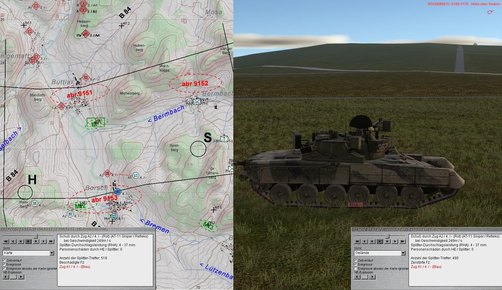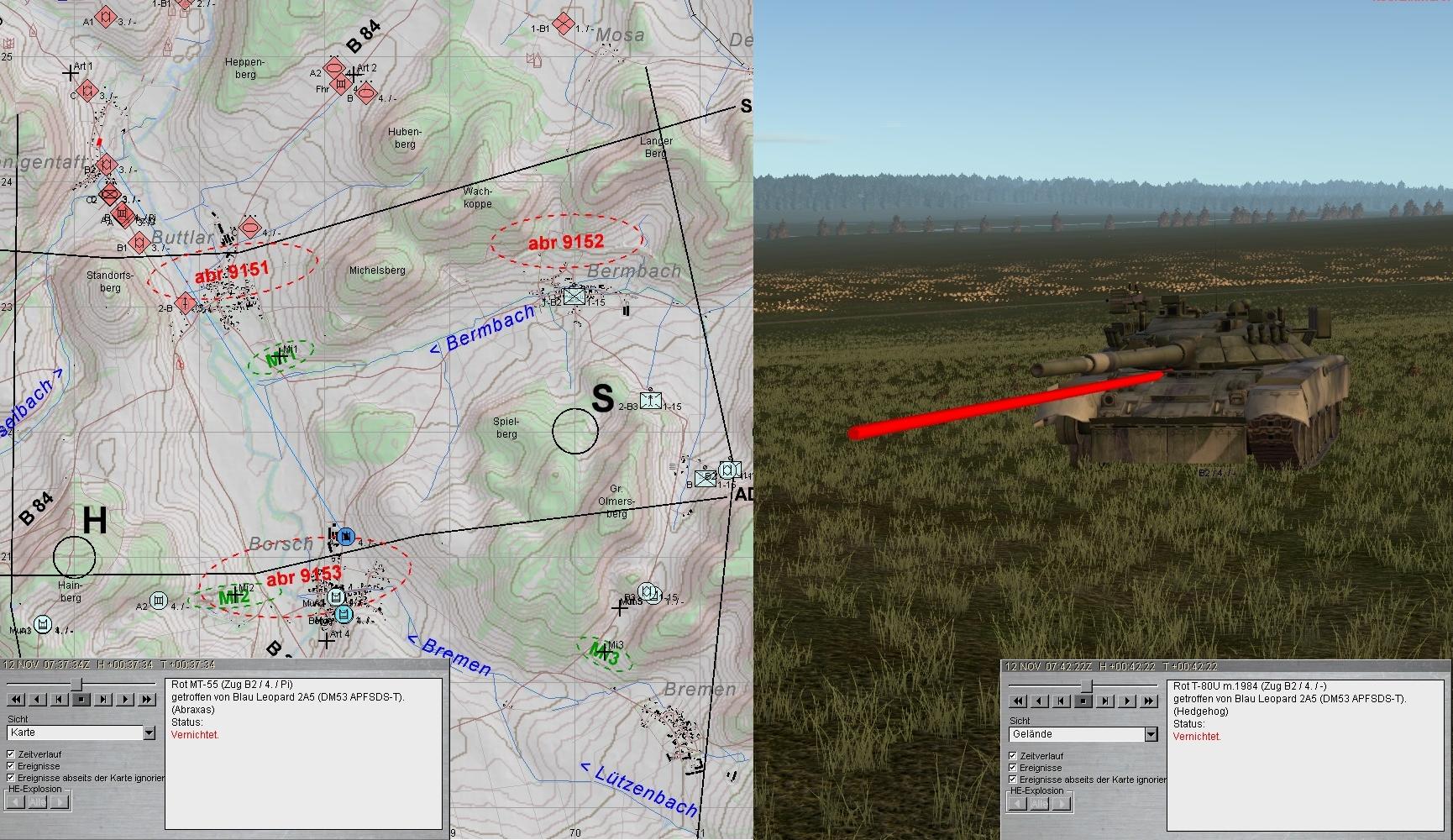 Aber leider nicht vollens, denn 1 T-80 konnte ungeschadet sich BORSCH nähern und A1 vernichten, bevor er letztlich ebenfalls abgeschossen werden konnte. BLAU wich auf die Stellungen BUSSARD aus: