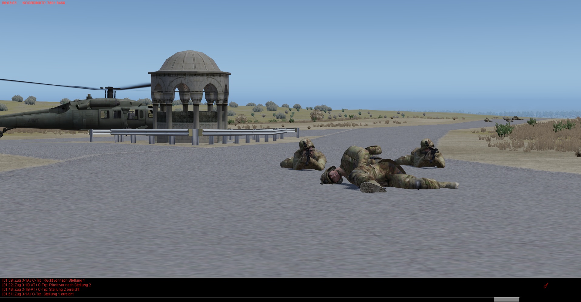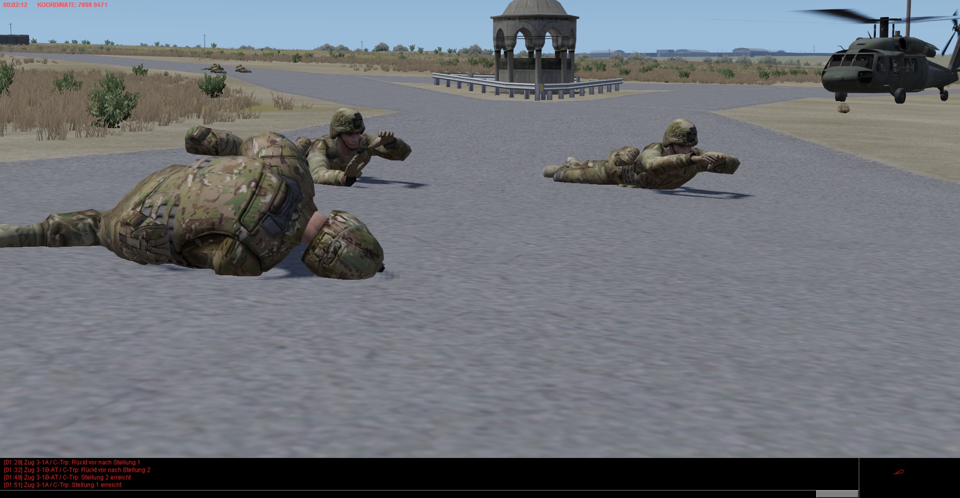 Ich hatte einen SanUnimog absitzen lassen und beide San Trps in den Hubschrauber (MedEvac) geladen und damit zu 2 einzelnen gefallen Soldaten geschickt. Vor Ort absitzen lassen, aber nur EIN SanTrp hat die Versorgung an einem Soldaten vorgenommen. Der andere SanTrp hat nichts gemacht.