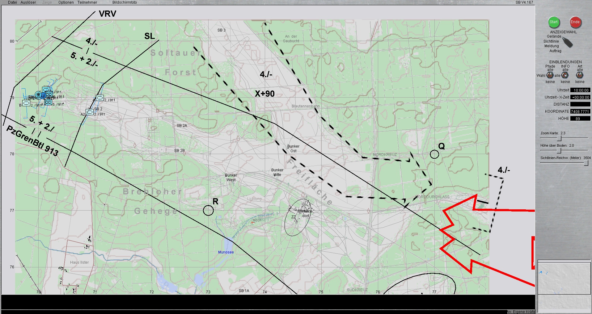 Lage: Beim gestrigen Angriff von ROT, in größe eines verst. verm. mech. Regiments, wurde dieser bis zu 80% zerschlagen. Die verbliebenen Restkräfte in vermuteter Kompaniestärke, sind bei Sonnenuntergang bis auf Höhe BRELOH - BARBARADORF ausgewichen.