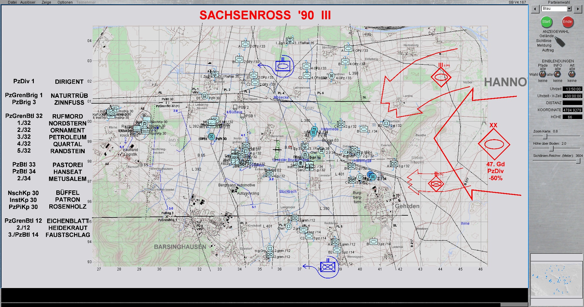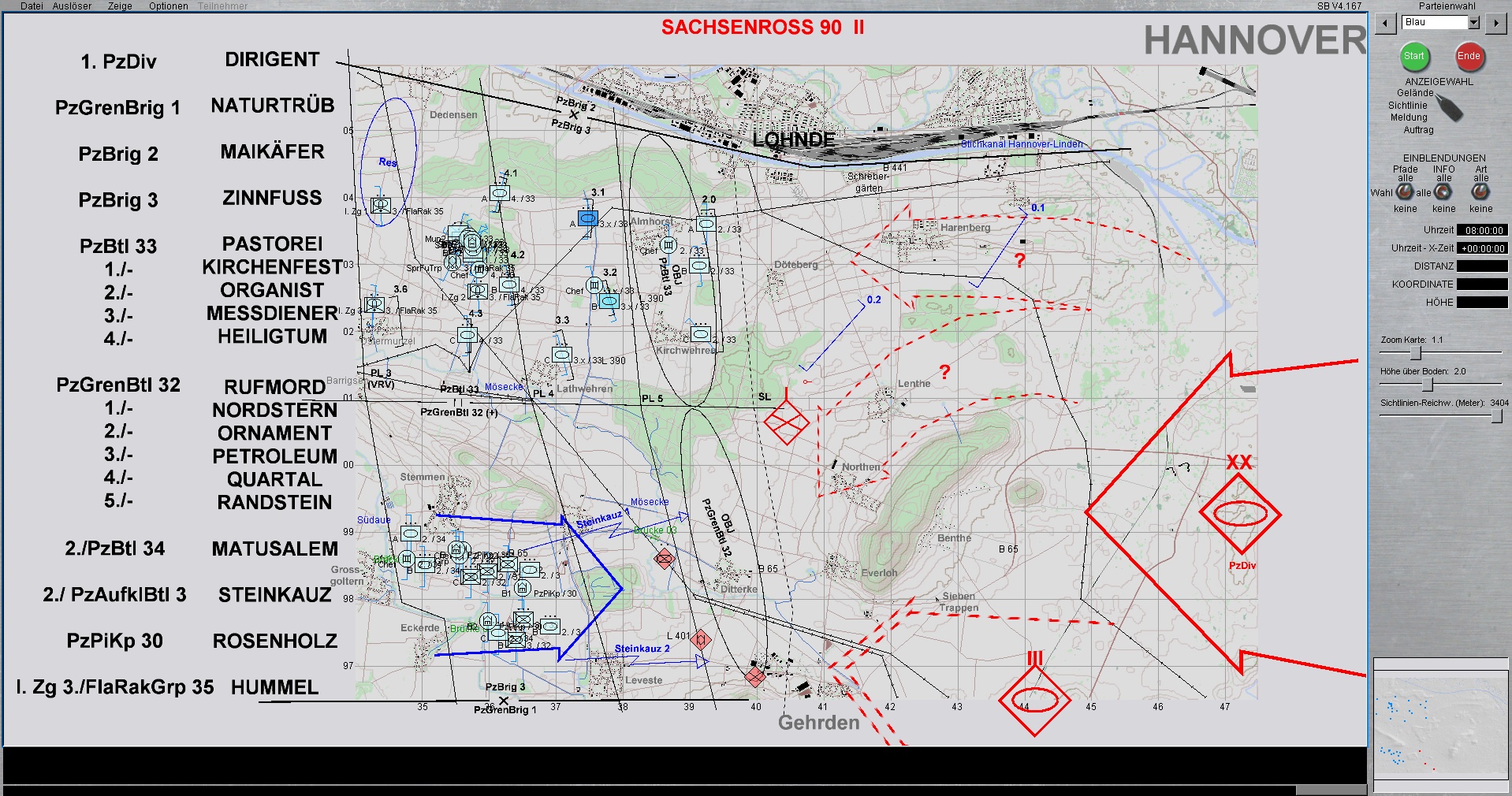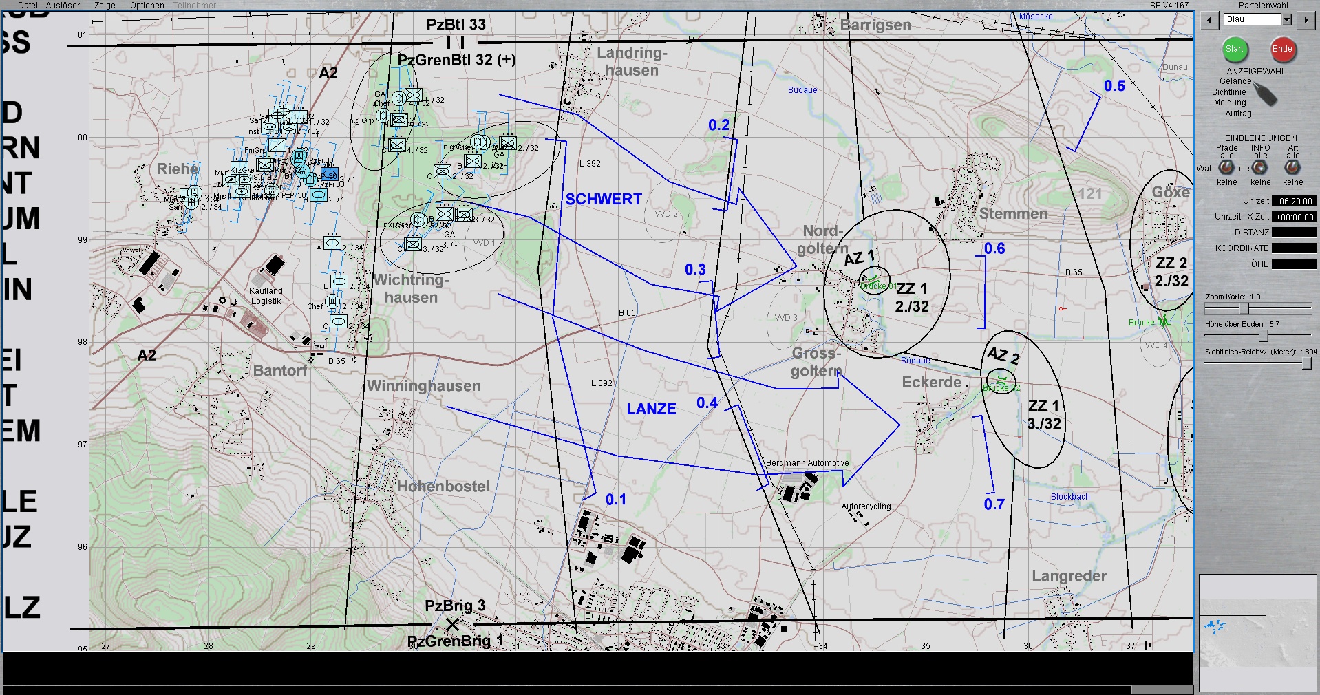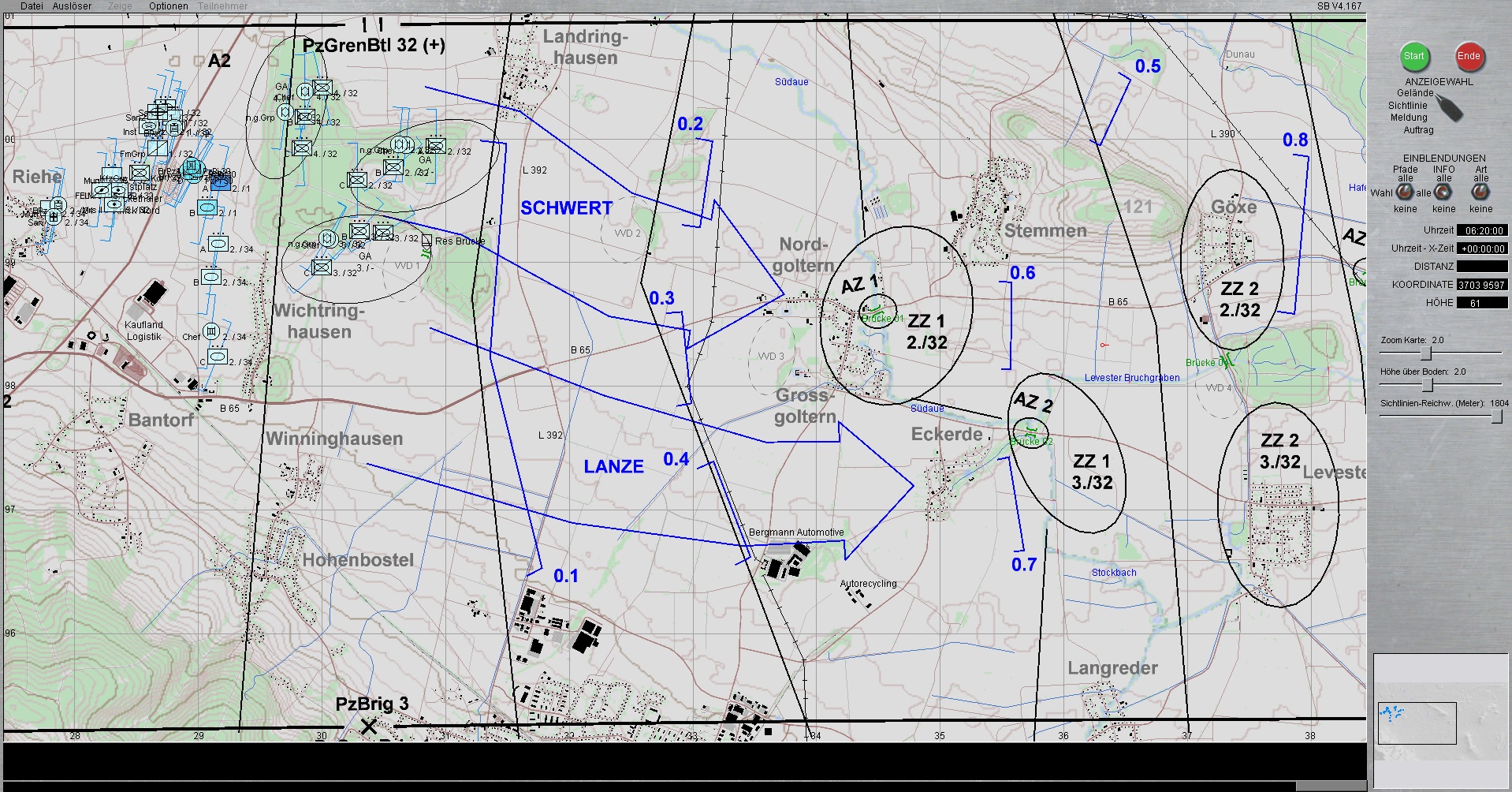 Die 1. PzDiv ist mit allen 3 Brigaden westlich von HANNOVER eingesetzt. Die PzGrenBrig 1 ist rechts, Die PzBrig 3 in der Mitte und die PzBrig 2 ist links eingesetzt.
