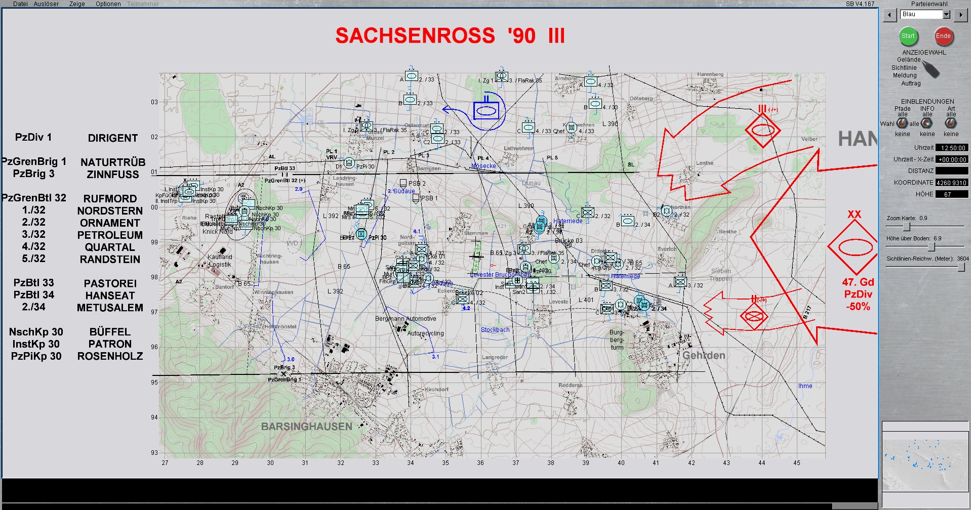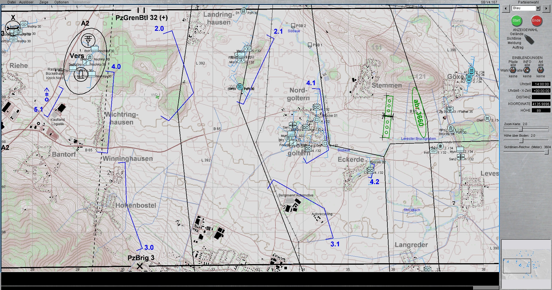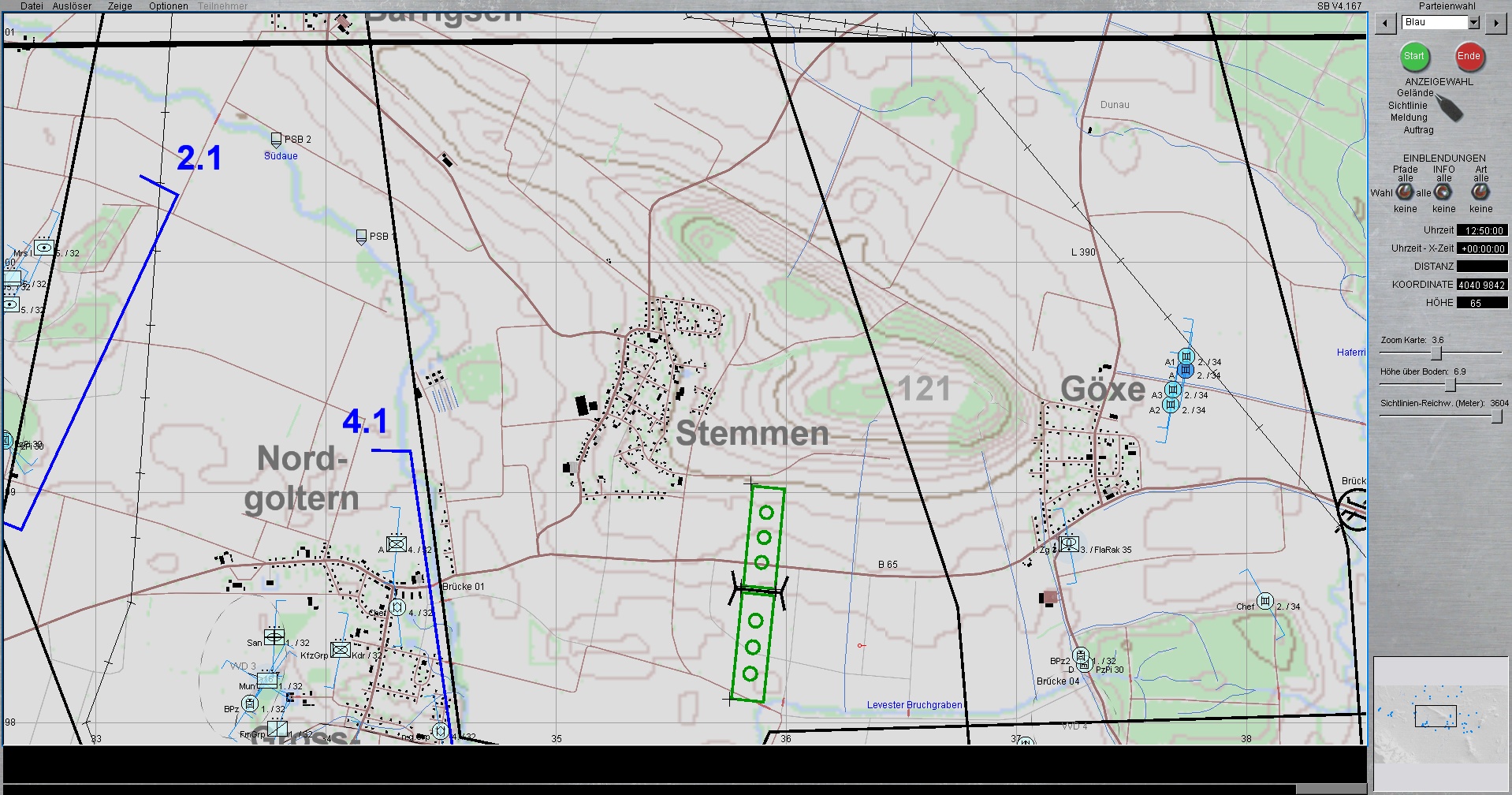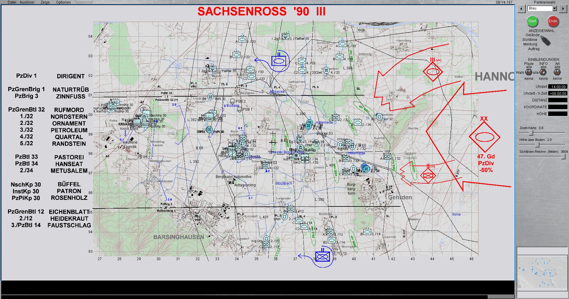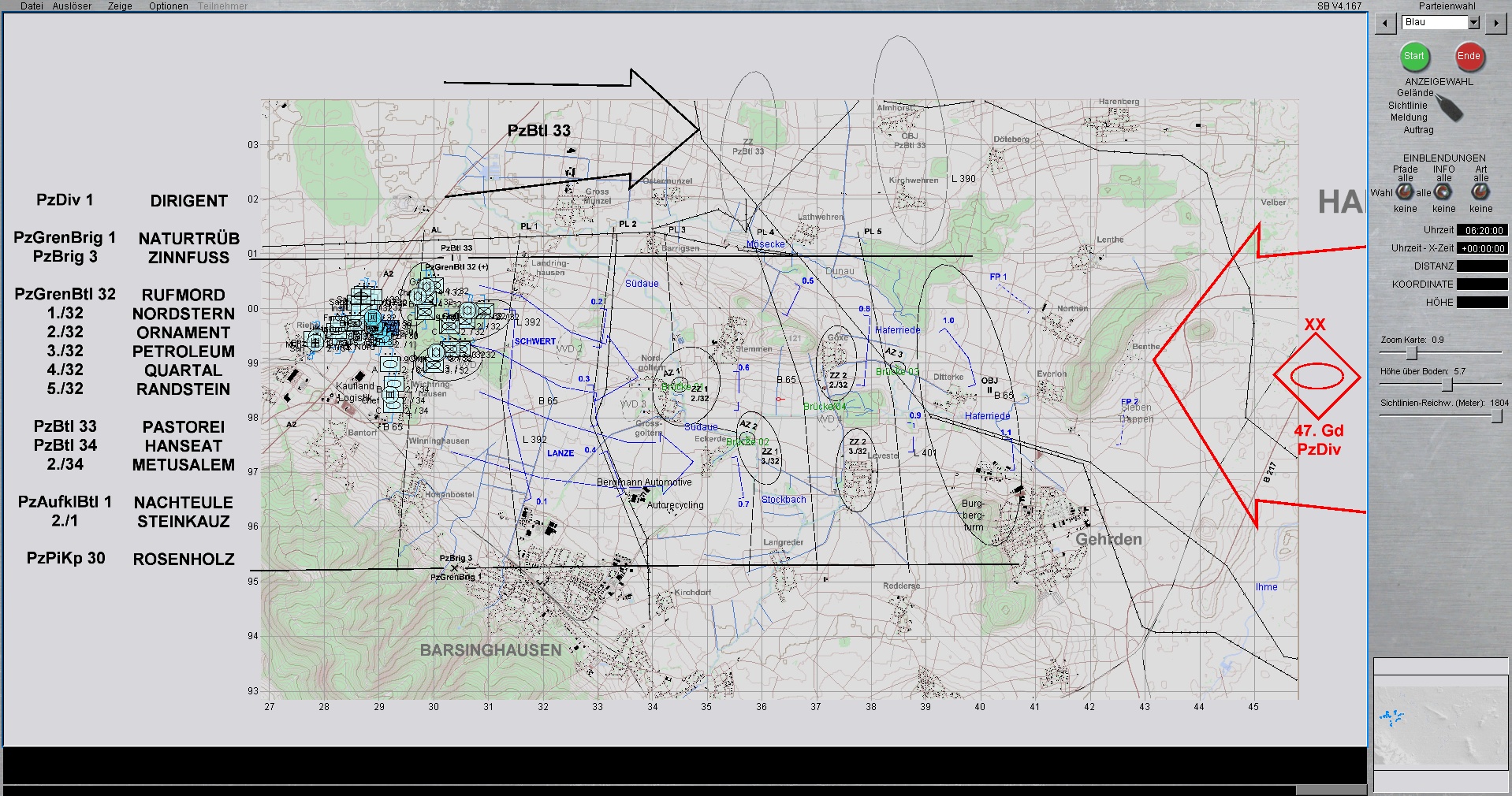 Die 1. PzDiv ist mit allen 3 Brigaden westlich von HANNOVER eingesetzt. Die PzGrenBrig 1 ist rechts, Die PzBrig 3 in der Mitte und die PzBrig 2 ist links eingesetzt.