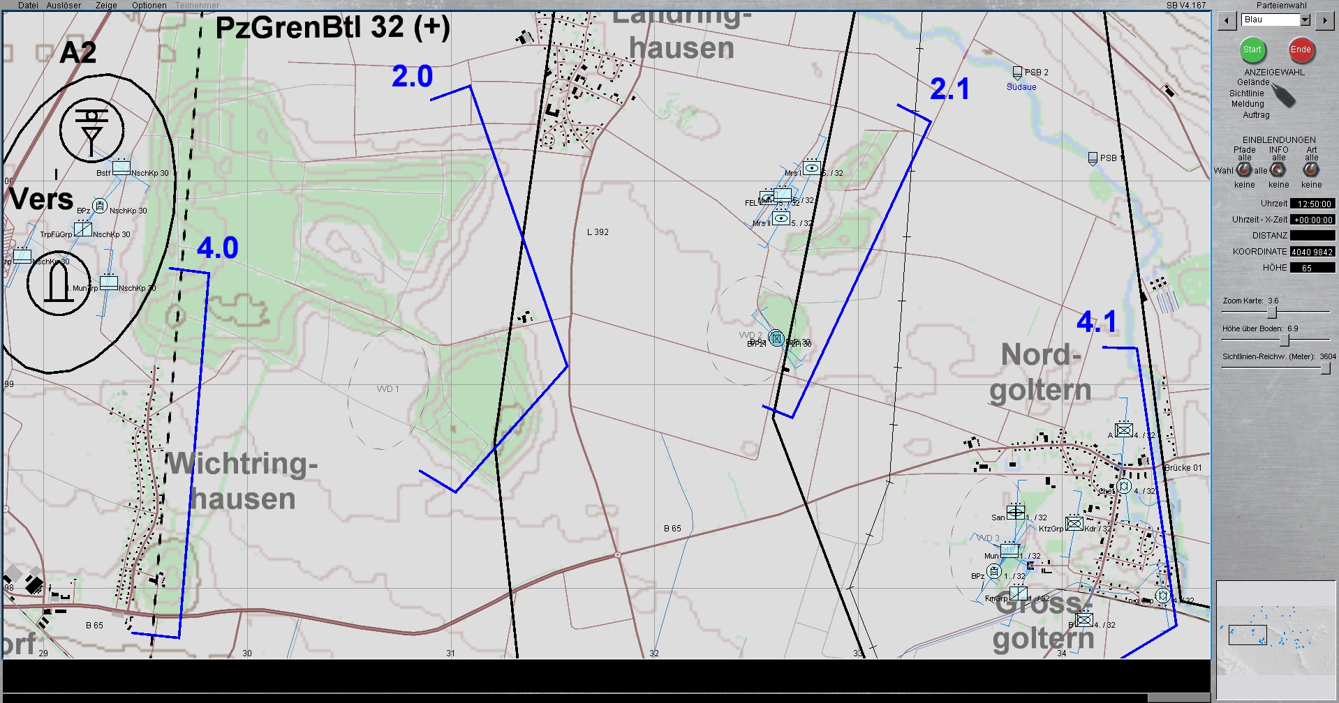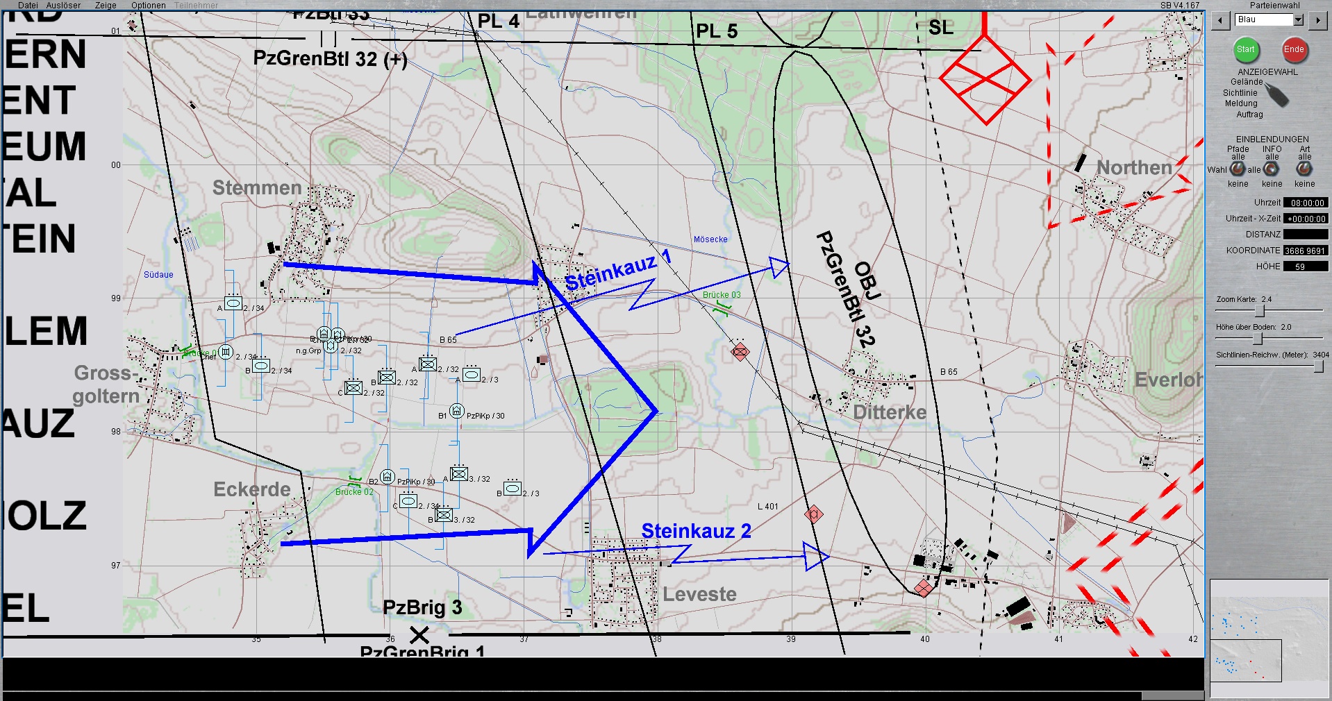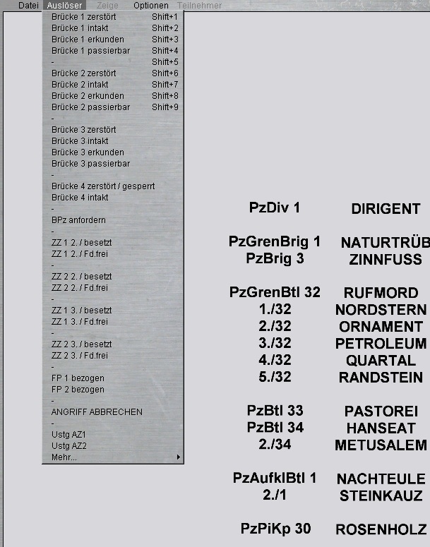 WIR sind die PzBrig 3. Das PzBtll 33 ist links und das vstk PzGrenBtl 32 rechts im BrigGefechtsstreifen eingesetzt. Das PzBtl 34 unterstützt das PzGrenBtl 32 mit einer Kp. Das Restliche Btl richtet sich vorerst zur Verteidigung ein und bildet zugleich die BrigRes.