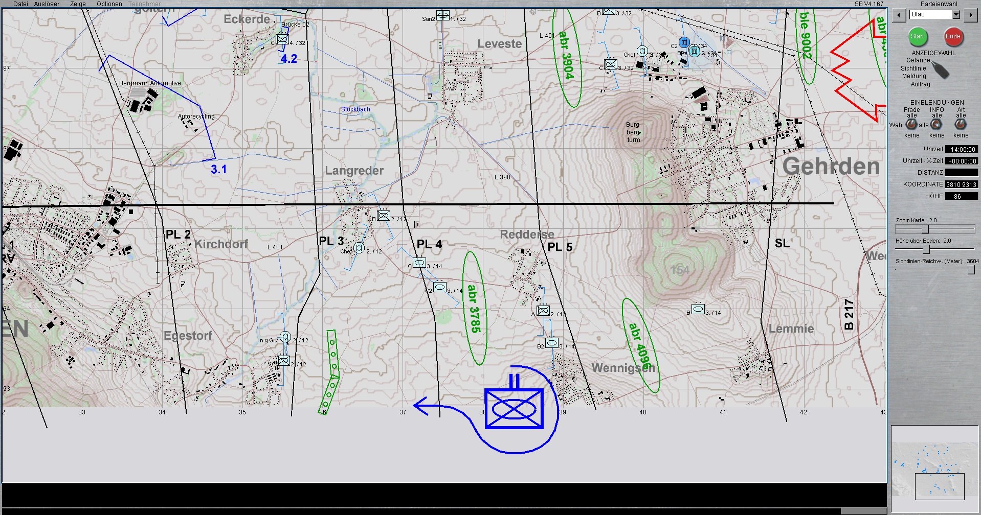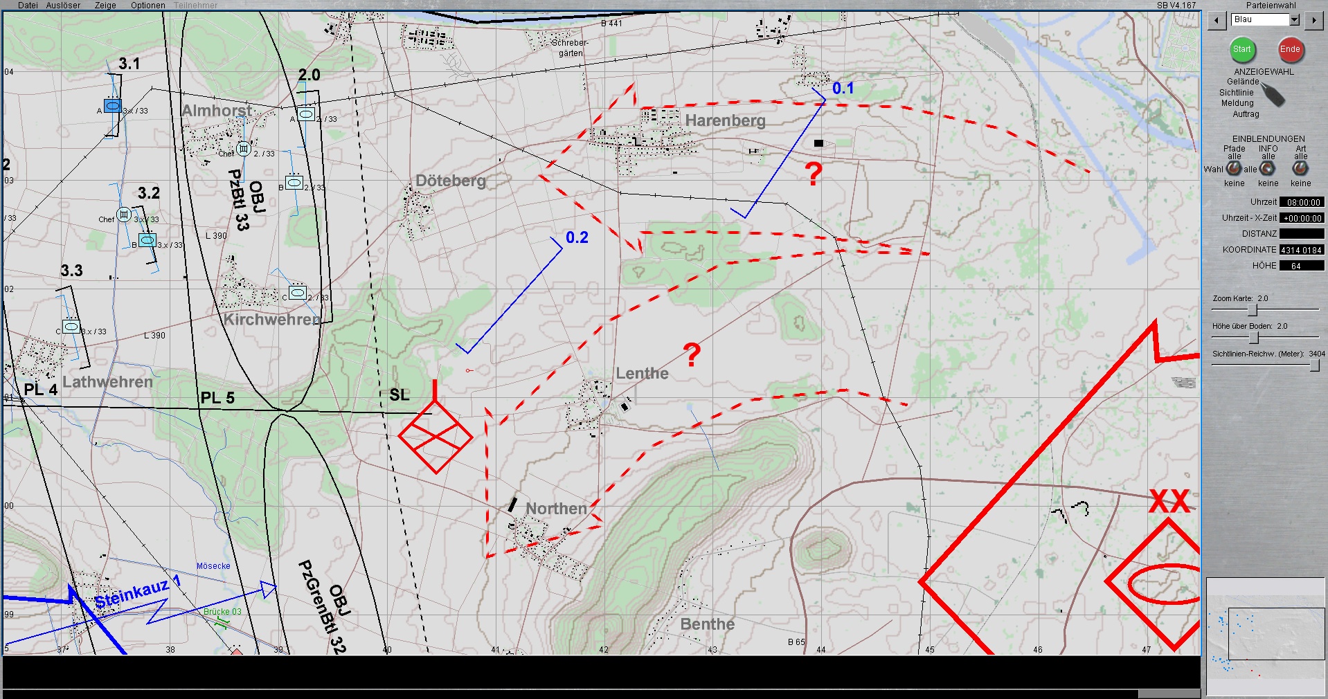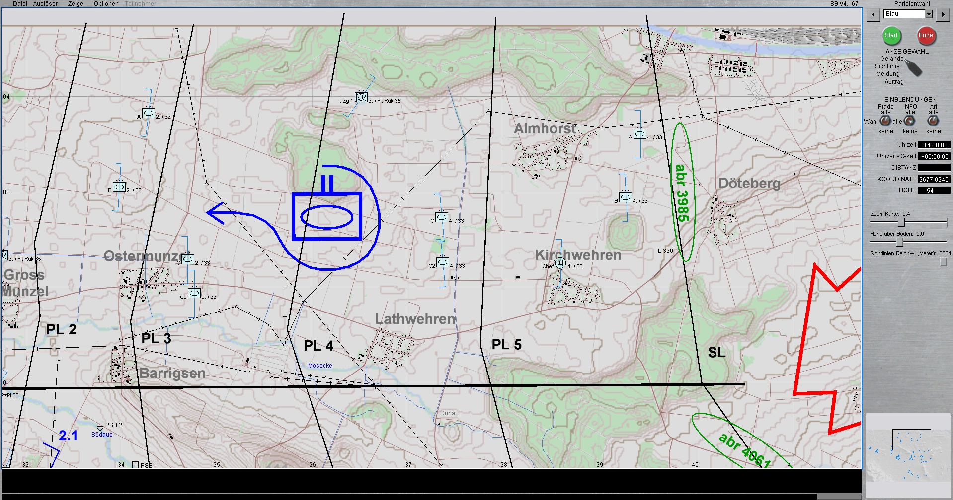 WIR im PzBtl 33 eingesetzt, treten mit 2 Panzerzügen (Leopard 2A4) nach Osten an, gewinnen Stellungen vor HANNOVER, sodass verbliebene fdl LL-Kräfte vernichtet werden, mögliche erste Feindangriffe aus allgemein ostwärtiger Richtung verhindert bzw. bei zu starkem Feinddruck verzögert werden, um somit dem PzGrenBtl 32 die nötige Zeit zu verschaffen, deren OBJ vor eintreffen des Feindes zu erreichen und zu nehmen.