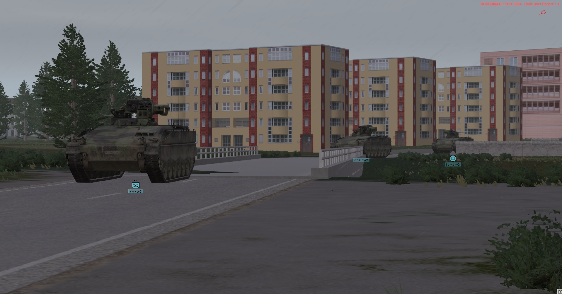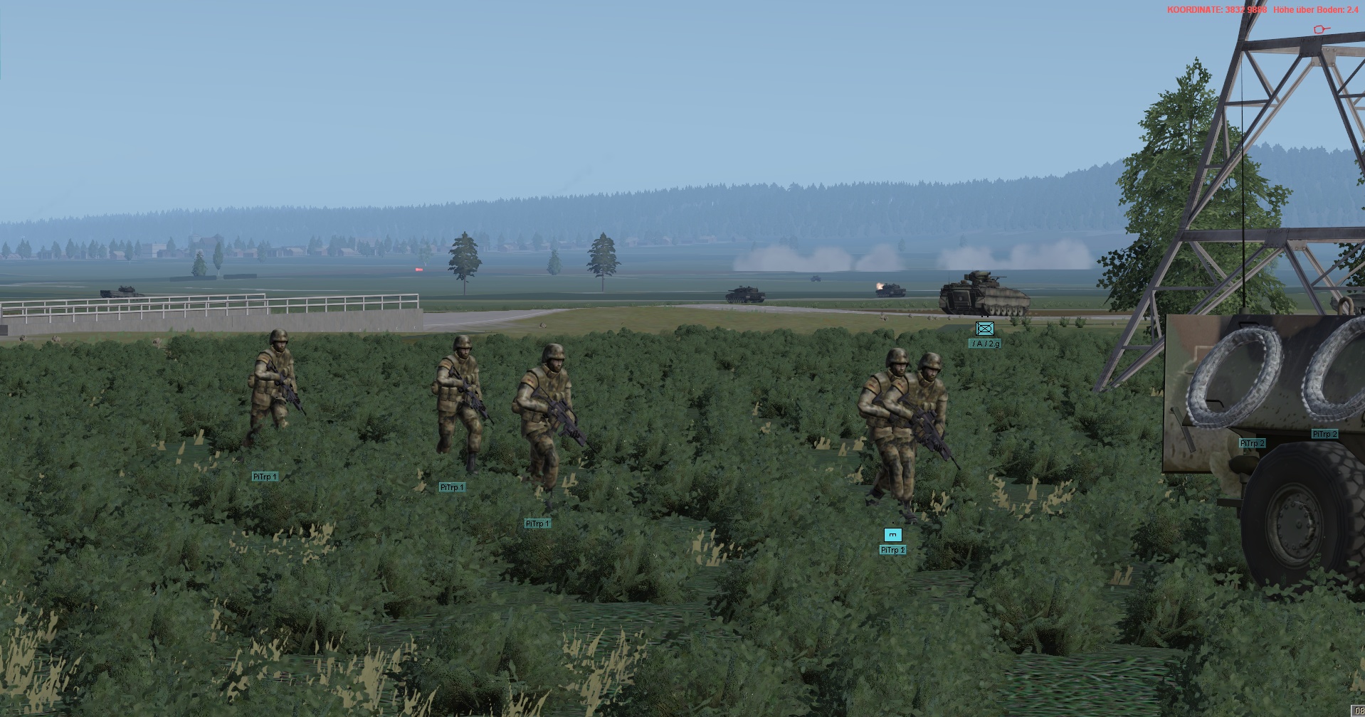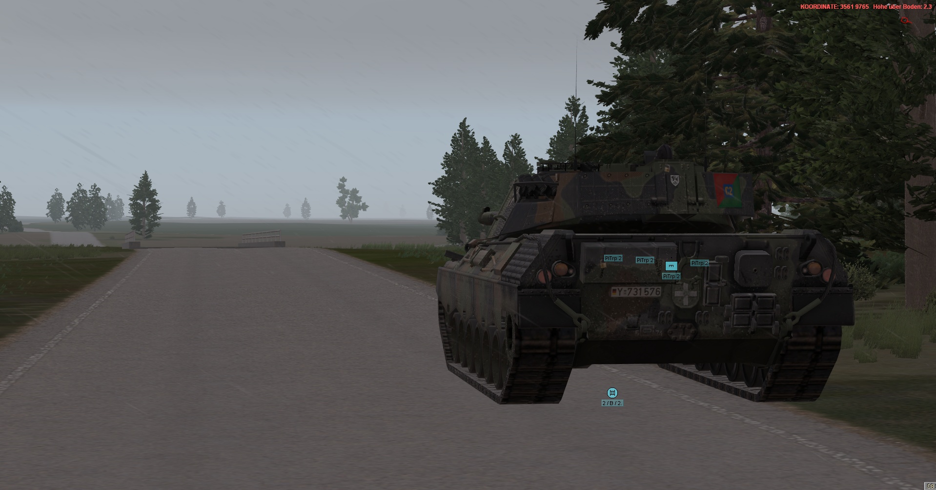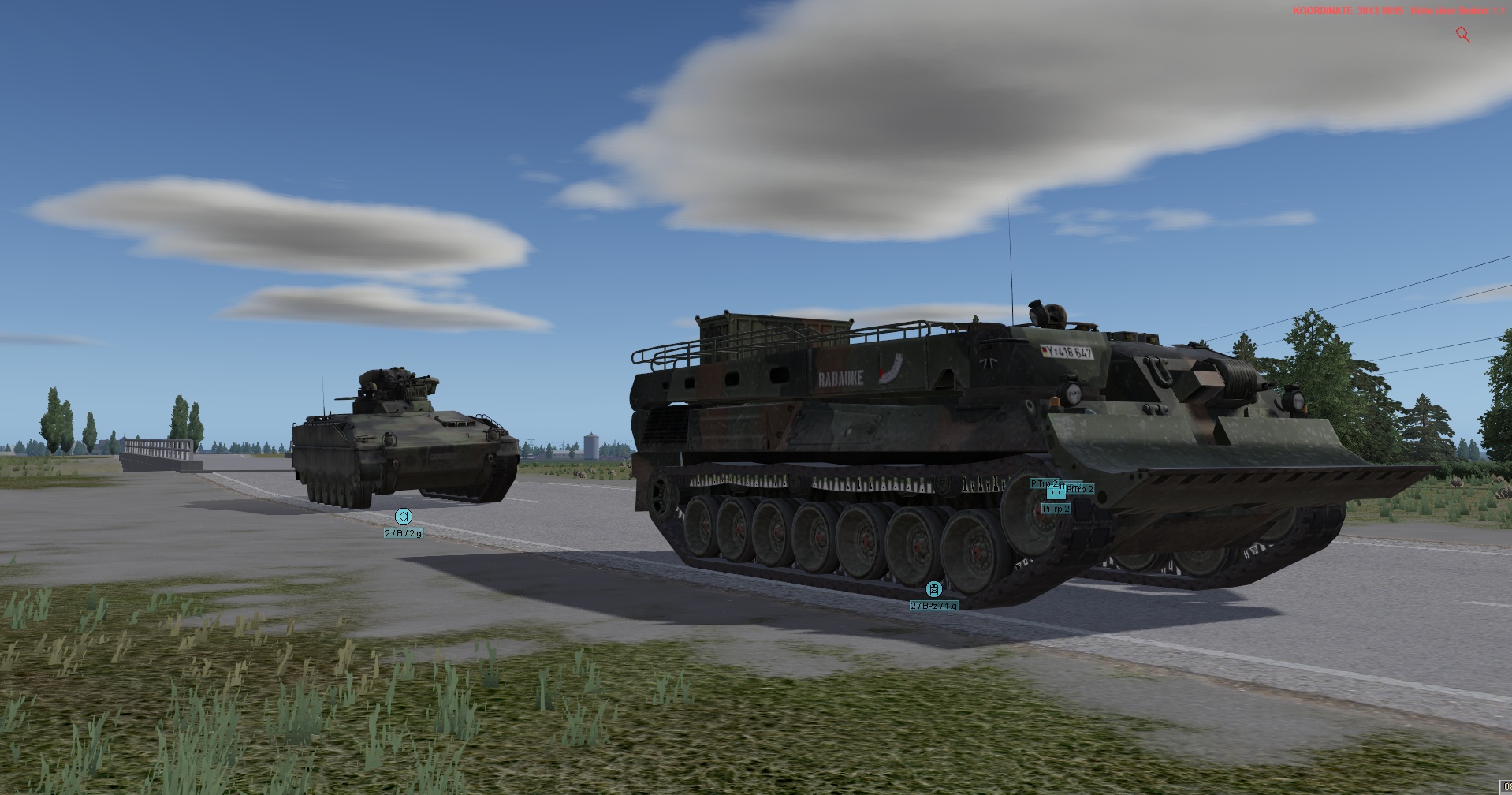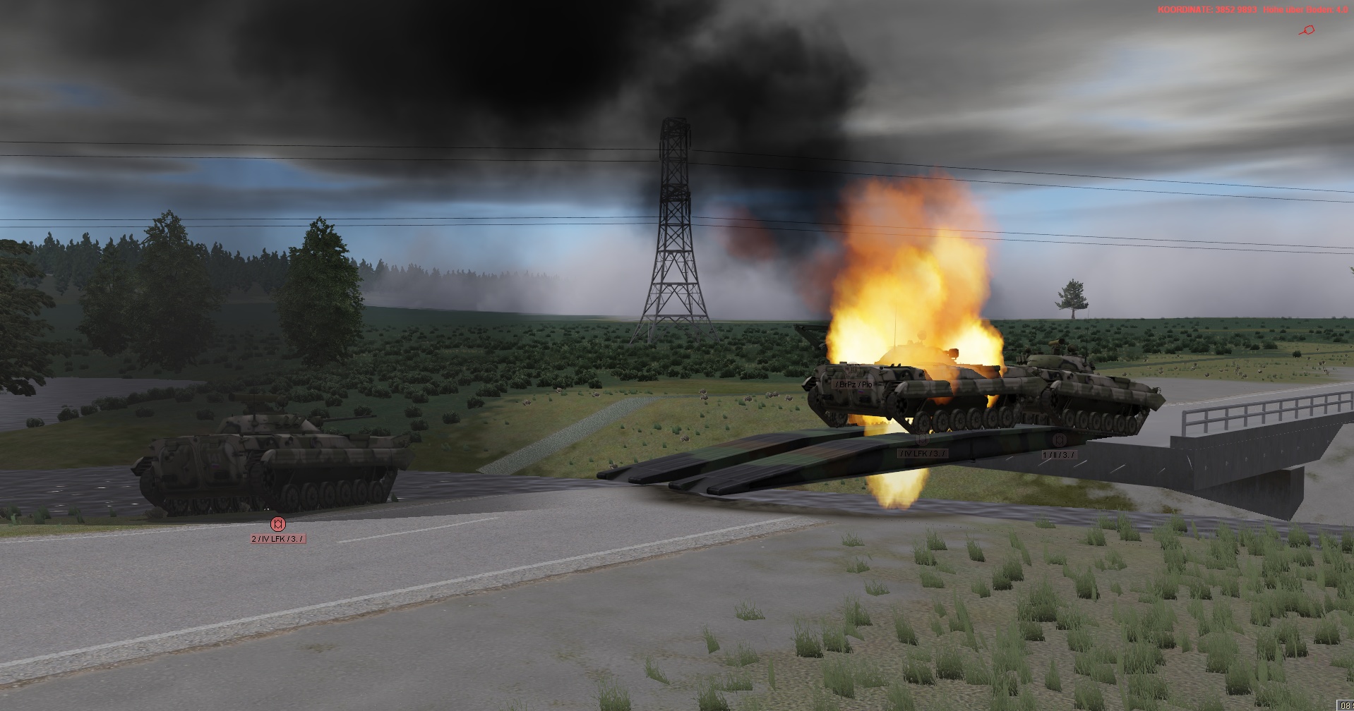 WIR im PzGrenBtl 32 eingesetzt, treten mit einem PzZg (2x 3 Leopard 1A5) des 2./ PzAufklBtl 1, dem Btl voraus als schwere GefAufkl an, vernichten Feind oder zwingen Diese zum Ausweichen, unterstützen & sichern eigene Pioniere bei den Brückenübergängen, legen ggf manuell Panzerschnellbrücken über zerstörte Brücken, um den eigenen Angriff voranzubringen, klären, nach nehmen des OBJs, weiter in allgemein nordöstliche und östliche Richtung auf.