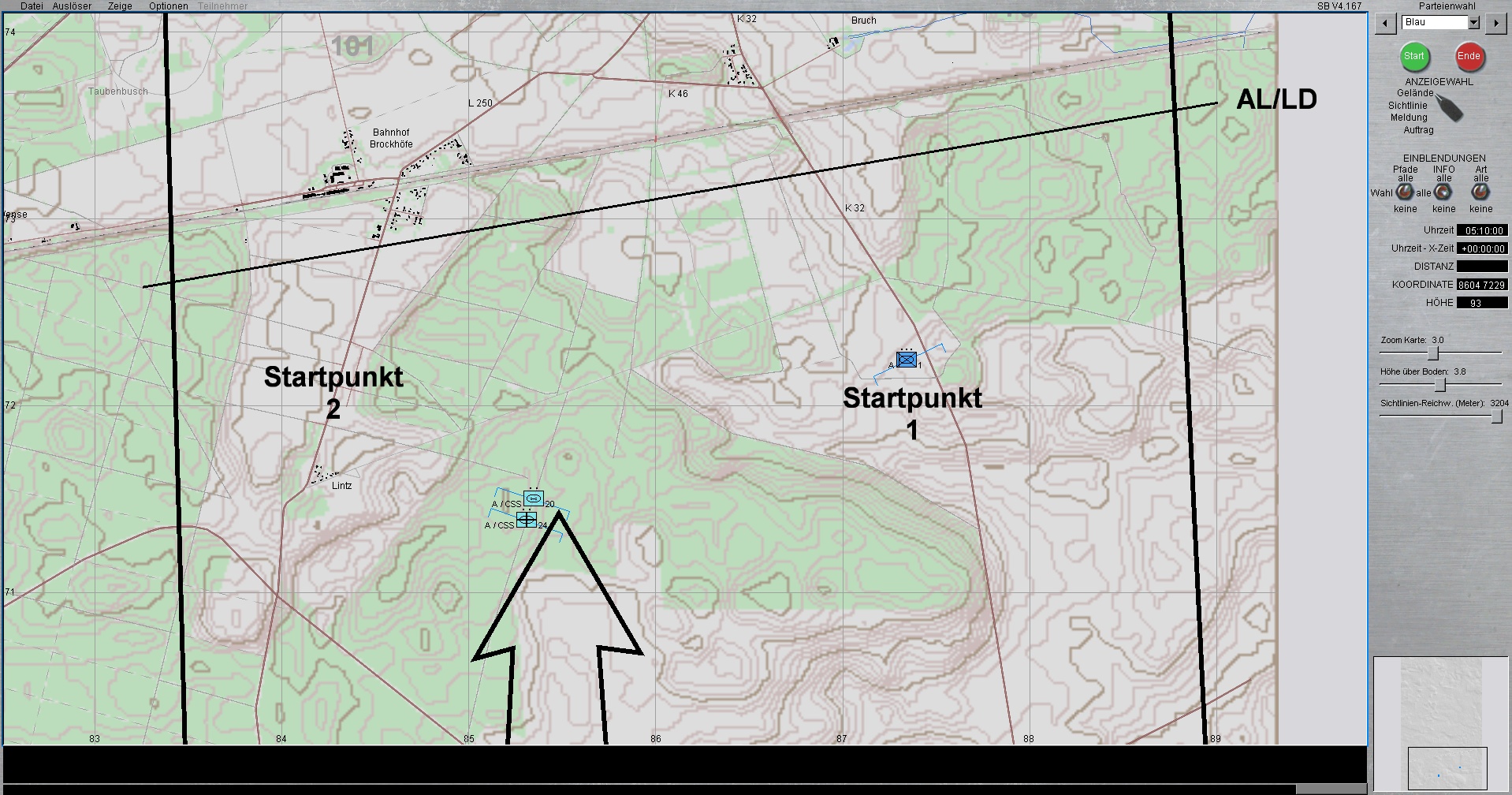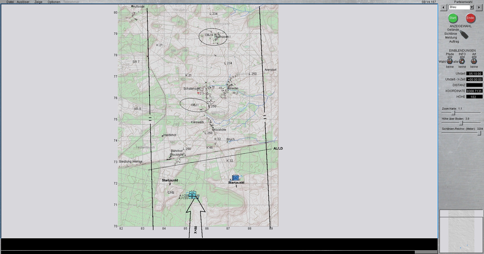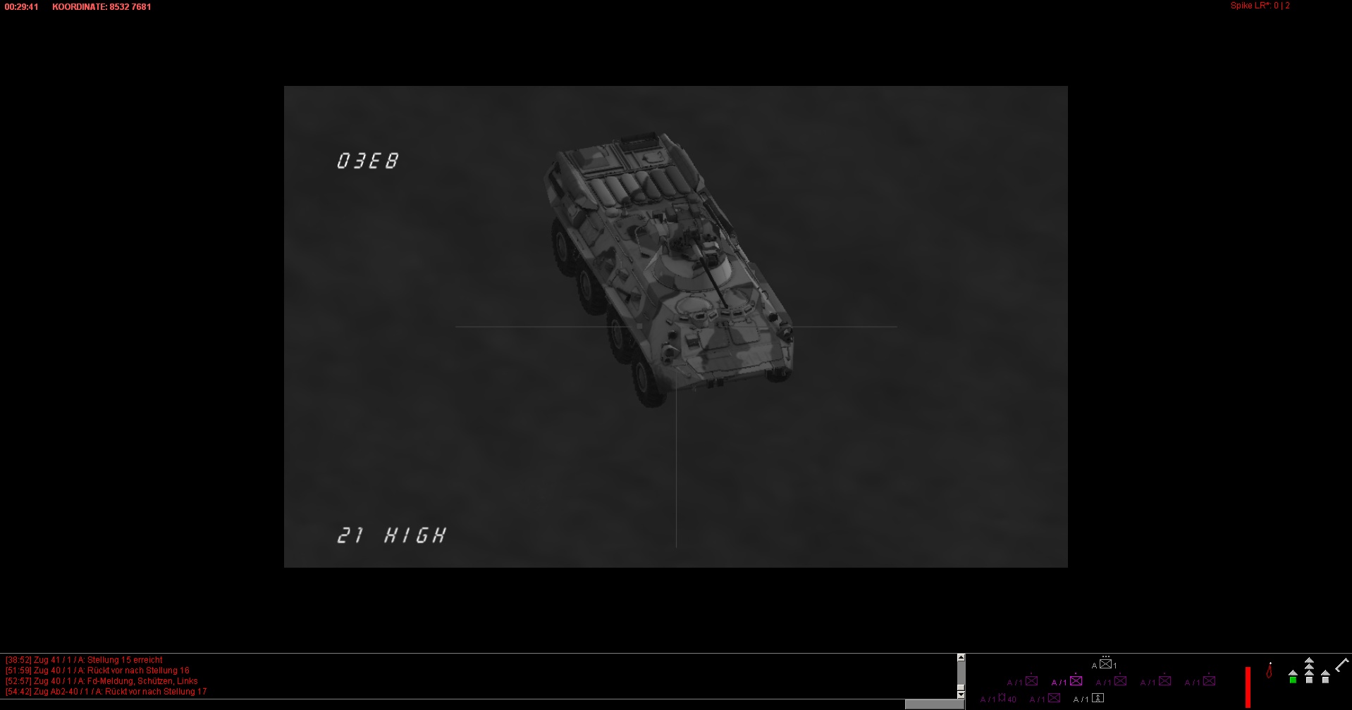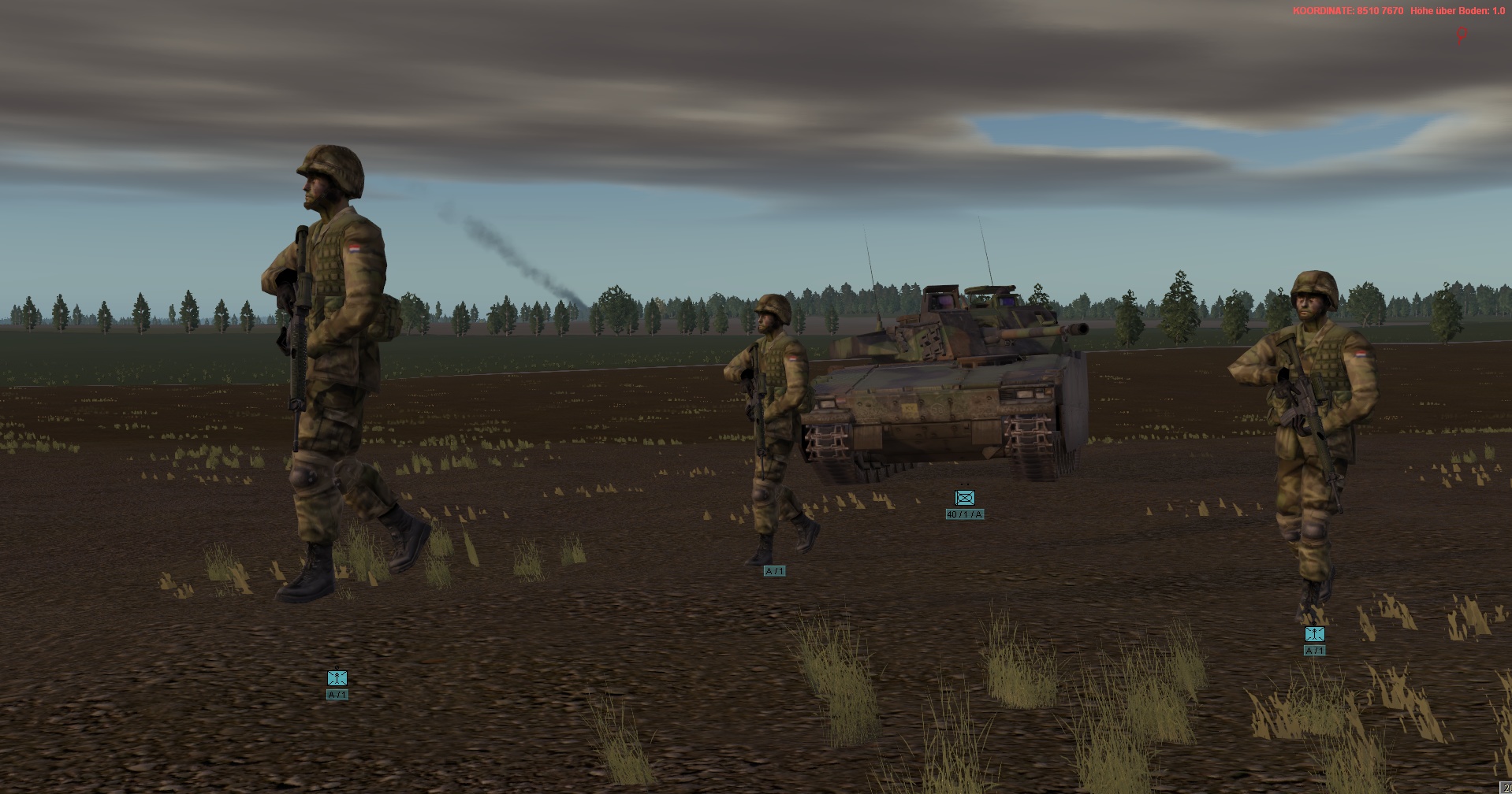 ROT ist eine Mech.Inf.Kp, die von einem Spieler beliebig verschoben und grob gesteuert werden kann. Allerdings kann keines der roten Fahrzeuge manuell zum schießen verwendet/missbraucht werden, sodass es nicht zum H2H kommen kann. Die KI feuert somit weiterhin selbstständig. Der menschliche rote Spieler, muss lediglich seine Einheiten und wenn gewünscht auch Sperren, bestmöglich verteilen und ggf bei Feindkontakt reagieren.