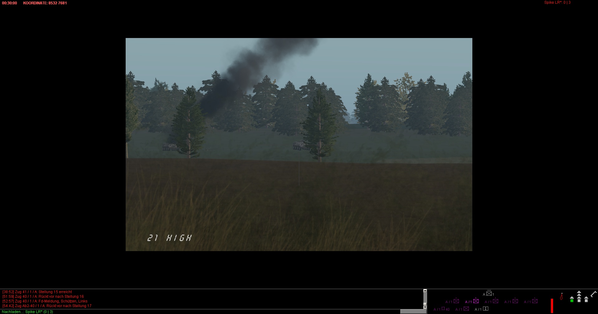 ROT ist eine Mech.Inf.Kp, die von einem Spieler beliebig verschoben und grob gesteuert werden kann. Allerdings kann keines der roten Fahrzeuge manuell zum schießen verwendet/missbraucht werden, sodass es nicht zum H2H kommen kann. Die KI feuert somit weiterhin selbstständig. Der menschliche rote Spieler, muss lediglich seine Einheiten und wenn gewünscht auch Sperren, bestmöglich verteilen und ggf bei Feindkontakt reagieren.