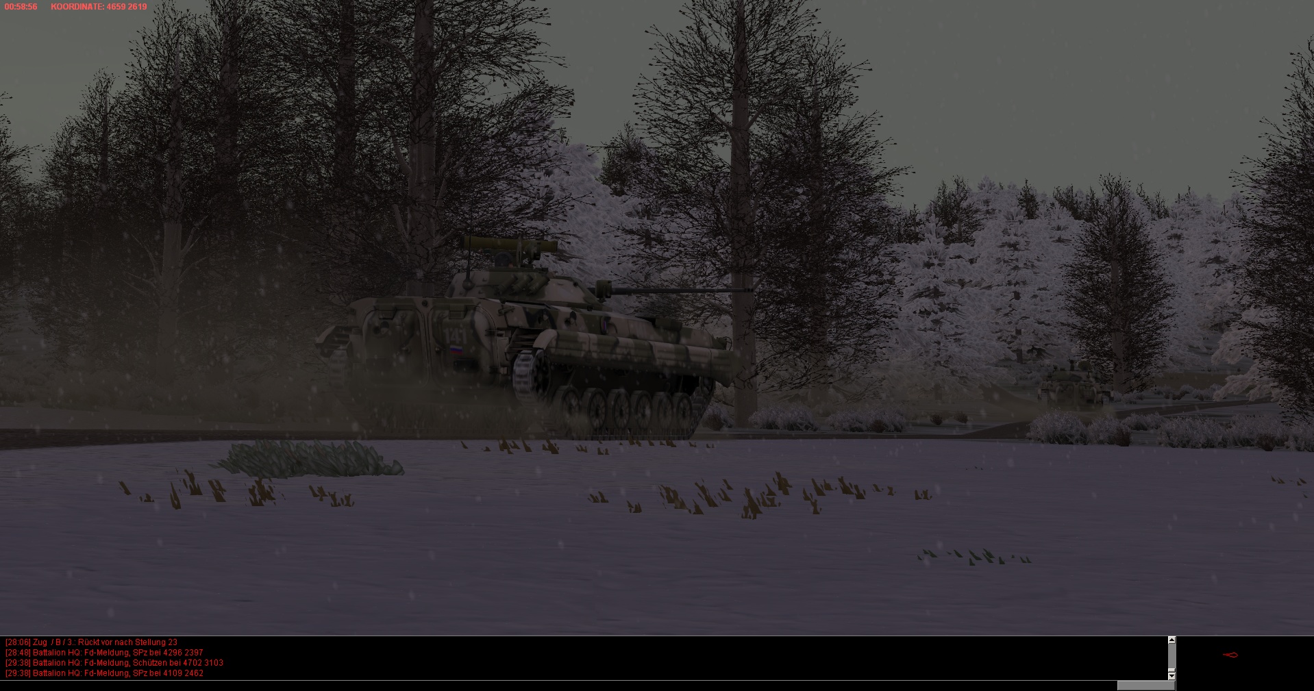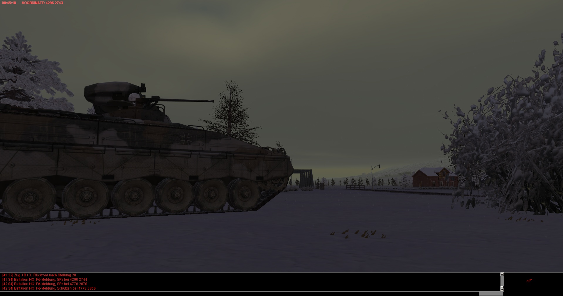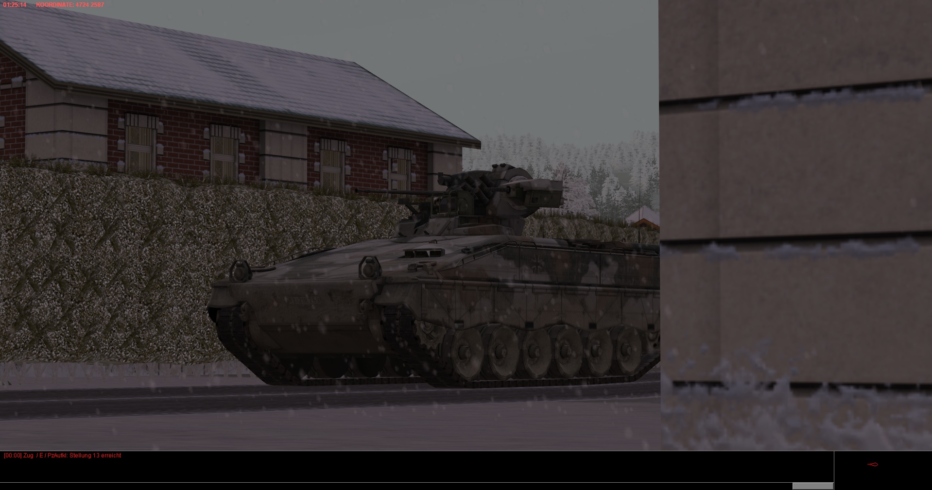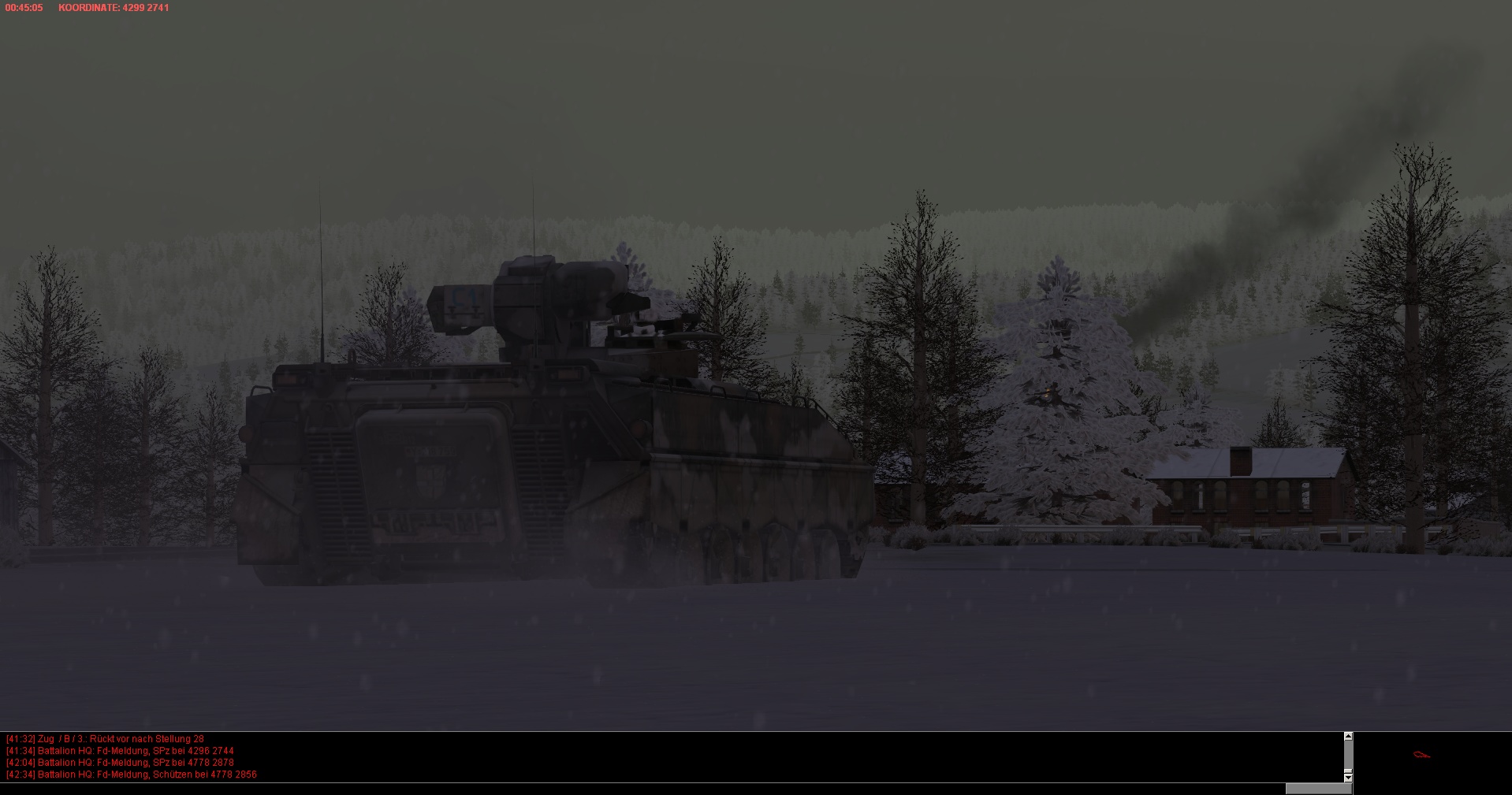 BRAVO ist durch fdl Artilleriefeuer, dass vor 2 Minuten vor ihm herunter kam, in eine gedeckte Position an der Ortschaft ausgewichen und hat auch seit dem keinen visuellen Kontakt mehr zum ALFA-Zg.