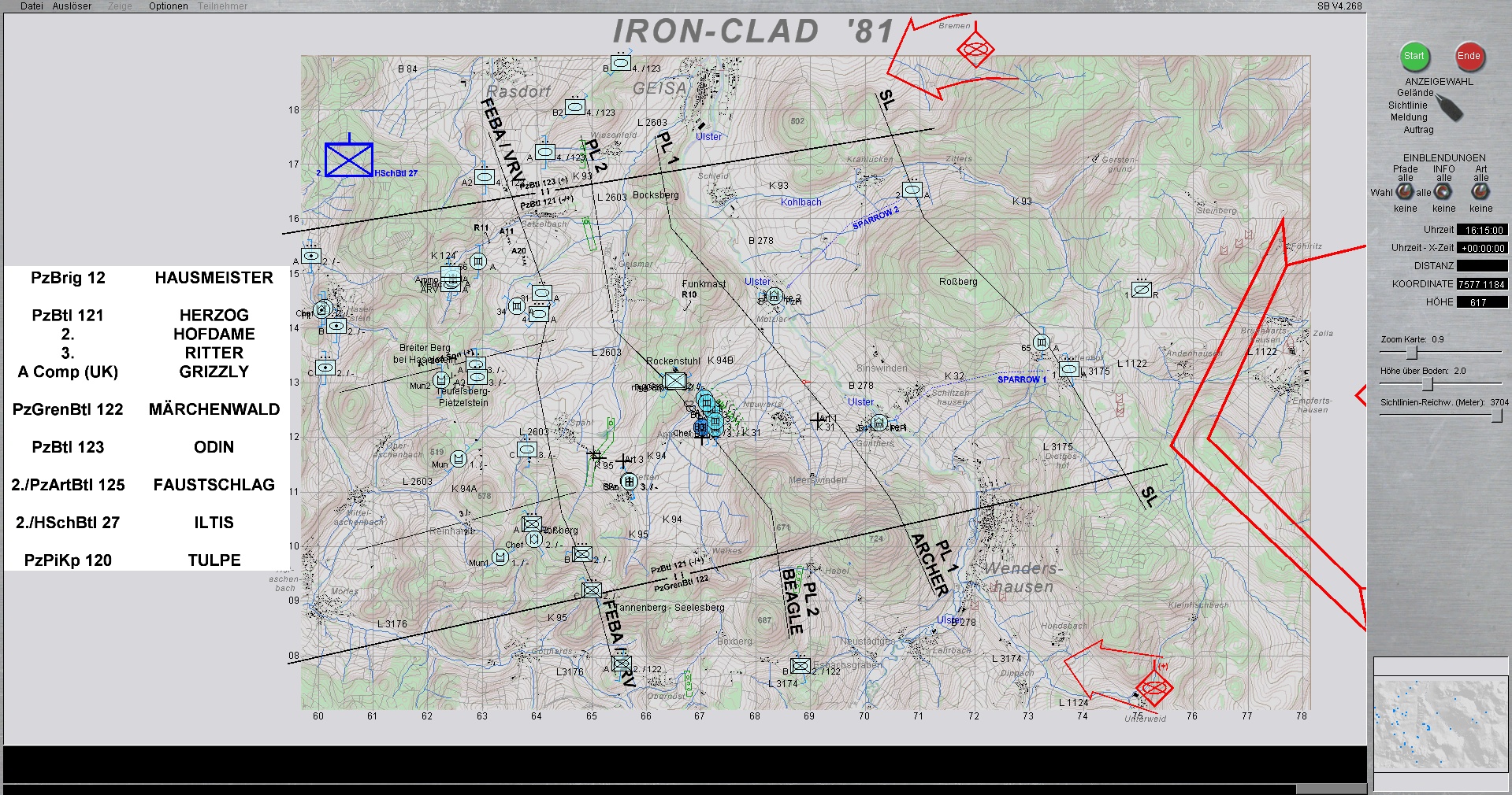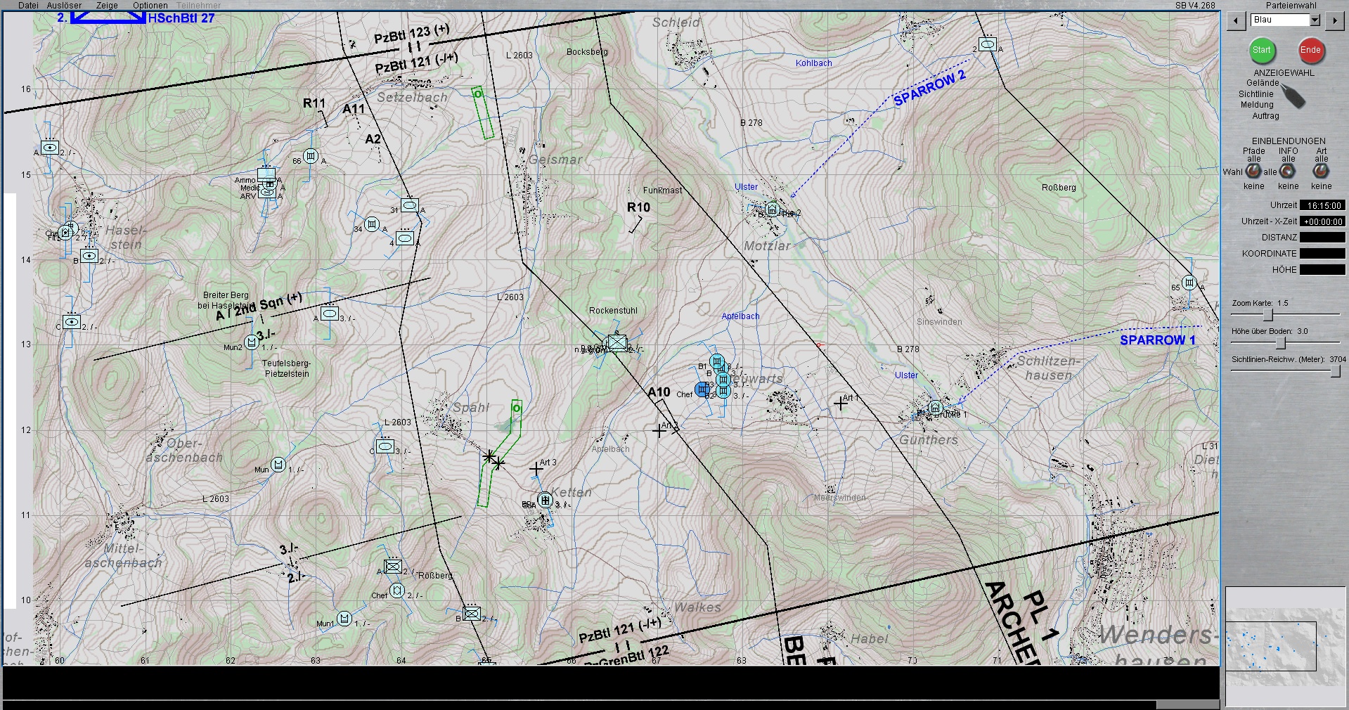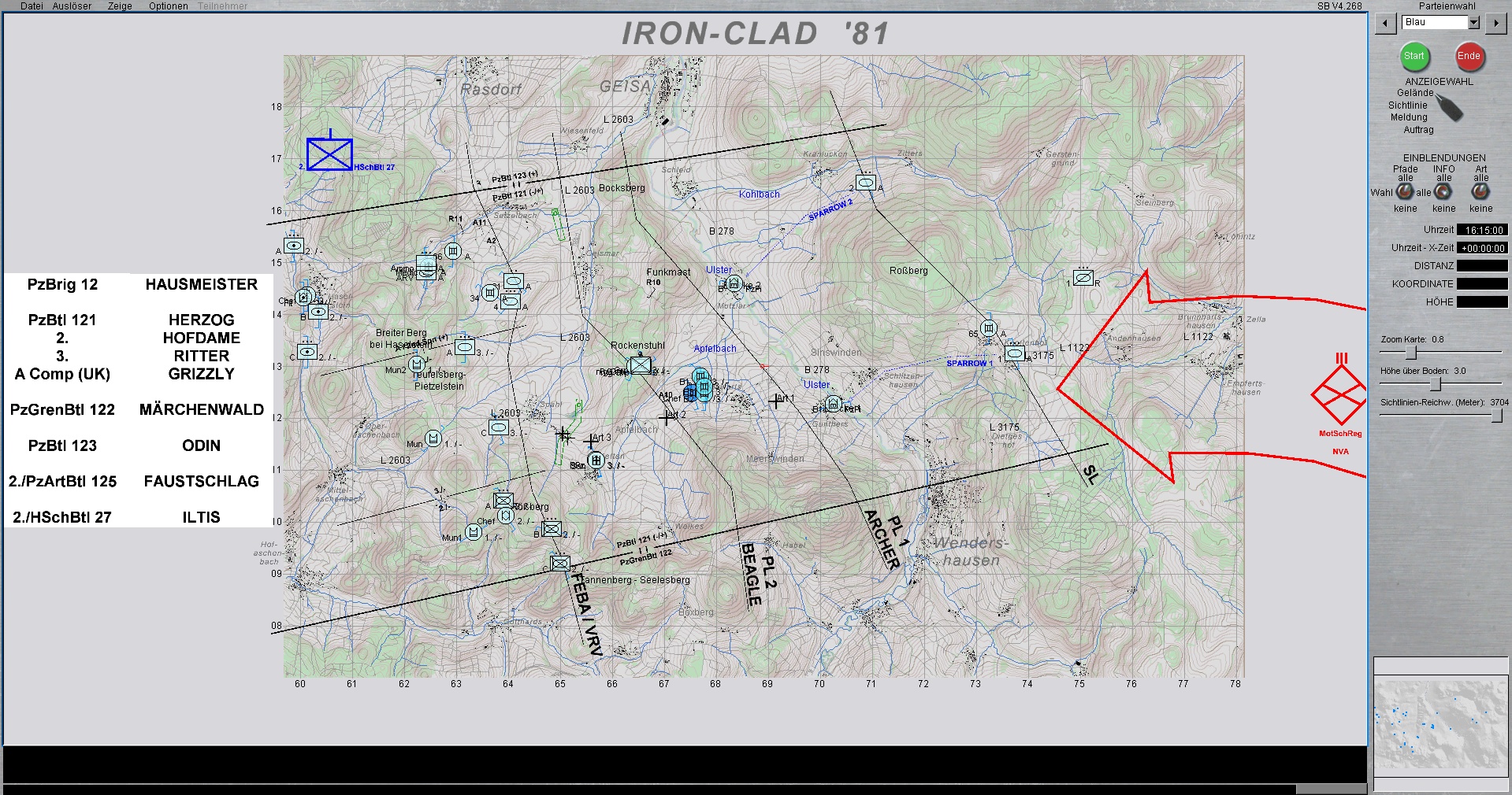 Das PzBtl 121 (-/+) ist südlich GEISA eingesetzt. Die 4.Kp wurde an das PzBtl 124 abgestellt und haben im Gegenzug eine britische PzKp unterstellt bekommen, die mit 2 Panzerzügen (Chieftain) und einem Scimitar Zug an der SL stehen und bald über SPARROW 1 & 2 ausweichen werden. Die anderen 2 Panzerzüge stehen bereits am VRV.
