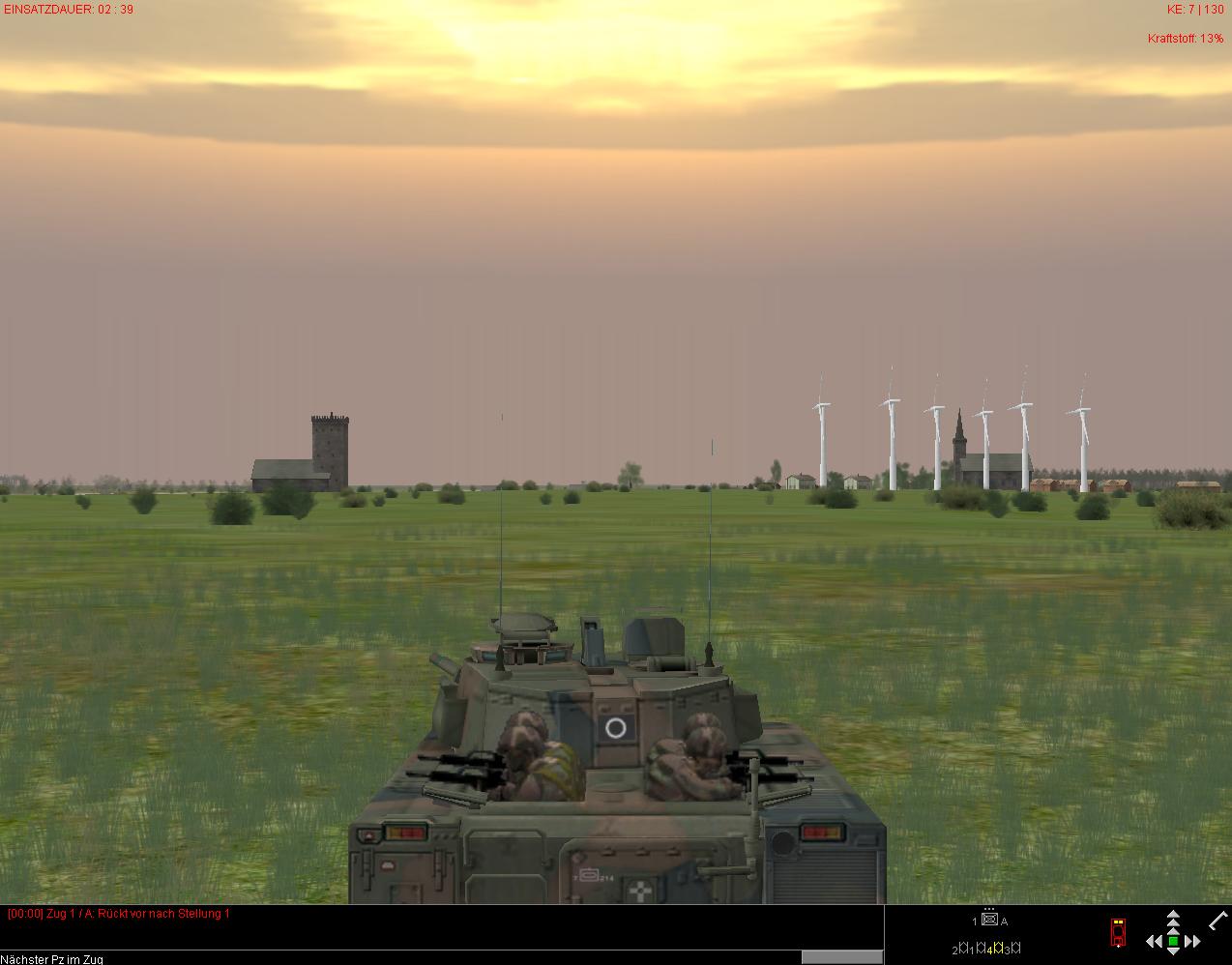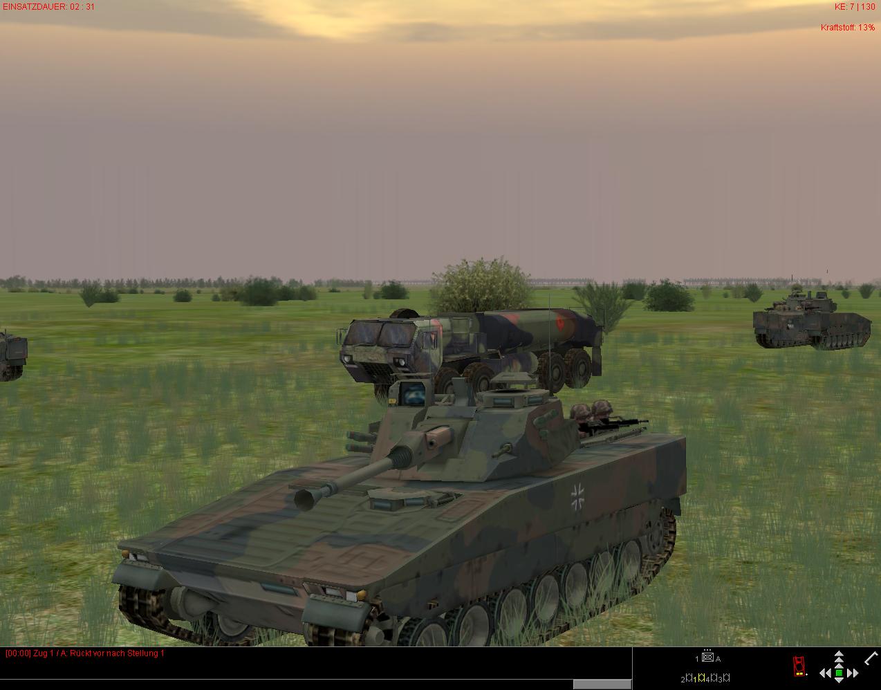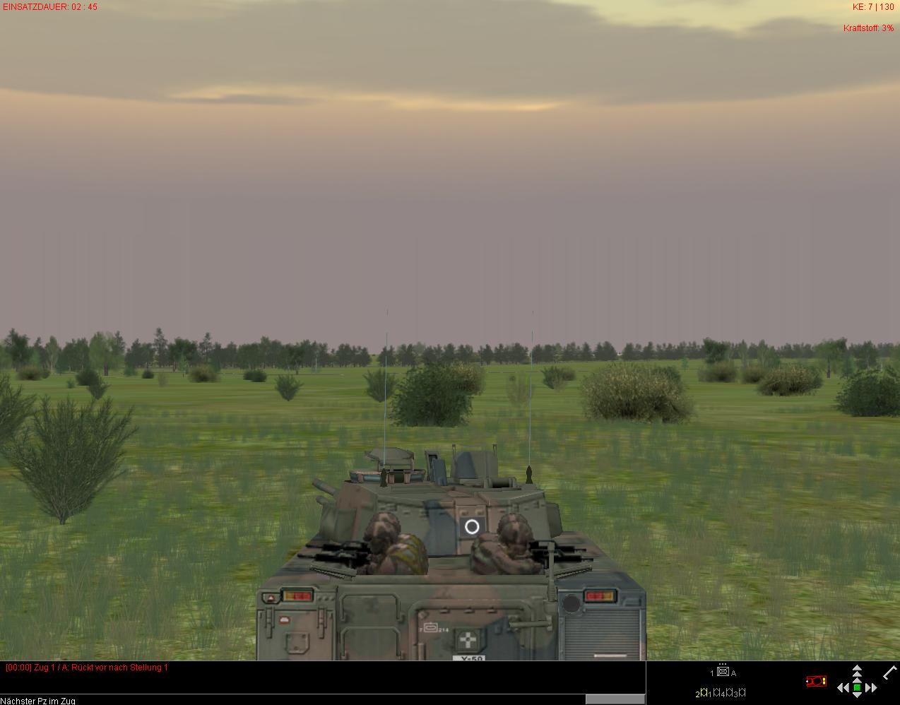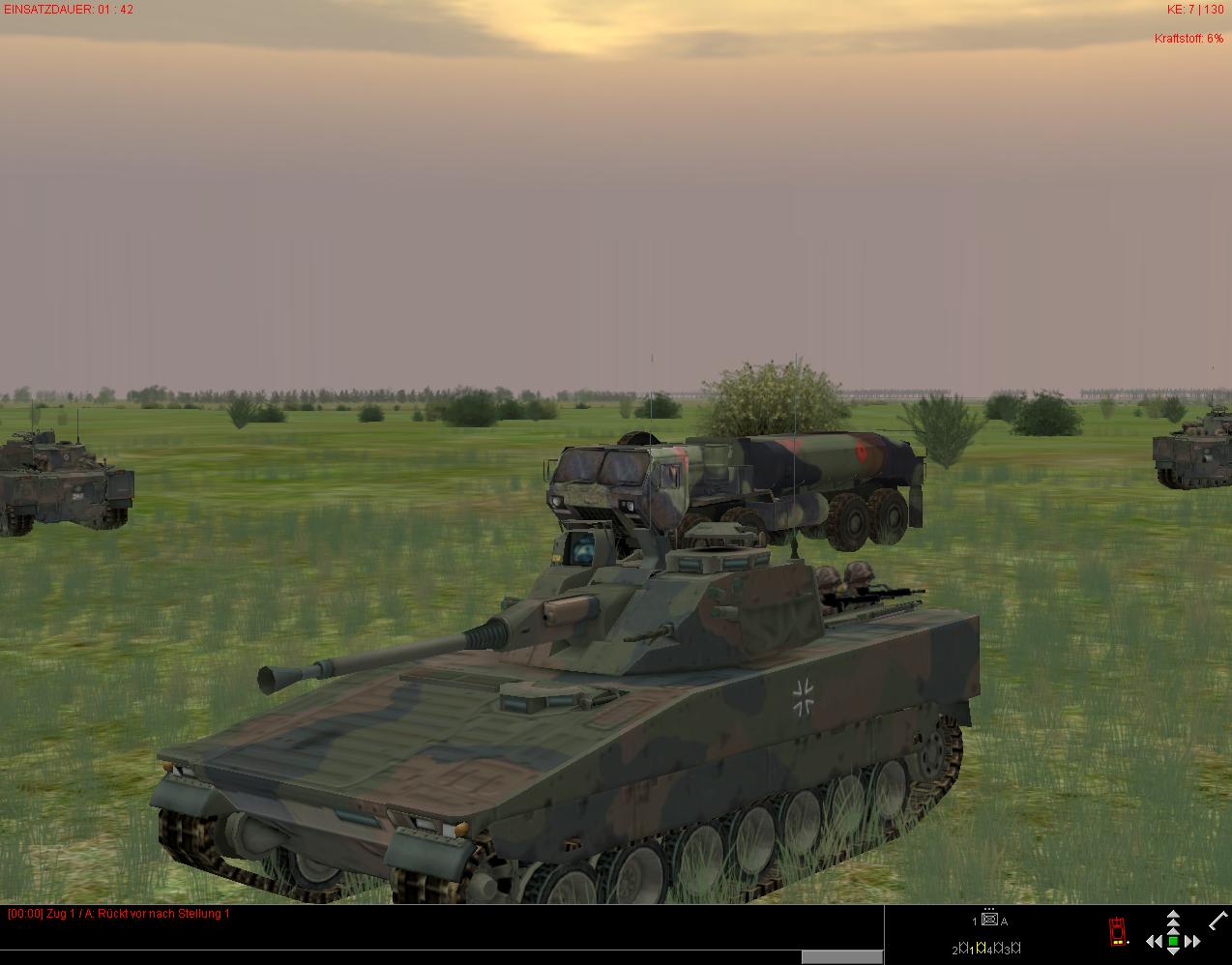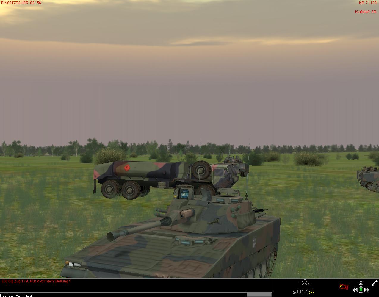 So, um mißverstandenen Ereignissen aus dem Weg zu gehen: kleine Übung: Zug CV9040B startet mit 3% Kraftstoff. Wegpunkt "Verbleiben" mit Formationsvorgabe "Rundumverteidigung", Fahrzeugabstand "Eng", Wegpunkt liegt unmittelbar bei dem eines Tankfahrzeuges* ebenfalls mit "Verbleiben". Sieht richtig gut aus, wenn die da so "drumrumstehen"