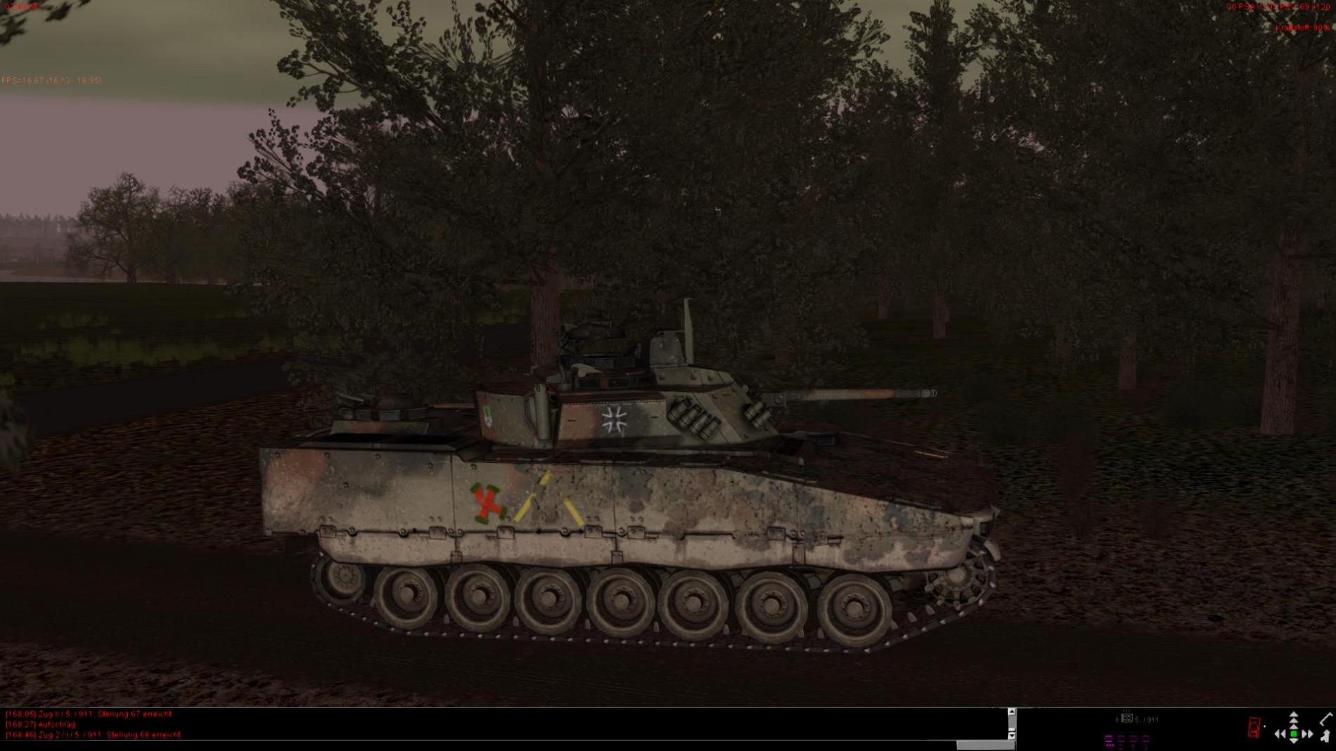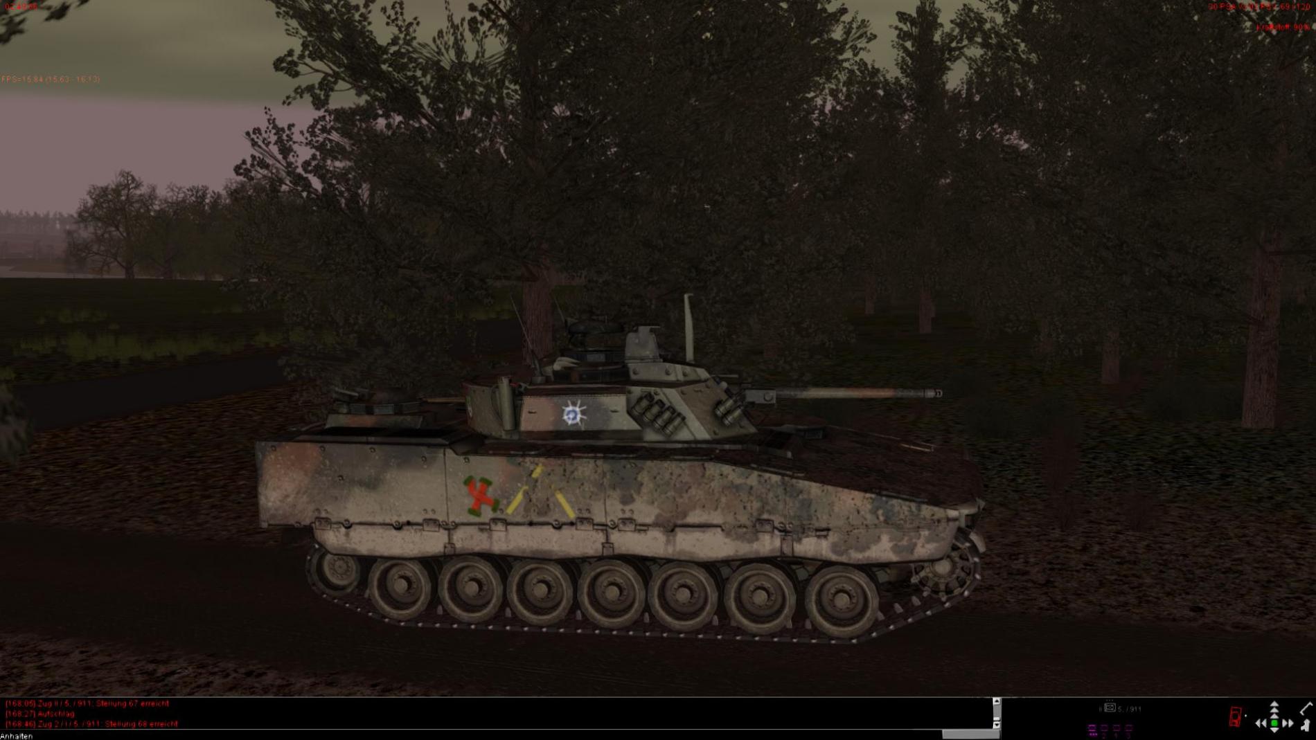 4. Wo steht feind bei den Übergängen bei X-HausenNach der Befehlsausgabe an der Bravo Zug durch den ZgFhr Tratt der Panzerzug entlang seiner Bewegungslinie in richtung AL an. Nach einem Kurzen Abmelde gespräch mit dem Feldposten der 5./911 tratt der 2 Halbzug bis zu Ablauflinie an un ging dort so in Stellung das der Breich Übergang A-Dorf und die Freifläche davor aufgeklärt werden konnten. Hierbei wurden 2 Spz und Infantrie aufgeklärt im Feuerkampf vernichtet wurden.