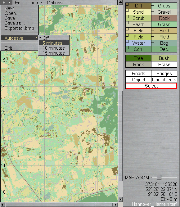 Für die Karten-Gärtner gibt es jetzt neue Dinge, und ein paar Arbeitserleichterungen. Erstens kann man jetzt eine Autosave-Funktion aktivieren. Standardmäßig ist sie abgeschaltet - manchmal will man ja einfach nur ein bißchen was ausprobieren, und wenn man dann kein Backup der Datei angelegt hat, ist schnell Schaden angerichtet. Daher muß diese Funktion immer bewußt aktiviert werden.