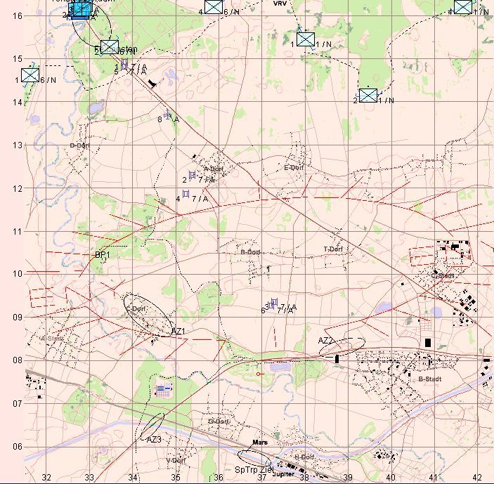 9. Division verteidigt mit Brigade 91 und 92 in vorderster Linie und hält die Brigade 93 als Reserve zurück. Panzerbataillon 911 (+/-) ist durch vorangegangen Angriff bis auf Höhe Kallethal vorgekommen, reorganisiert und führte Versorgung mit MVG durch. Das PzBtl 911 hat die Fühlung zum Feind verloren. Meine Absicht ist es mit Spähtrupps C-Dorf aufzuklären und die Übergänge Tyr, Mars und Teutates auf Gangbarkeit zu prüfen um eine günstige Ausgangssituation für den weiteren Angriff zu haben.