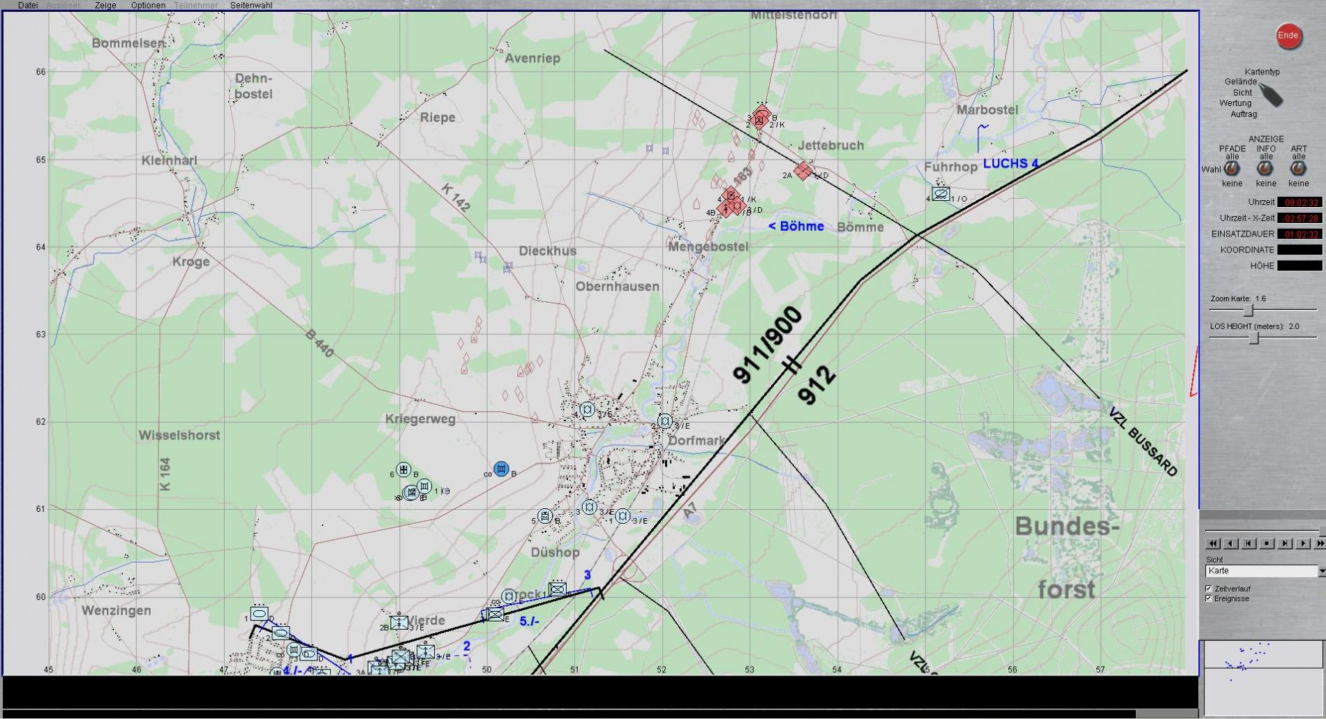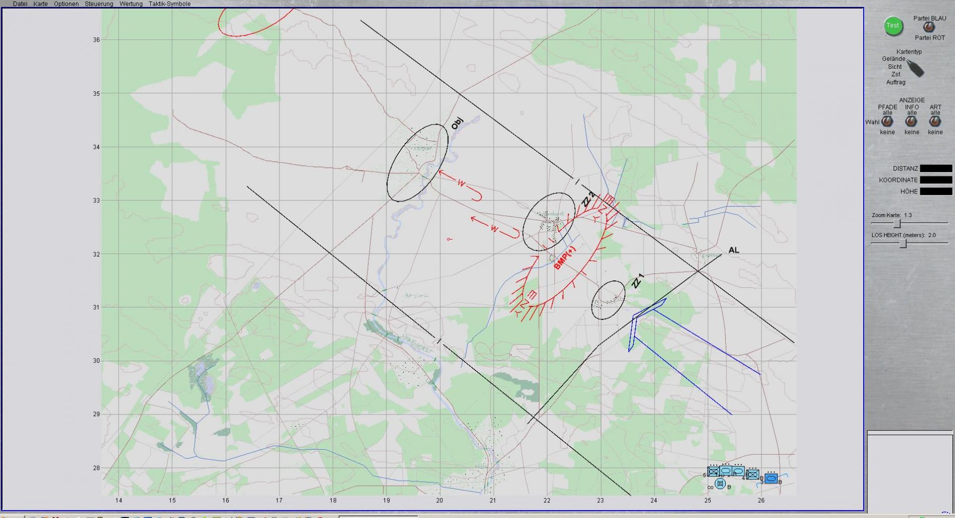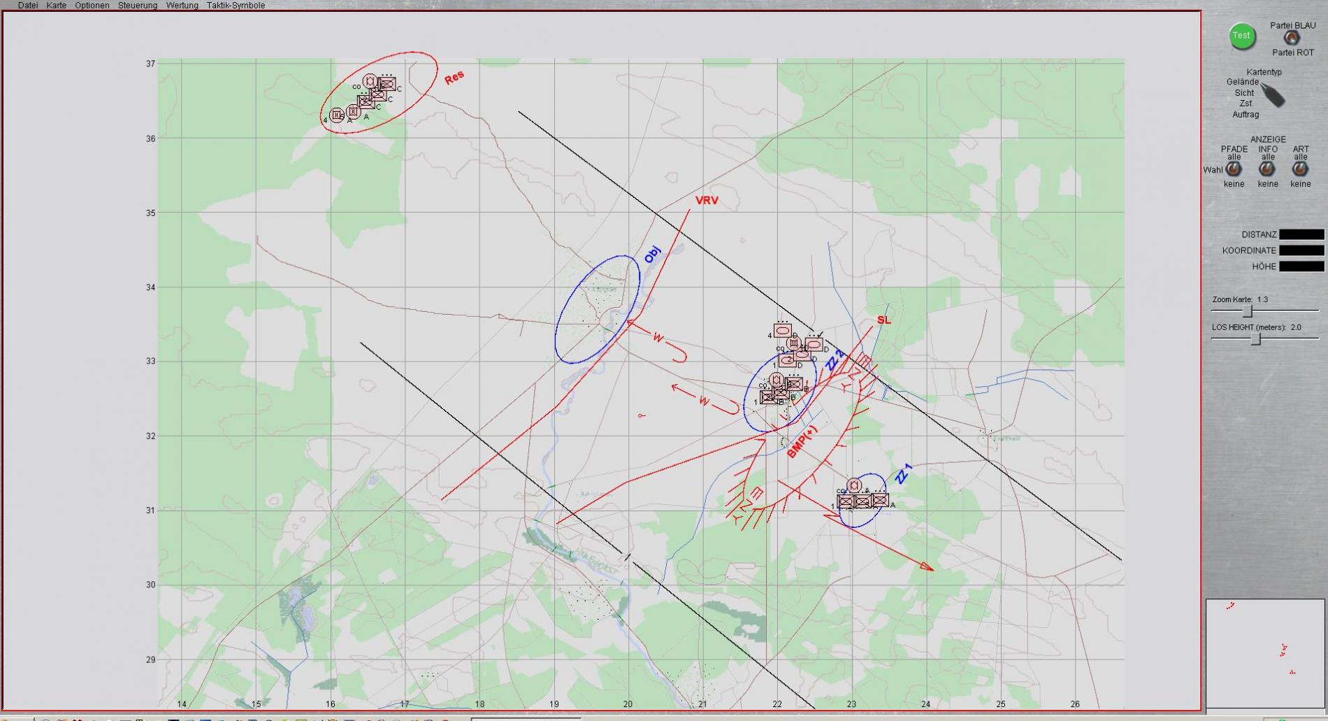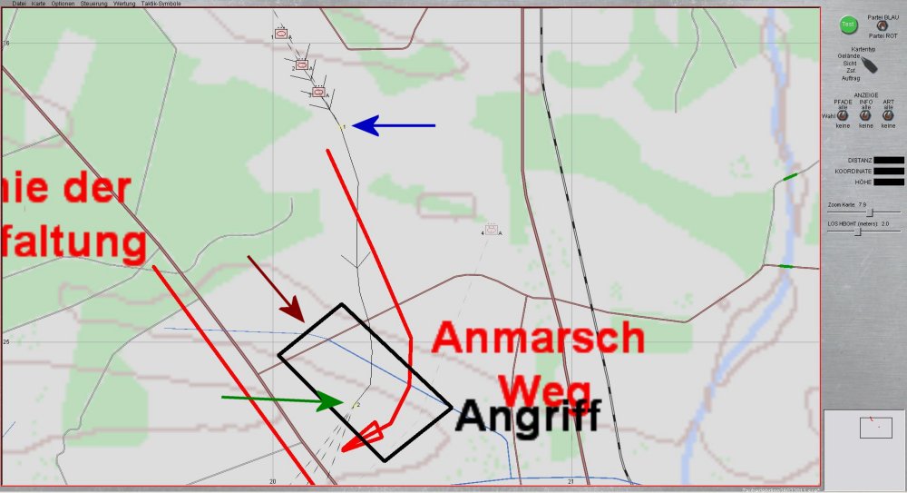 - Wertung nach Räumen- ROT verzögert mit 2 Kompanien SPz und einer Kompanie KPz zwischen SL und VRV so, dass Feindkräfte BLAU bis VRV auf 65% Kampfkraft zerschlagen werden