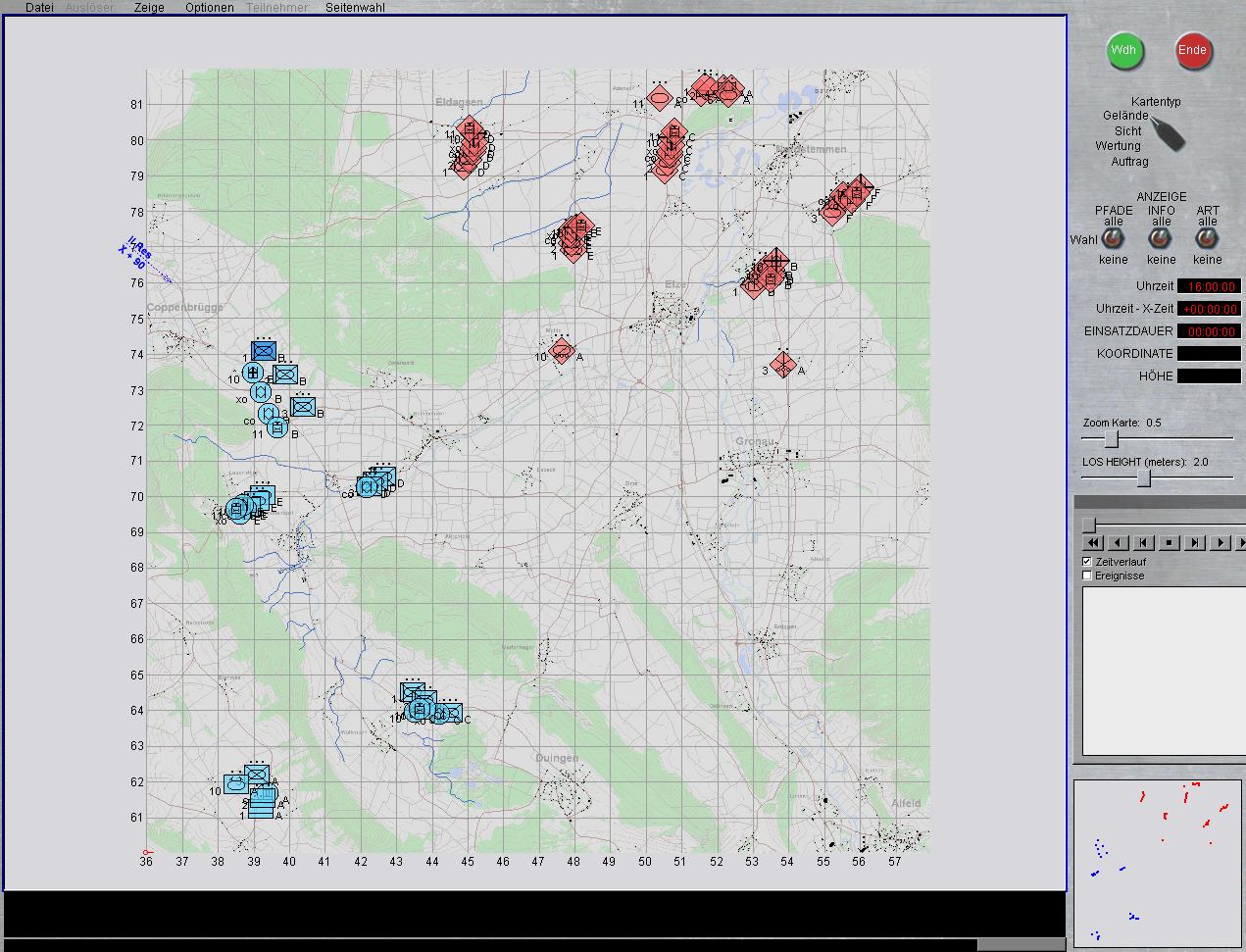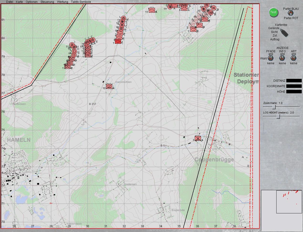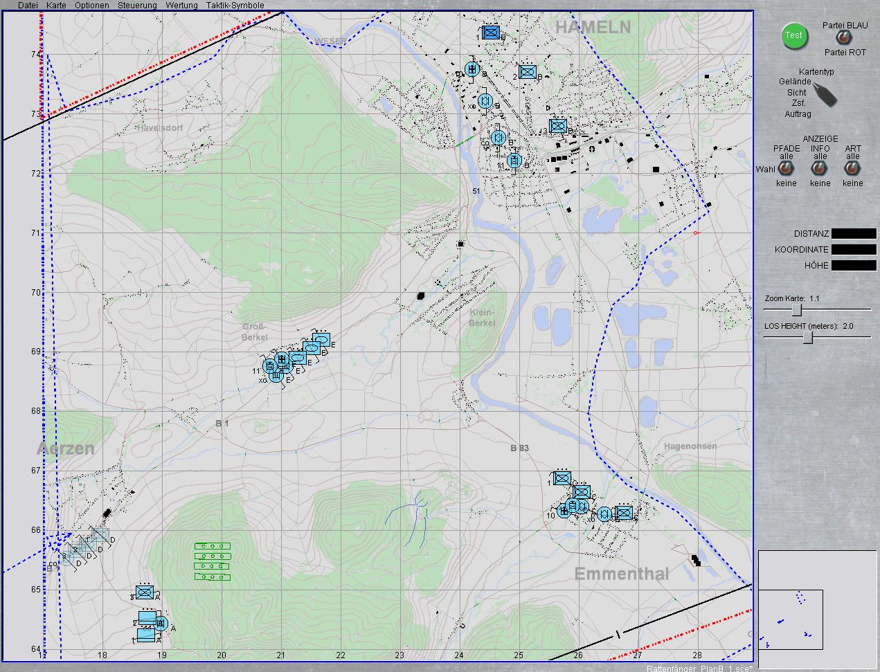 Das Ausgangs Sce (Rattenfaenger_PlanB_1.sce) hat Stationierungsräume für beide Seiten, Strafräume beiderseits der Kp Grenzen und eine Sichtweite von 2.000.