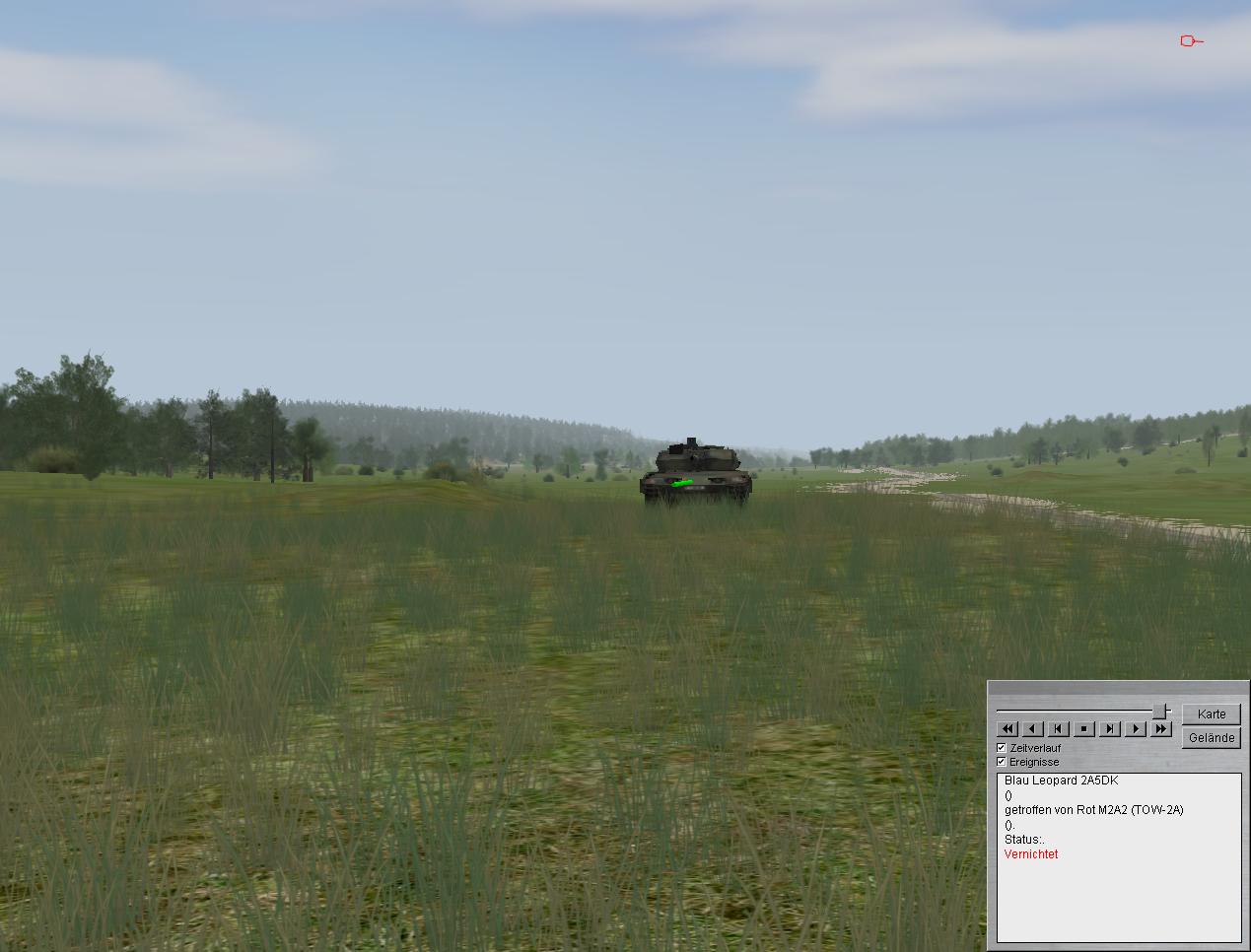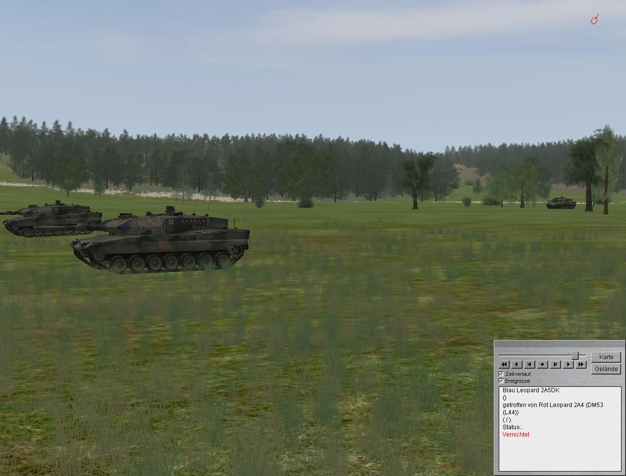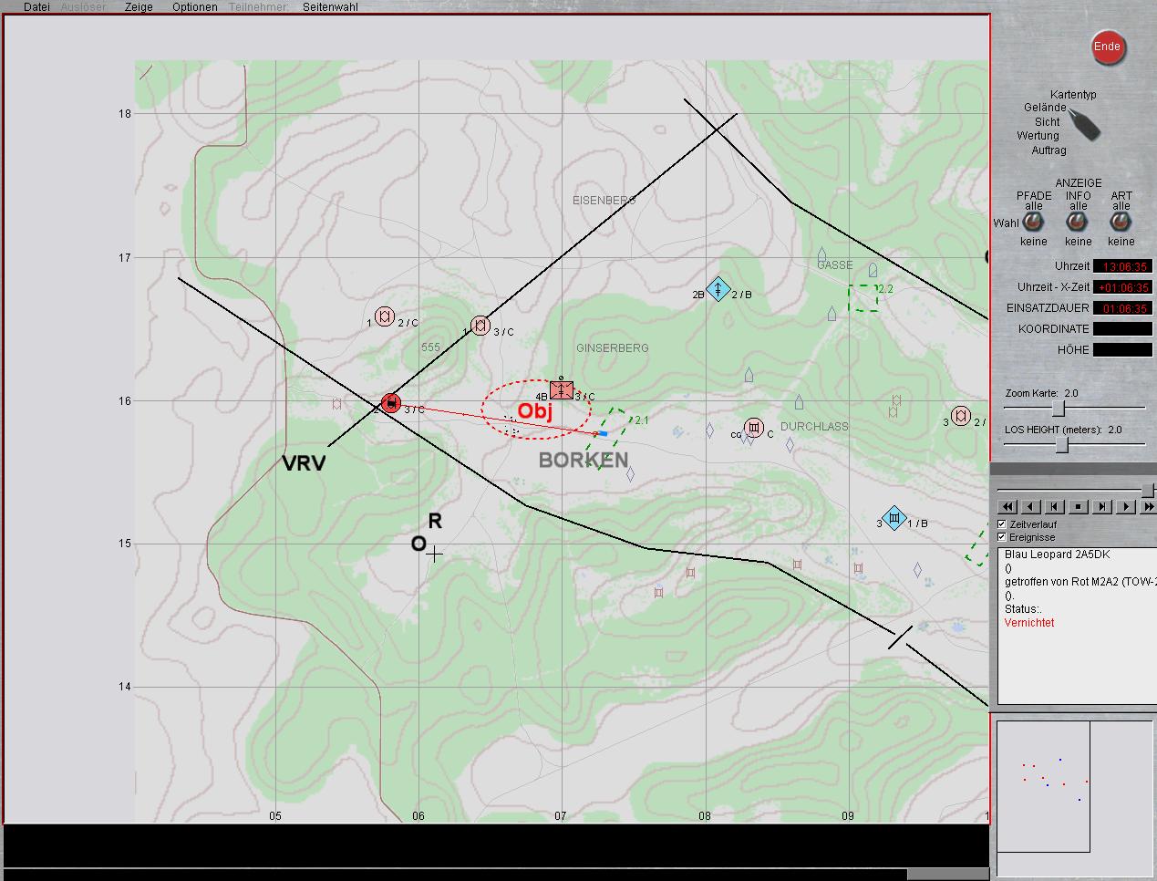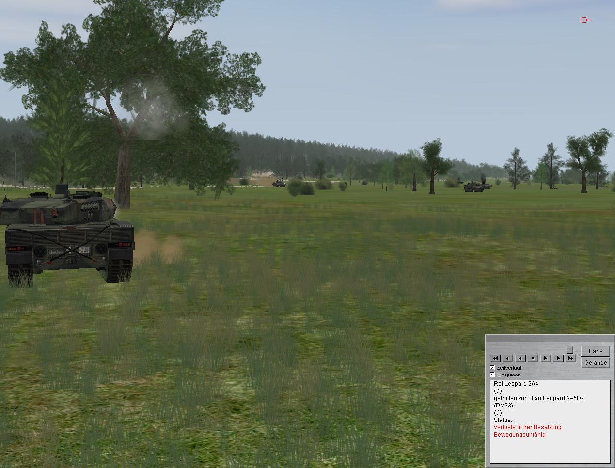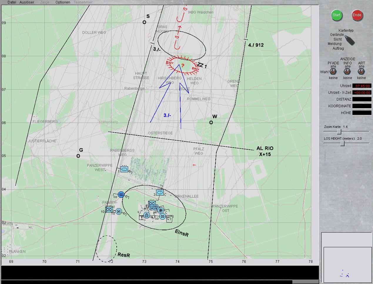 ausgewichen. Spitzen in Stärke einer verstärkten/verminderten Panzerkompanie (Leop 2A4/Marder 1A3) verzögern derzeit aus Stellungen im Raum GRASHÜGEL - IABG WÄLDCHEN - GALGENBERG. Feind hat vorübergehend Luftüberlegenheit erlangt.