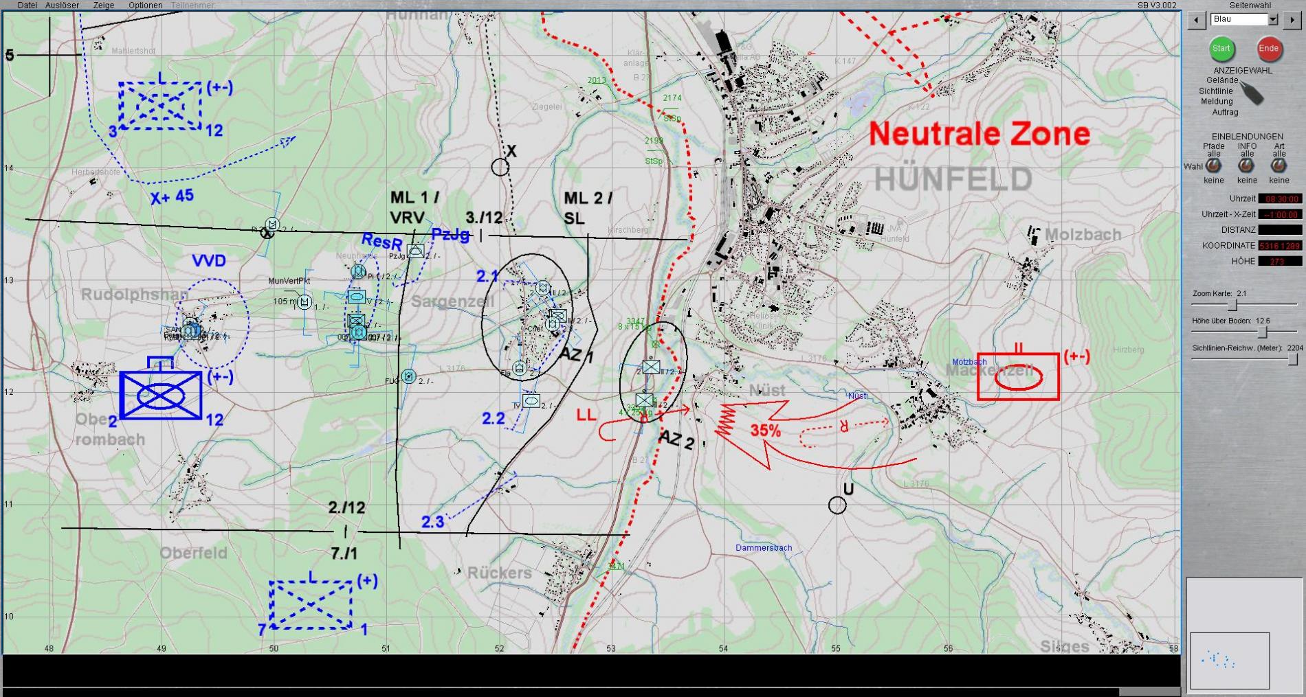 Erste Staffel eines verstärkten verminderten Panzerbataillon und Luftlandekräfte in Kompaniestärke im Raum SARGENZELL - RÜCKERS - NÜST zerschlagen.