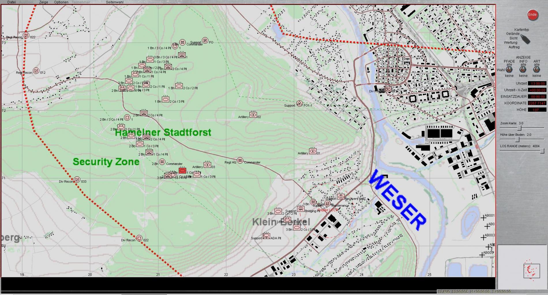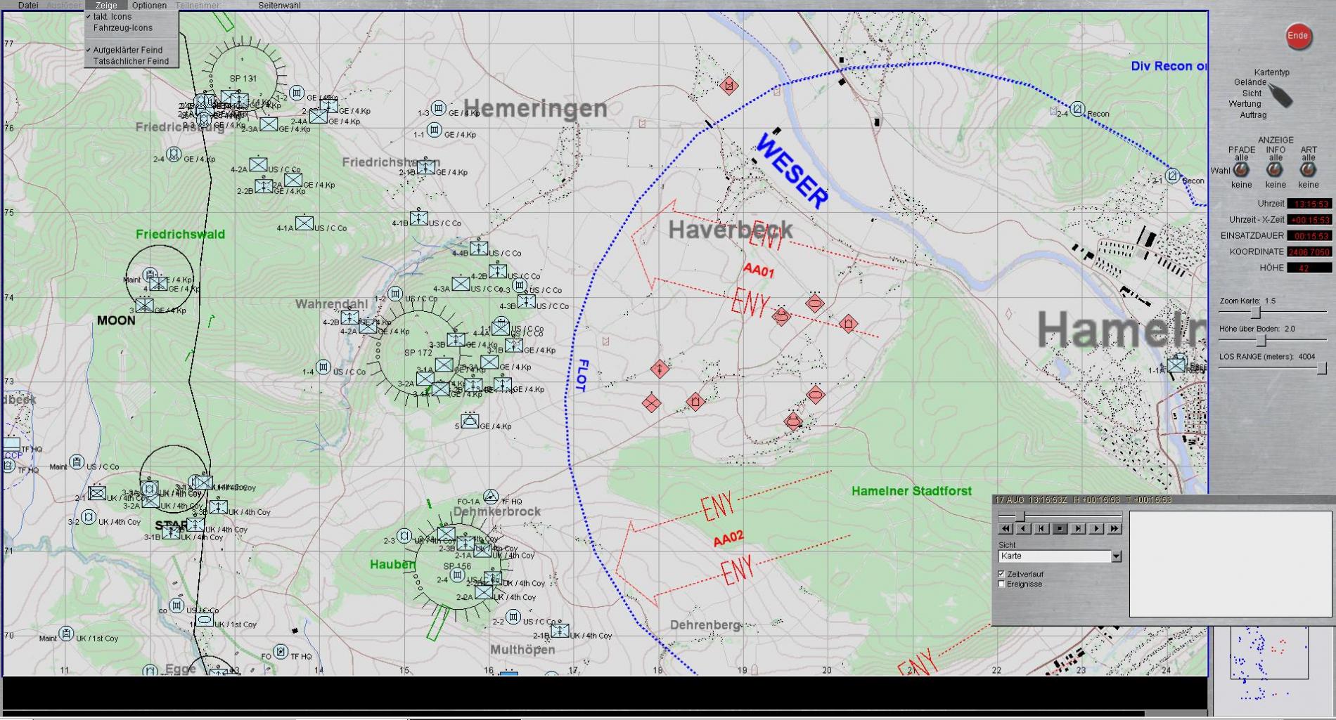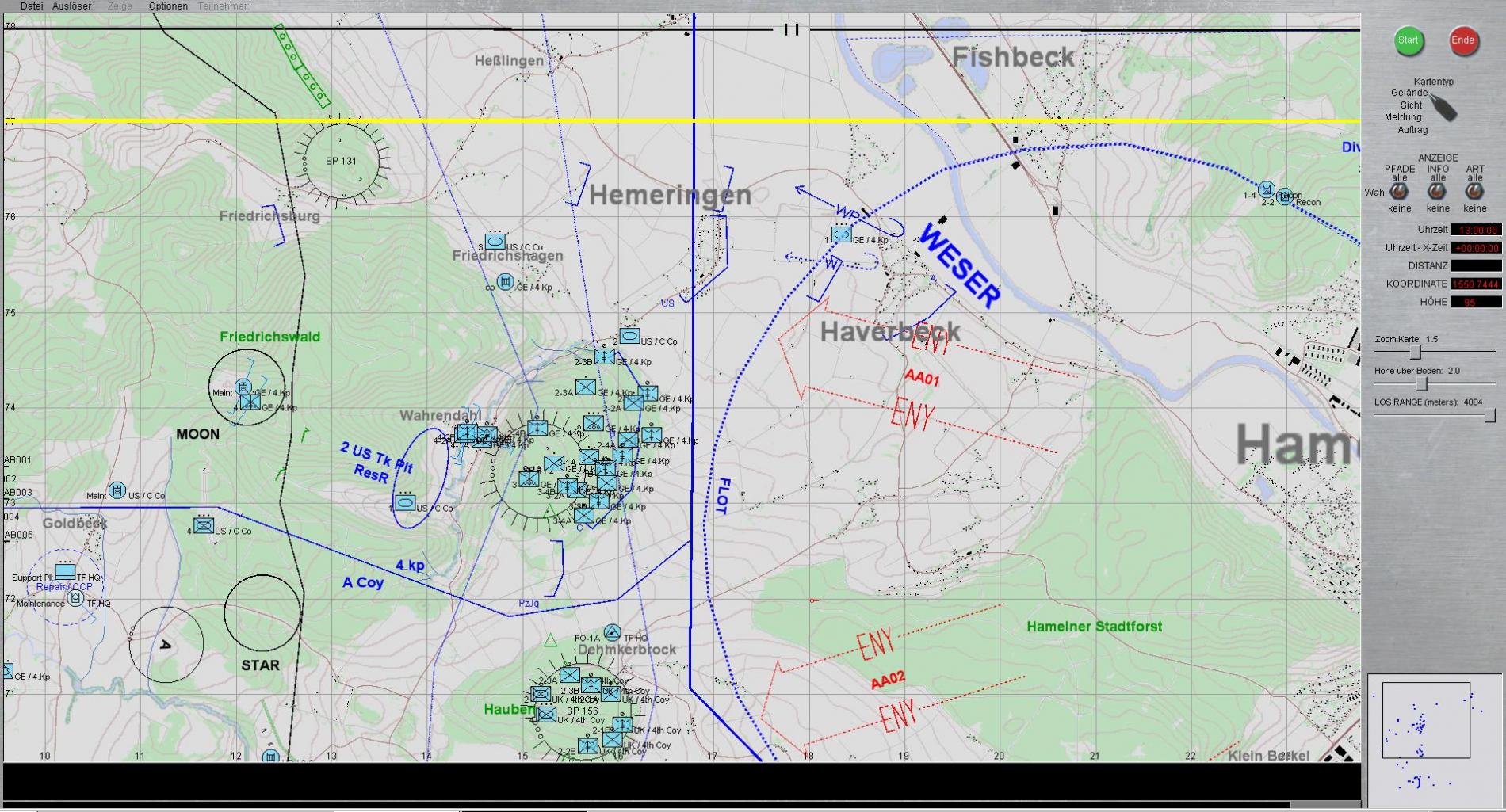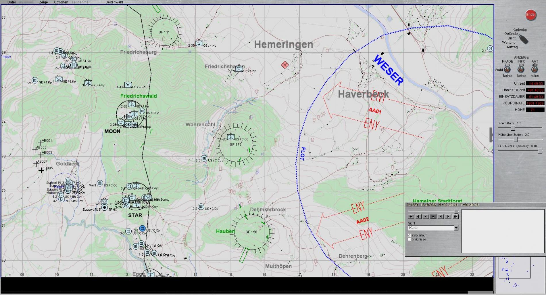 - Ich soll SP 131; SP 172, Brücke WAHRENDAHL, Waldstück westlich FRIEDRICHSHAGEN und Obj MOON mit Infanterie besetzen, wobei noch verlangt wurde alle Füchse an den linken Kartenrand zu ziehen!!!Das war der Moment in dem ich sehr gern wieder ins Bett gegangen wäre!!