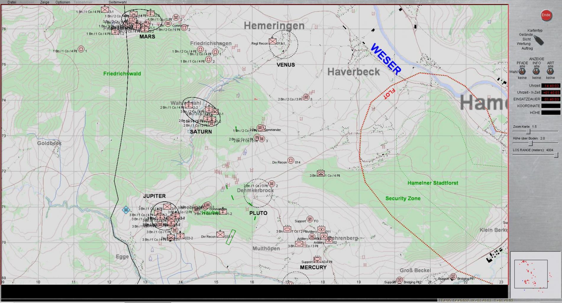 Vermutete Absicht des Gegners ist es den Brückenkopf HAMELN weiter aus zu weiten um so die Voraussetzungen für einen weiteren Stoß Richtung Westen zu schaffen.NATO Gefechtsverband verzögert planmäßig nachstoßenden Feind und verwehrt weitere Geländegewinne bis X+120 Minuten.