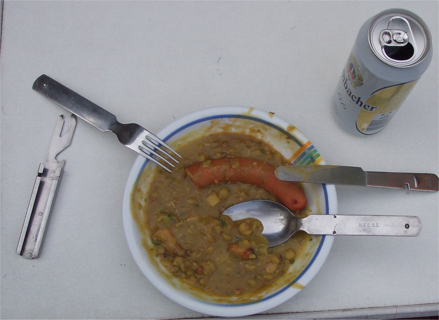 - Kdt: Öffnet die Dosen Erbseneintopf und Würstchen (Wurstwasser kann zum späteren verlänger oder als Wasserersatz verwendet werden),