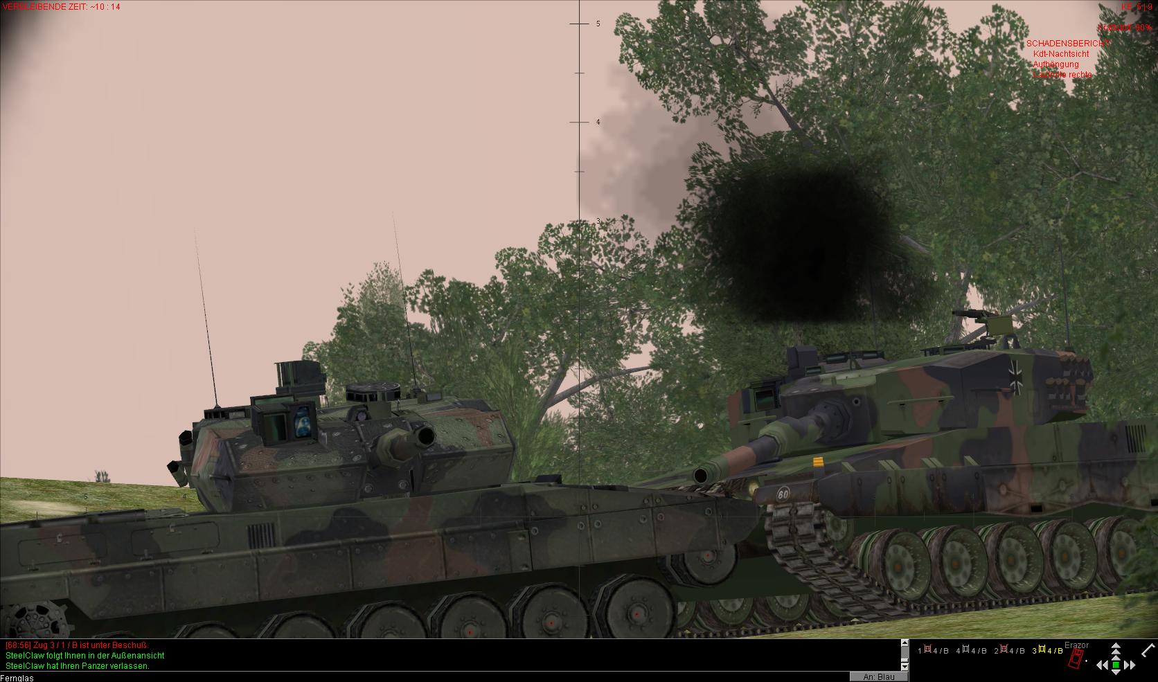 An dieser Stelle Kompliment an die Kampfpanzer-Besatzung:cool:! Anhand AK wurden die Grenie-Stellungen durchstoßen. Asche auf mein Haupt, denn ich konnte in diesem Bereich nur ein Kampfpanzer vernichten...Ich bleibe dann zukünftig bei meinen Kampfpanzern...:oDas war mein Leo. Endlich weiß ich, wer mir den Fuchsschwanz an der Antenne ersetzt