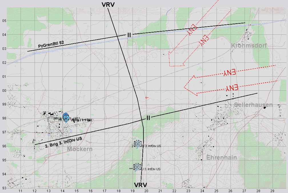 PzBtl 911 befindet sich nach wie vor in der Verteidigung und konnte den Raum Zwischen den Ortschaften MÖCKERN und SELLERHAUSEN behaupten. Jedoch mussten unsere Nachbarn im Verlaufe der vorangegangenen Gefechte weiter als geplant nach Westen ausweichen und haben starke Verluste erlitten. Die Ortschaft SELLERHAUSEN ist zu 90% evakuiert. Der Ort wird aufgegeben. Die Sicherungsteile sind bereits zurückgenommen worden. PzBtl 911 mit drei Kampfkompanien im Bereich MÖCKERN-SELLERHAUSEN eingesetzt, ist voll einsatzbereit.Hinweis: Die Übergänge an der lienken Btl-Grenze sind taktisch wichtig. Eine Sprengung dieser darf nur im äußersten Notfall, wie zB. Durchbrechender Feind in der Flanke, erfolgen.