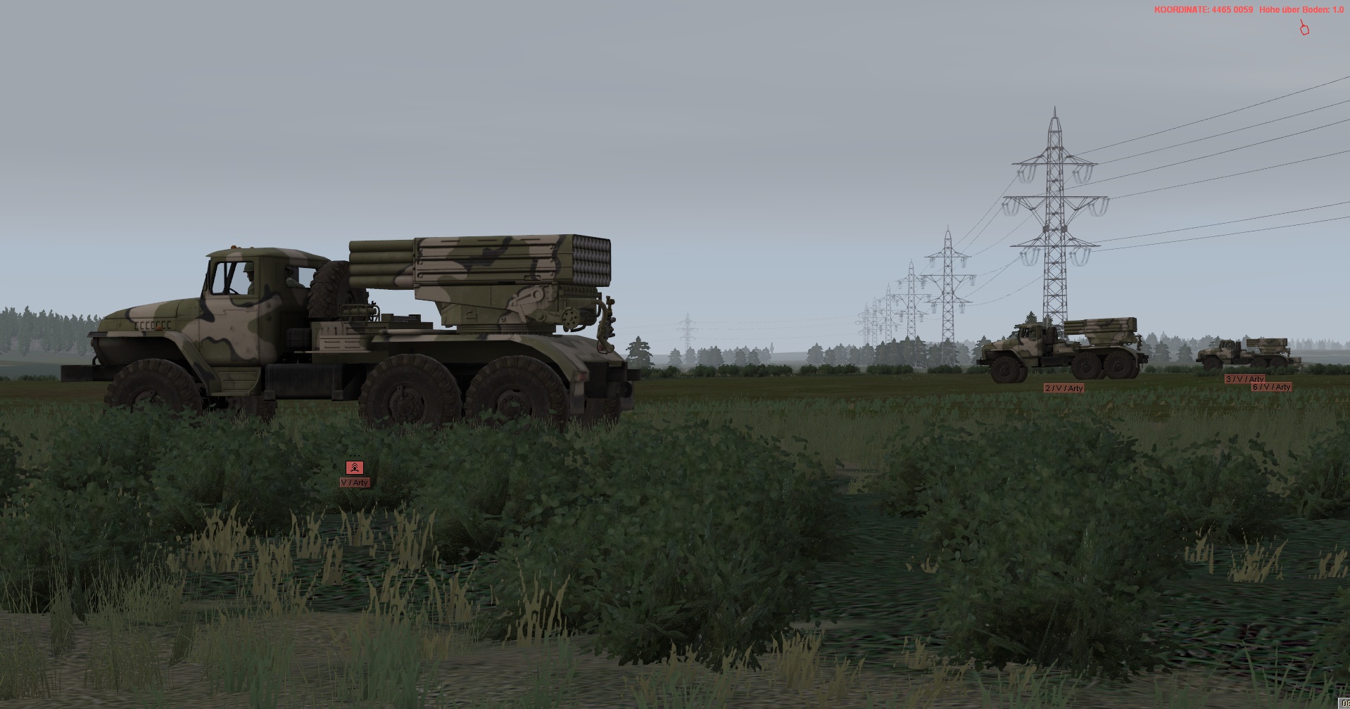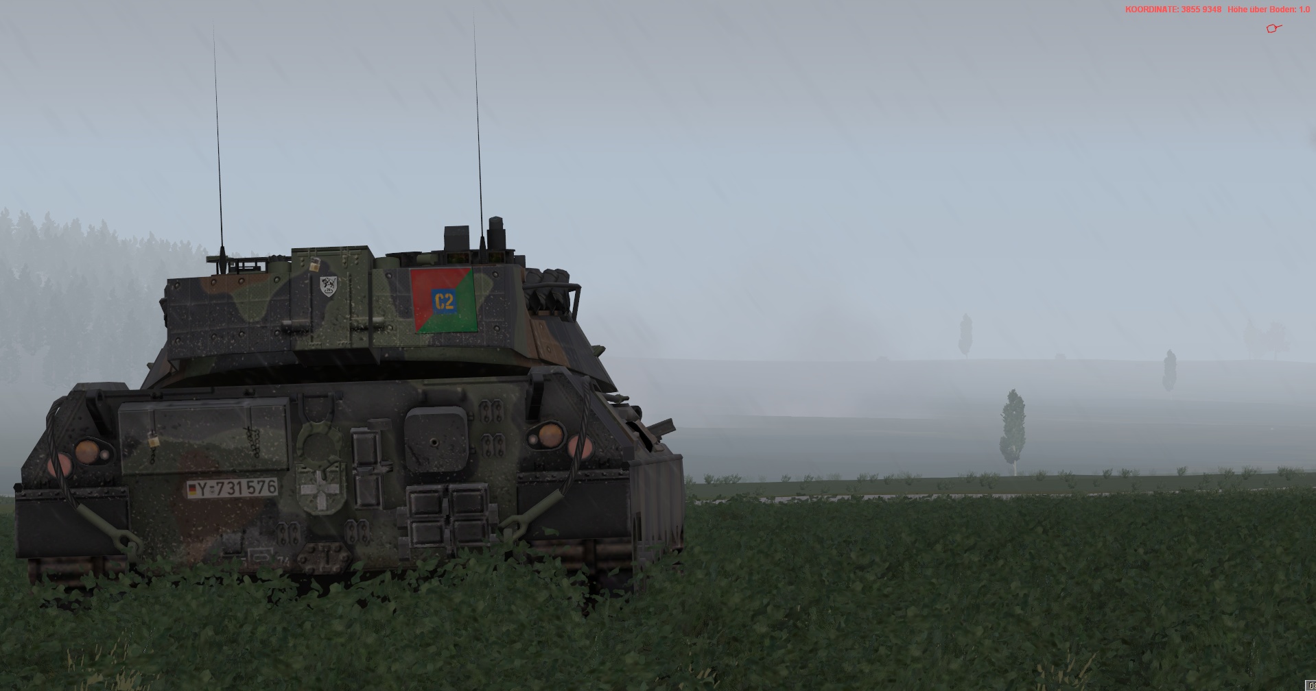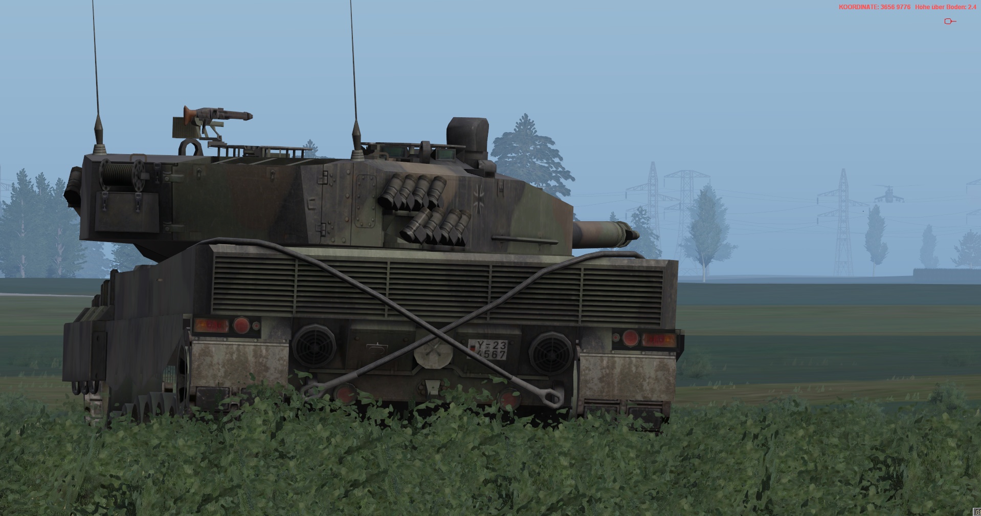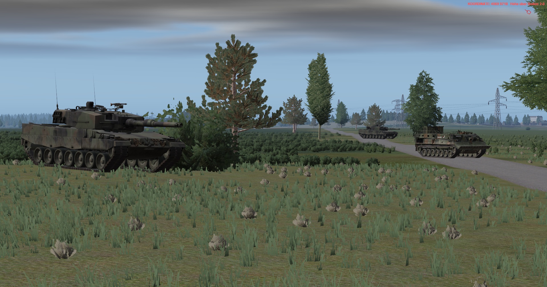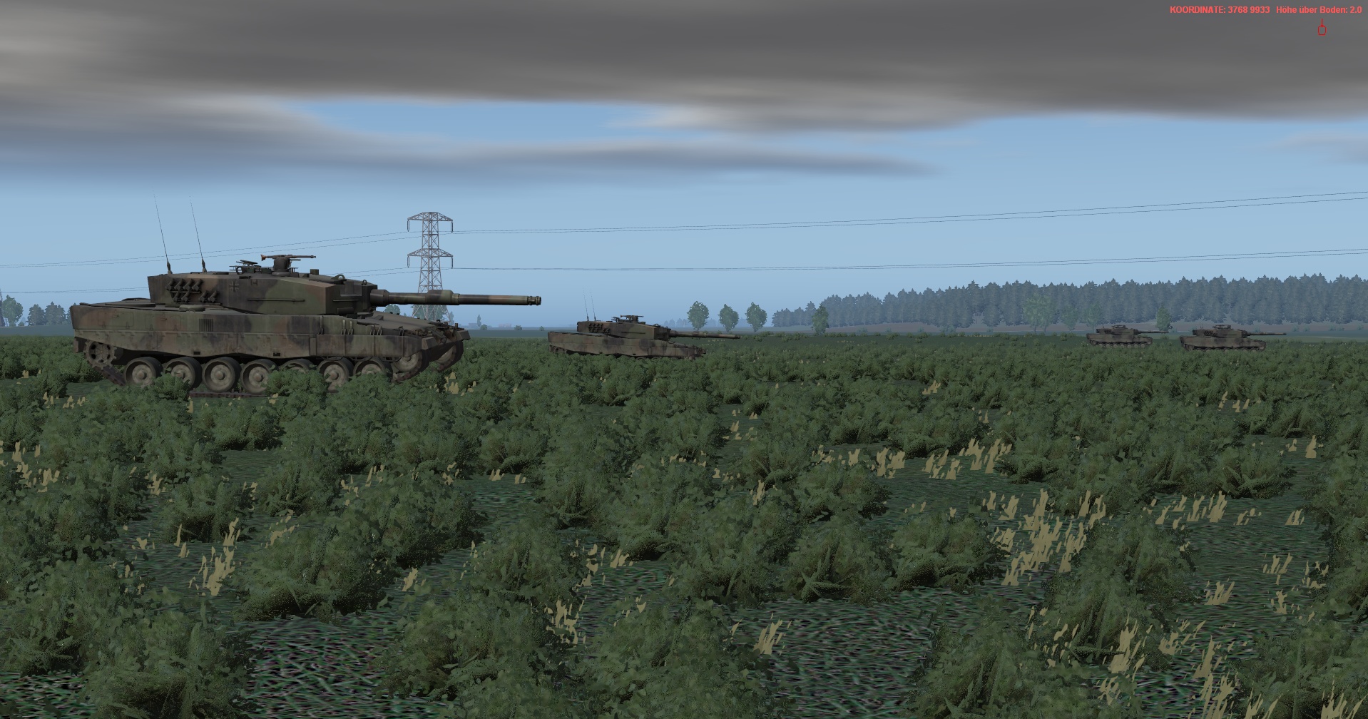 6 spielbare Leopard 2A4, die alle nicht mehr 100% aufmunitioniert sind oder sogar teilweise bereits (zufällig) leichte Schäden haben. Einer der Leos, an der rechten Btls-Grenze, hat ja zu Anfang bereits einen Kettenschaden und wird vom KI-BergeTrp automatisch abgeschleppt. Der BergeTrp wird später dann spielbar, sobald dieser den bewegungsunfähigen Leo ins VVD geschleppt hat.