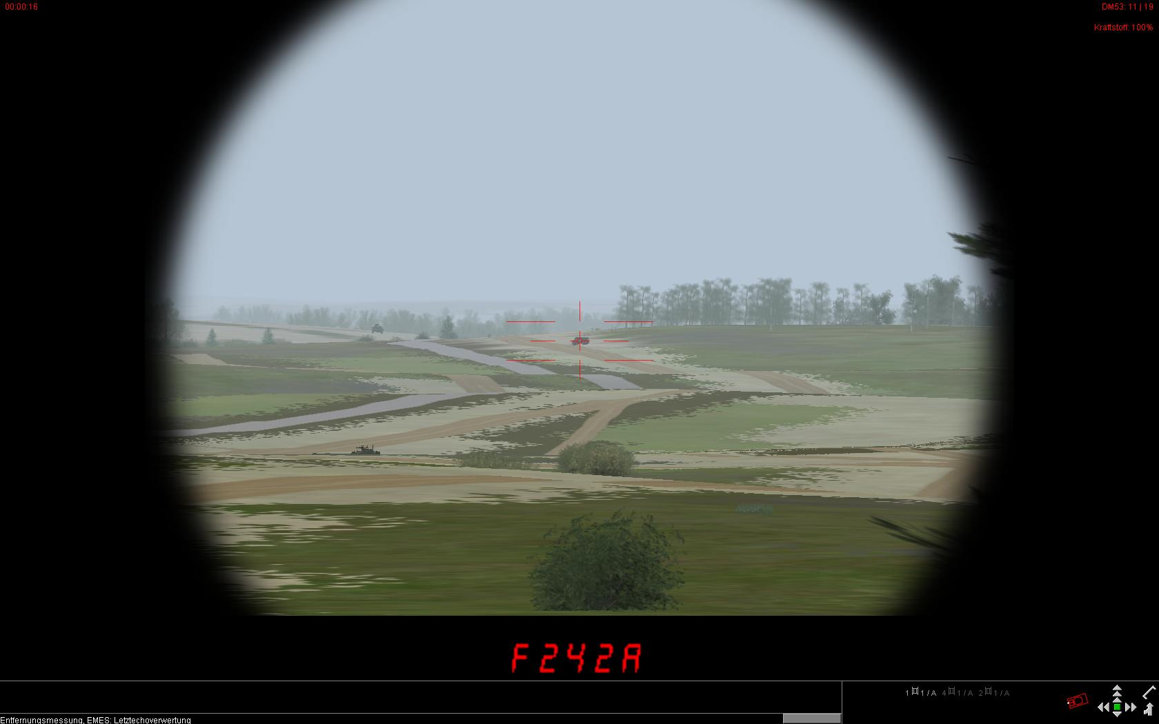 Direkt nach dem Schuss sofort in die F2-Sicht wechseln (sofern kein Kdt auf euerm Fahrzeug sitzt), um den Treffer auszuwerten. Dabei ist das Fadenkreuz, durch das einstellen vom TZF, weit unten vom Zielobjekt, was natürlich nicht schlimm ist. Falls ihr minimal am Ziel vorbei geschossen habt, könnt ihr in der F2-Ansicht bleiben und das Fadenkreuz (wirklich-)minimal verändern und dann erneut feuern. Ansonsten an der TZF-Einstellung nochmal rangehen.