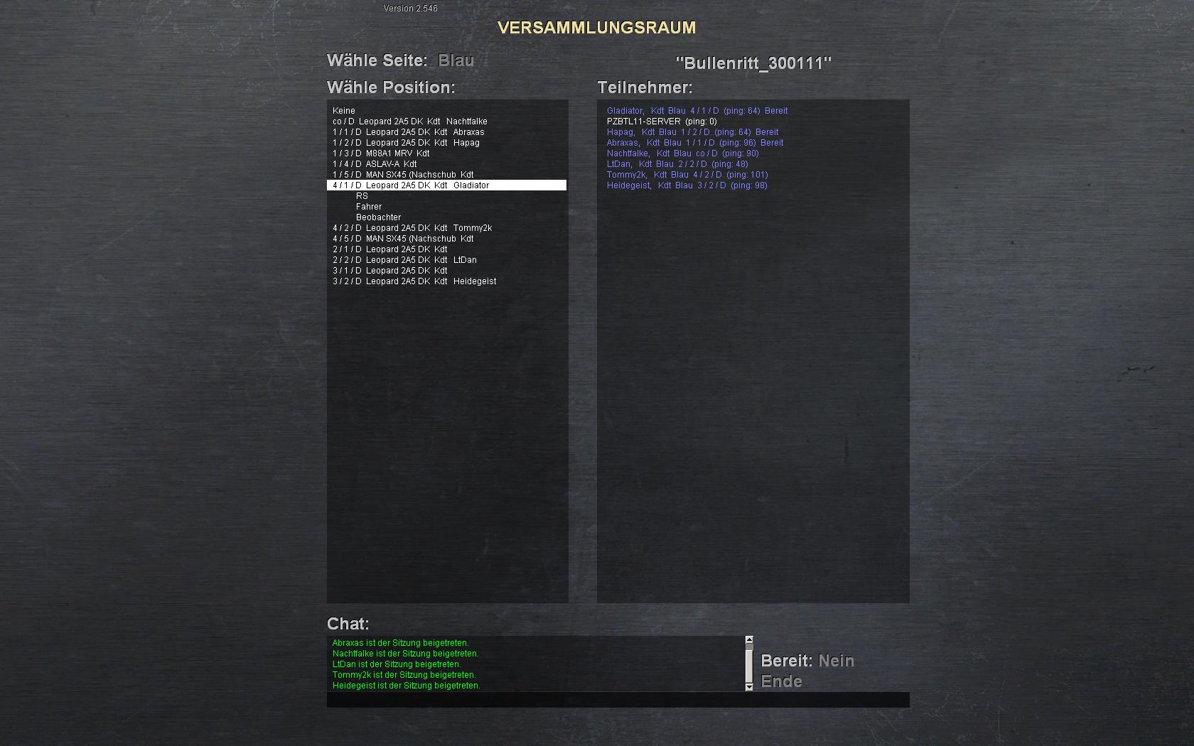 Auftrag für Blau/Rot (Angriff oder Verteidigung) kommt bei Einsatzbeginn. Dann erscheinen auch die dazugehörigen Gefechtsfahrzeuge.Anfangs hat BLAU & ROT einen Leo2A5 Zug (+Co & Xo), einen FlaPz Halbzug, 1 Drohne (auf Abruf), sowie diverse Versorgungsfahrzeuge zur Verfügung.