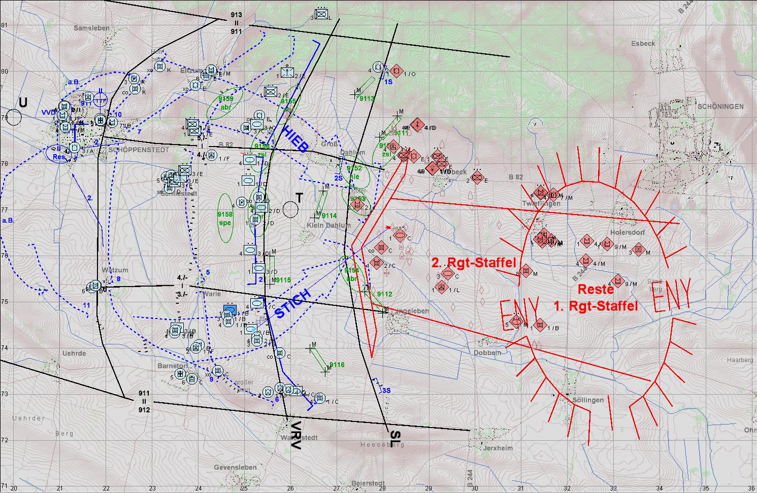 Es fängt mit einer PzKp +/- (Leo2A5, M2A2) und einer gemPzAufklKp (ASLAV, Centauro) an. Nach ca. 90 min trifft BtlFüGrp und eine PzKp ein und nach 120 min eine PzGrenKp +/-. Zusätzlich steht nach einiger Zeit auf Abruf ein Schwarm UH-TIGER bereit, dem man Aufträge erteilen kann. Das Ganze spielt ostwärts HÜNFELD.