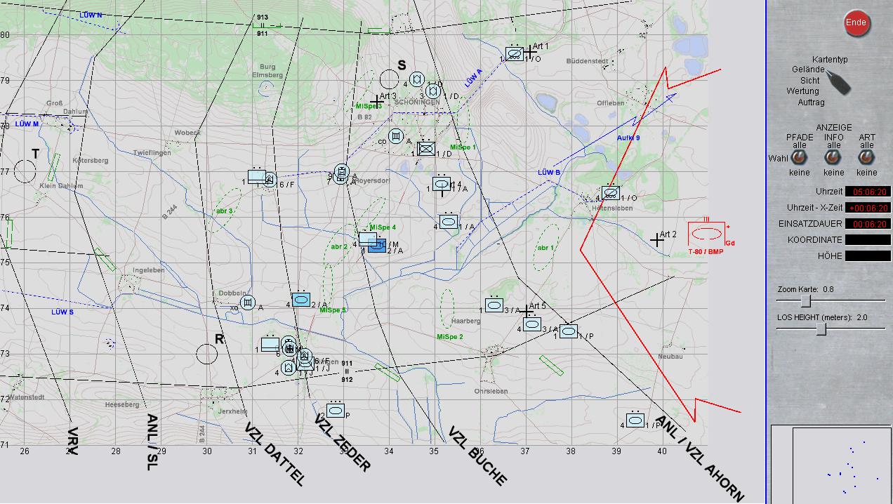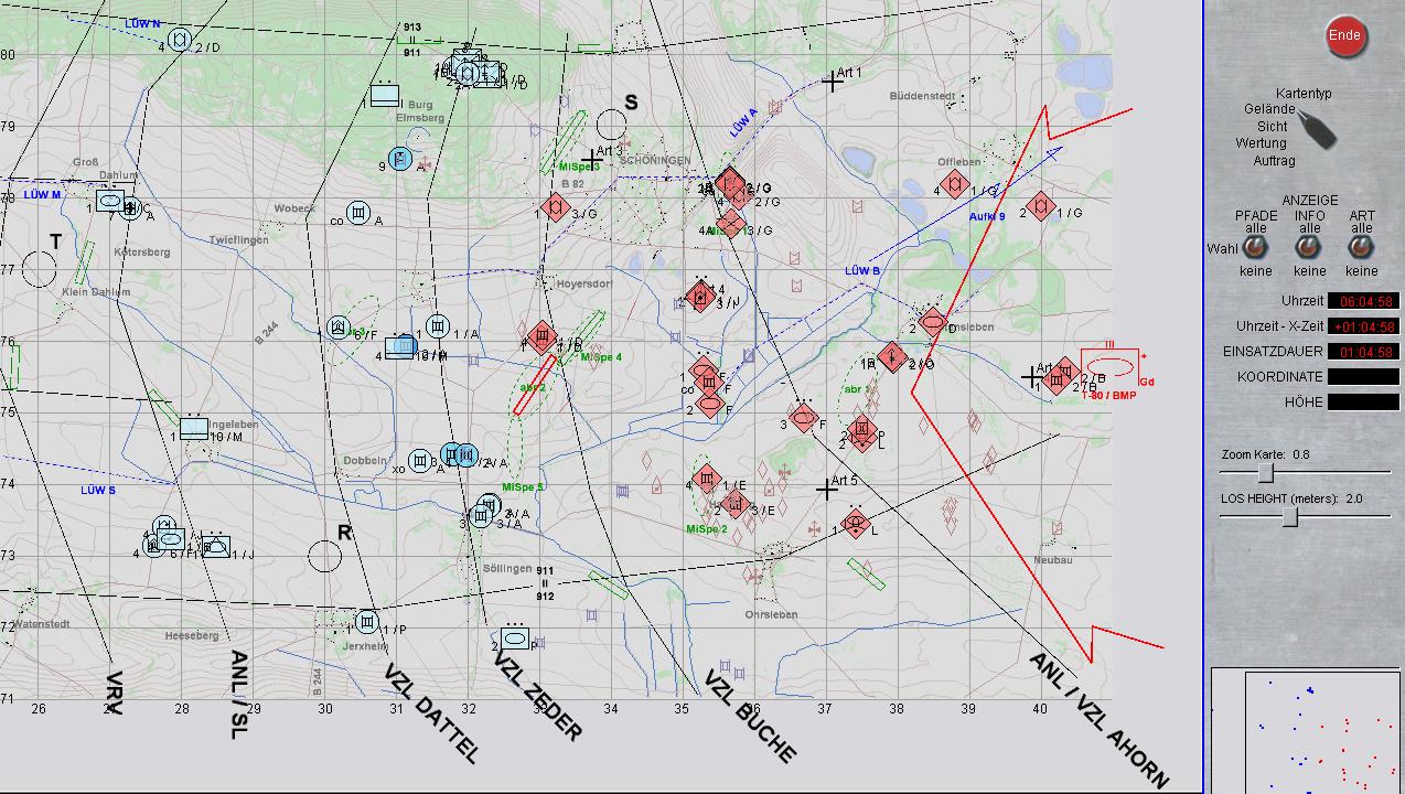 ROT im Angriff aus Osten mit Spitze bei OSCHERSLEBEN (15km südostw SCHÖNINGEN); erkannt ein vstk PzRgt (T-80 / BMP) in 1. DivStaffel.