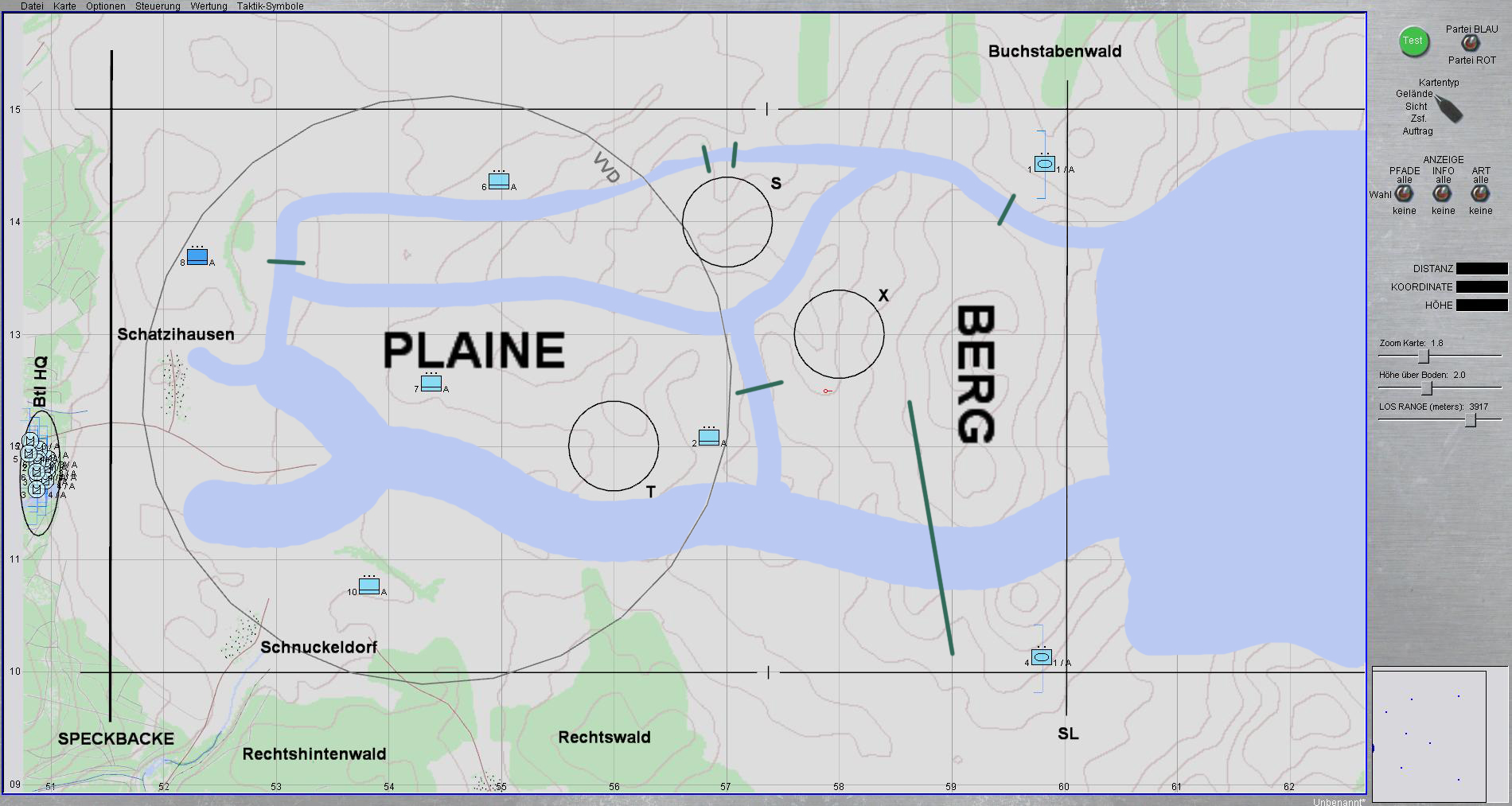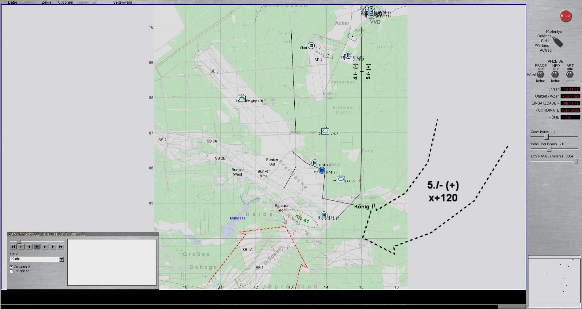 Nach Meldung, dass bei 3 Panzern Sperrbestände erreicht wurden, entschloss ich mich dazu, in den Wald bis Höhe Blautannenbahn auszuweichen, dort unter Eigensicherung umladen zu lassen und dann mit Gefechtsaufklärung voraus erneut auf Linie KÖNIG anzutreten und verbliebene Restteile auszuschalten.