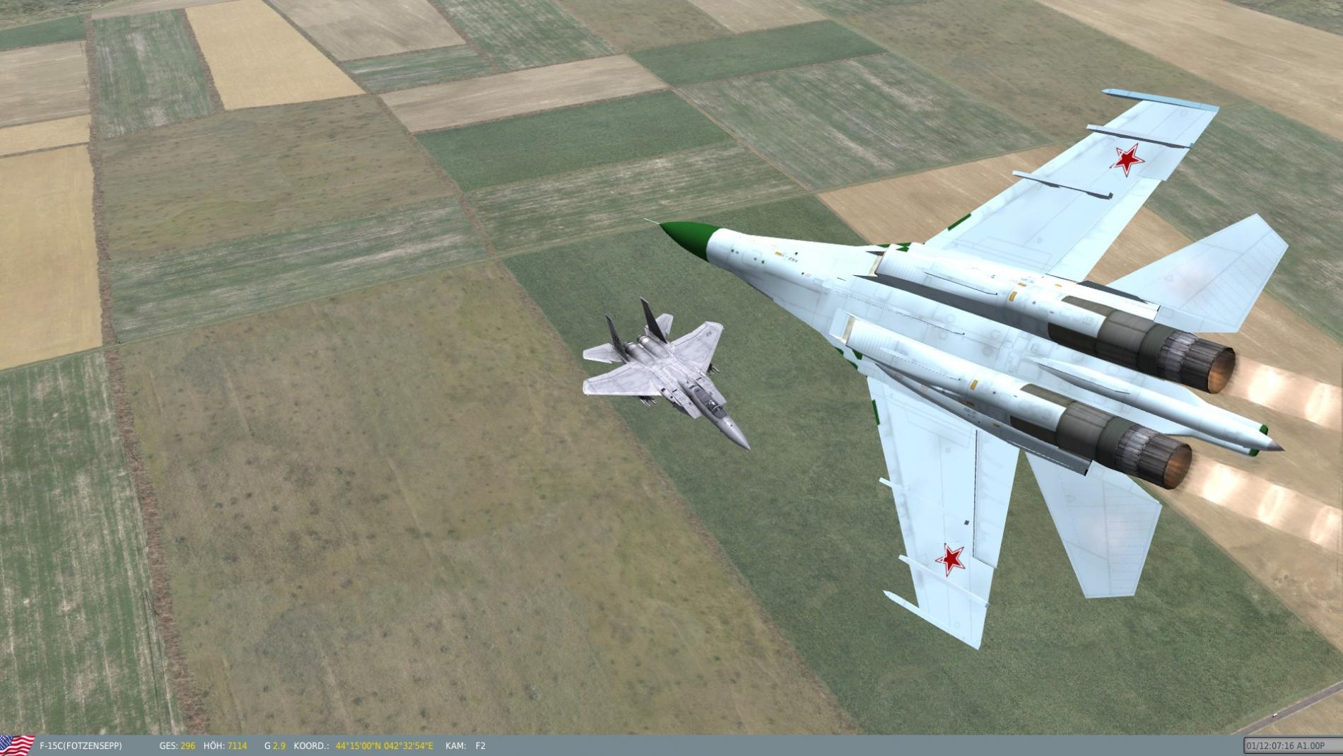 Gegner war eine nicht ganz einfache, russische SU-30 Flanker-C.Nachdem ich 4 gegnerischen AA-10 Alamo Raketen ausweichen konnte, wars Zeit für den eigenen Angriff und das übliche Gekurbel