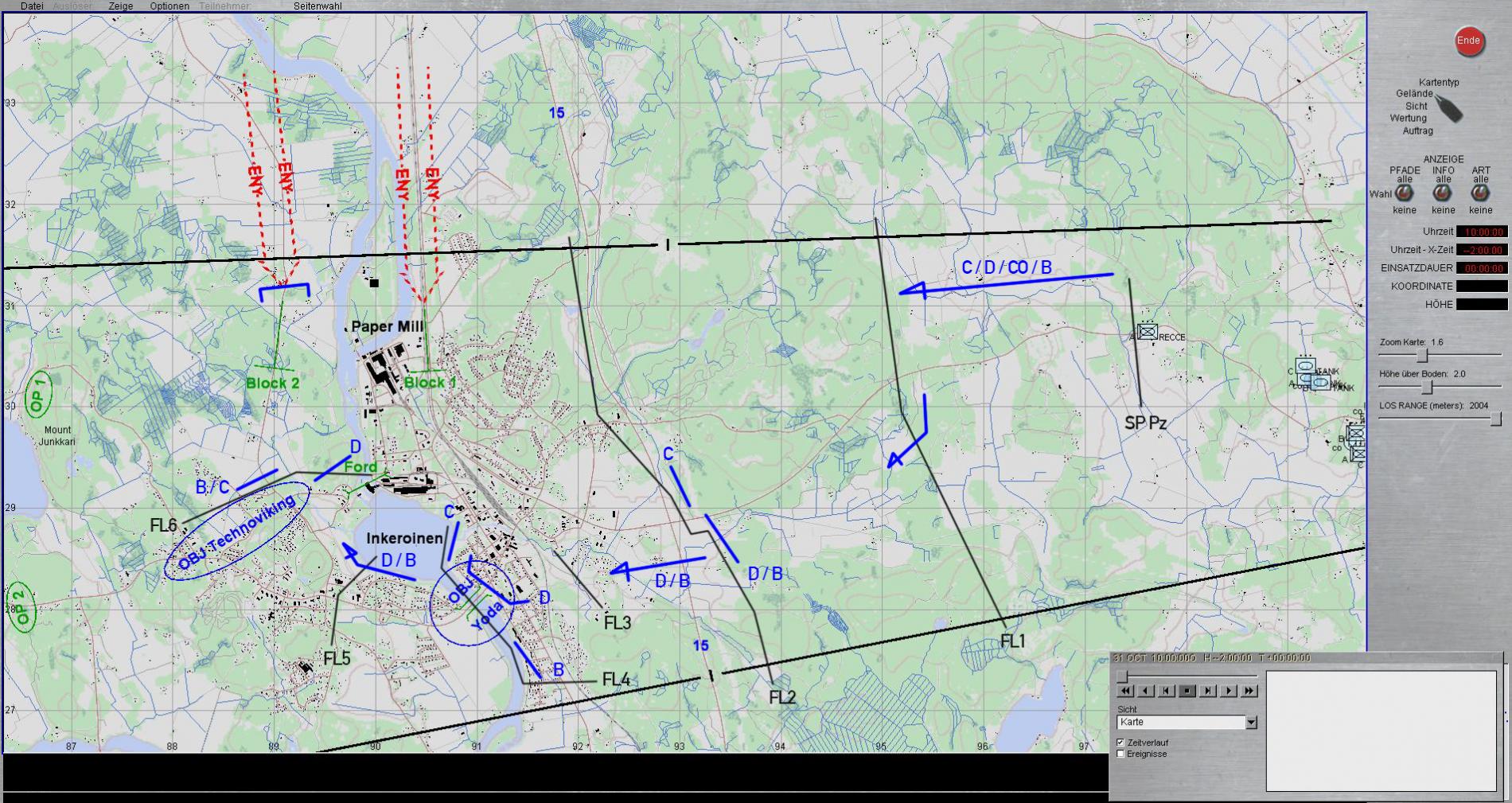Diesem Zug galt vorerst meine Aufmerksamkeit, als es um das weitere Antreten auf FL4 ging. Hierbei sollte INKEROINEN genommen und mit dem Brückenübergang gesichert werden, damit - über unsere Sicherungsstellungen hinweg - die mech. Kp MOOSE antreten und am westl. Ufer des Flusses einen Brückenkopf freikämpfen und sichern konnte. Die Brigade-Artillerie schoss sich auf die feindl. Panzer ein, aber schlüssige Wirkungsmeldungen kamen nicht durch. Es musste davon ausgegangen werden, dass die Panzer funktionstüchtig in ihren Stellungen warteten. Der C Zug hatte nun die schwierige Aufgabe, durch urbanes Gelände ohne entsprechende Aufklärungsergebnisse und ohne infanteristische Unterstützung, der Kp voraus in die Stadt einzurücken und Stellungen zu beziehen, um die aufgeklärten Pz unter Beschuss zu nehmen und zu vernichten.Trotz schlimmer Befürchtungen meinerseits, klappte dieser Vorgang ohne Schwierigkeiten, 2 feindl. T-80 wurden eindeutig zerstört in ihren Stellungen aufgeklärt (vermutlich durch Artillerievolltreffer).