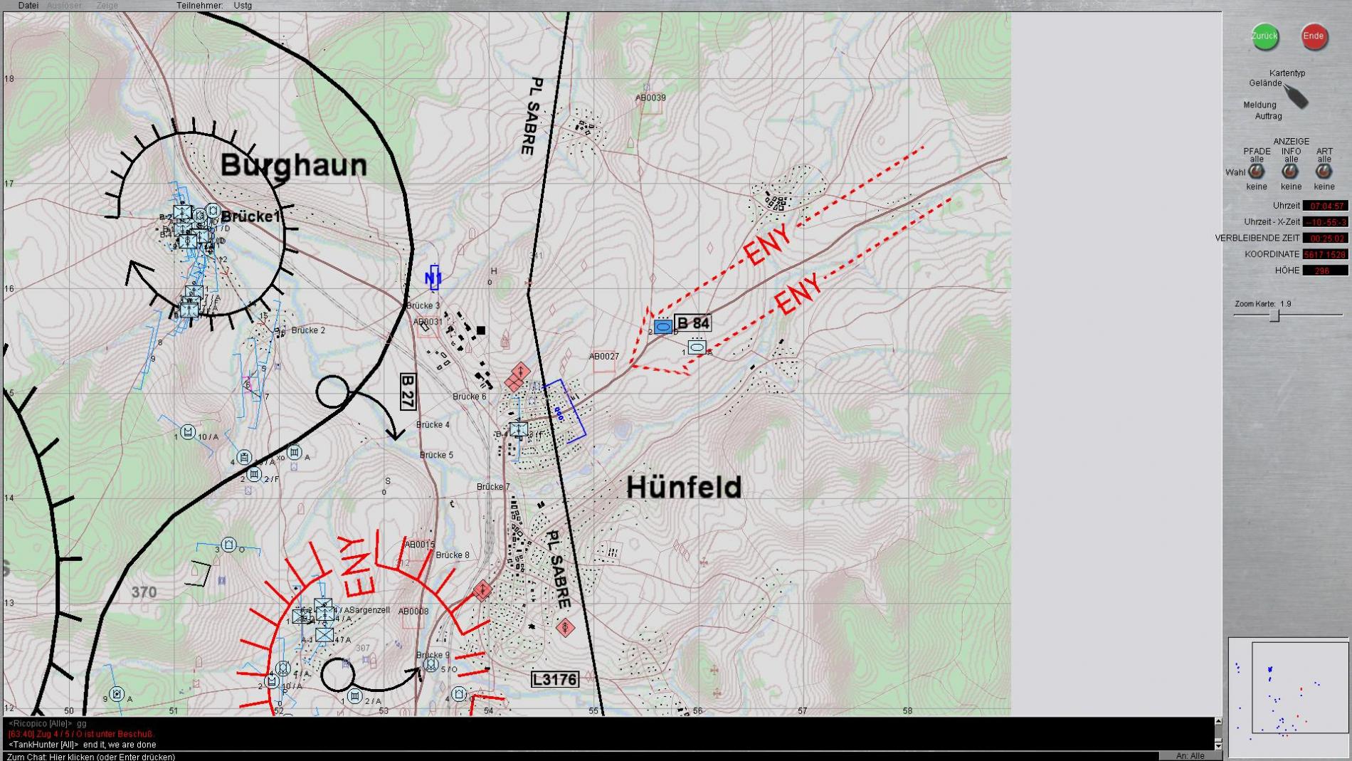 Unsere PzJg und die kleinen Grünlinge haben in Burghaun auch erste Sahne garbeitet. Vom Gefühl her haben die Roten bis zum Schluß nicht unseren Schwerpunkt erkannt, und dadurch so hohe Verluste kassiert ,das wir im Norden eigentlich fast unbehelligt usere Zange zu machen konnten.Ich denke das könnte man als prima Beispiel nehmen für "Frontal binden u.Flankierend schlagen".